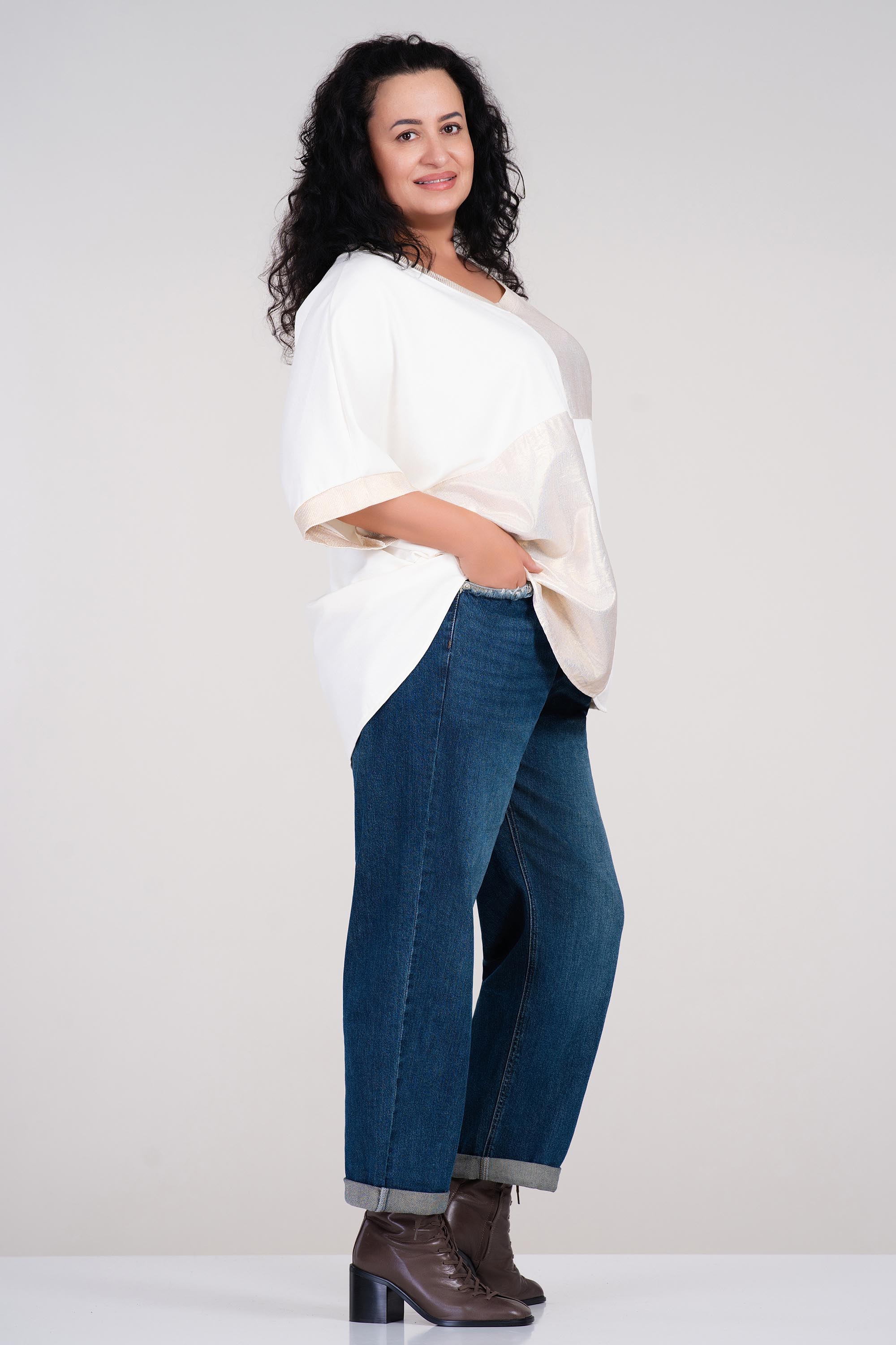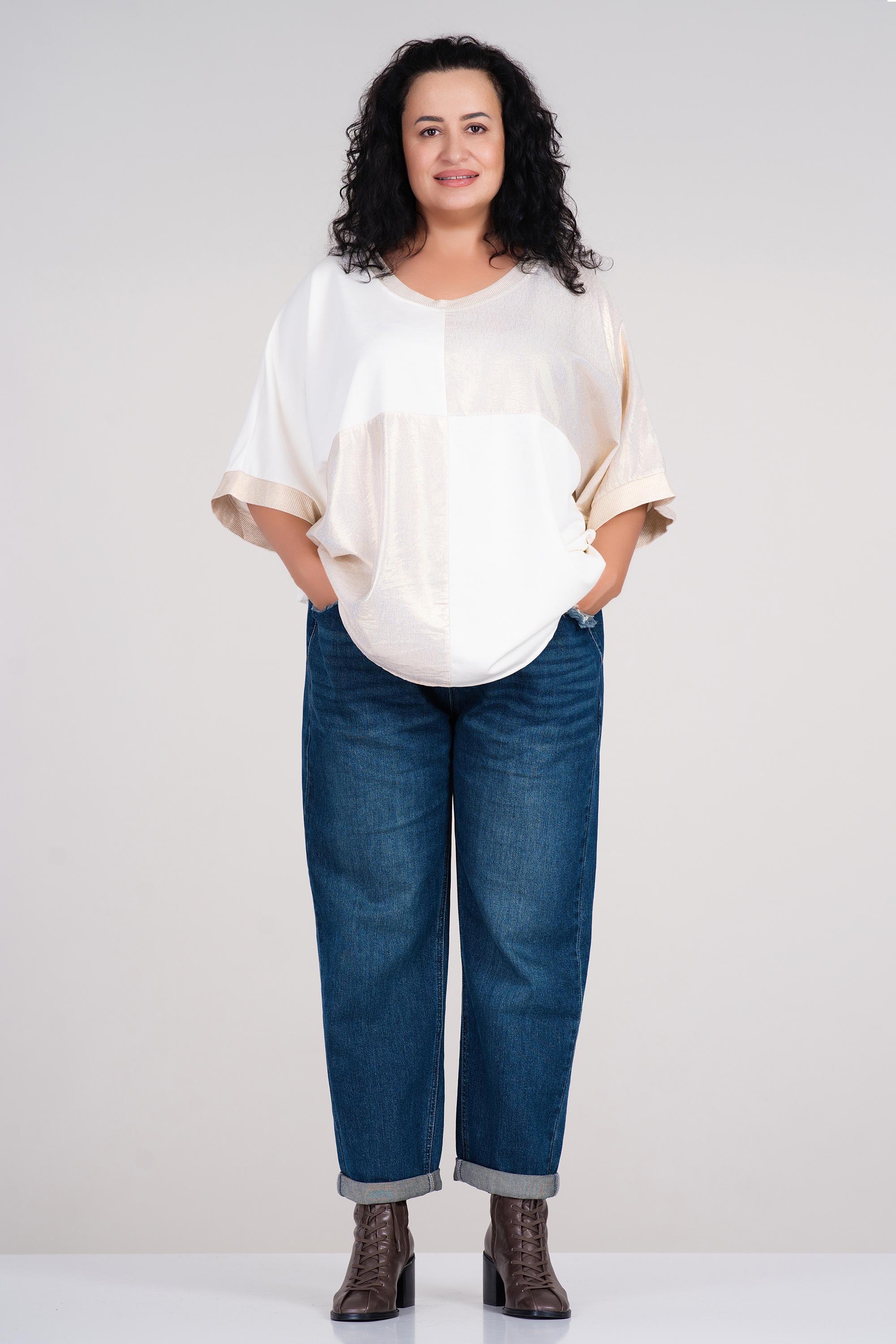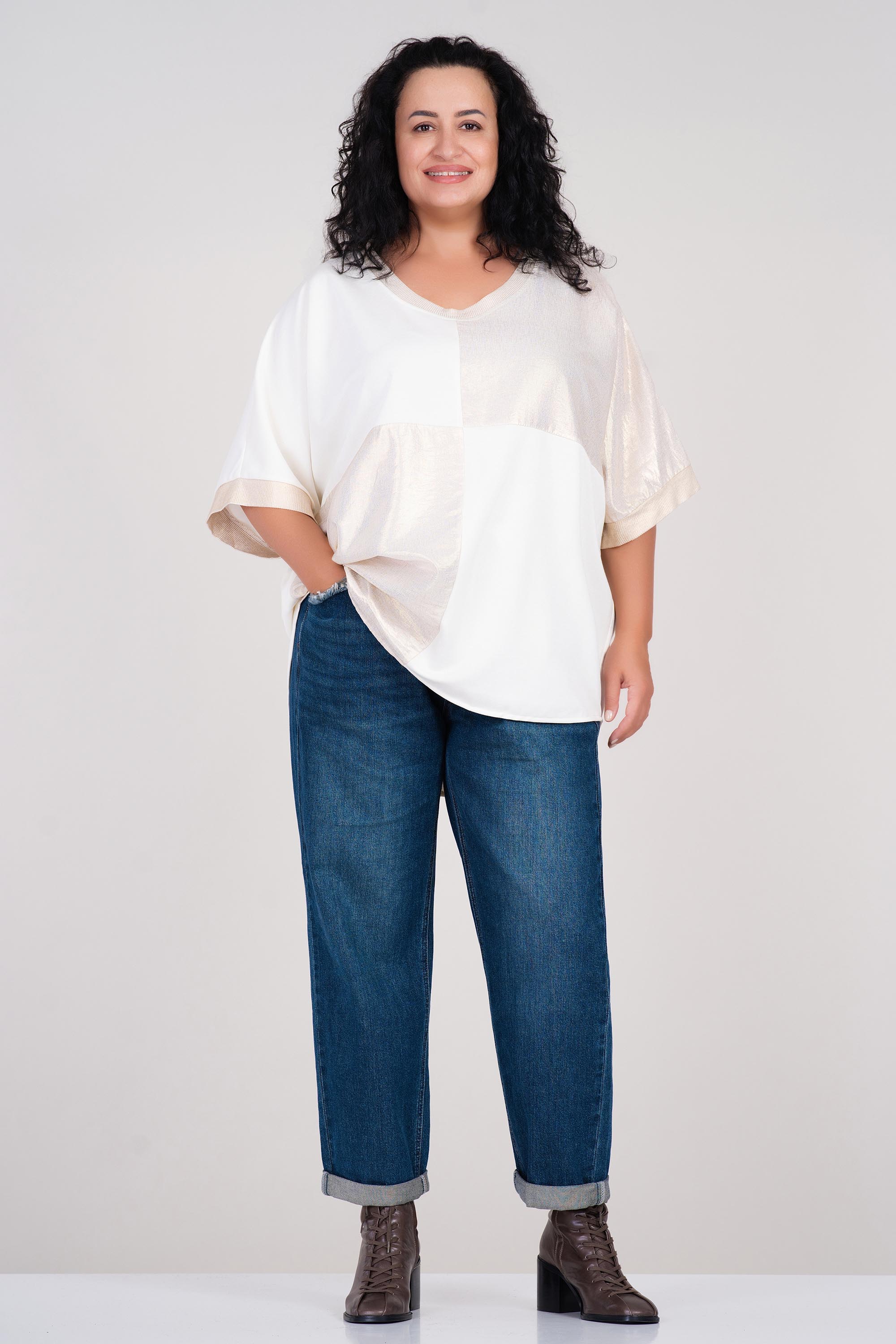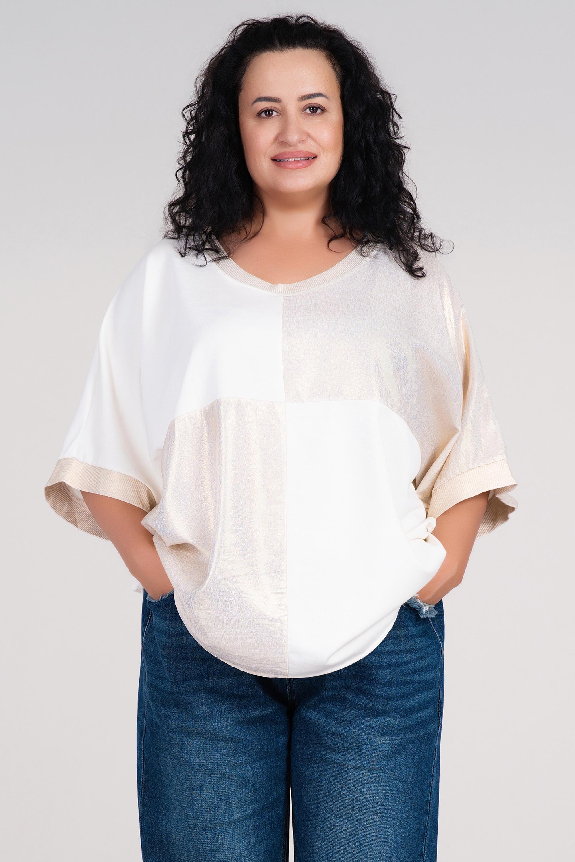 Макси блуза в цвят екрю с обло деколте и златисти акценти