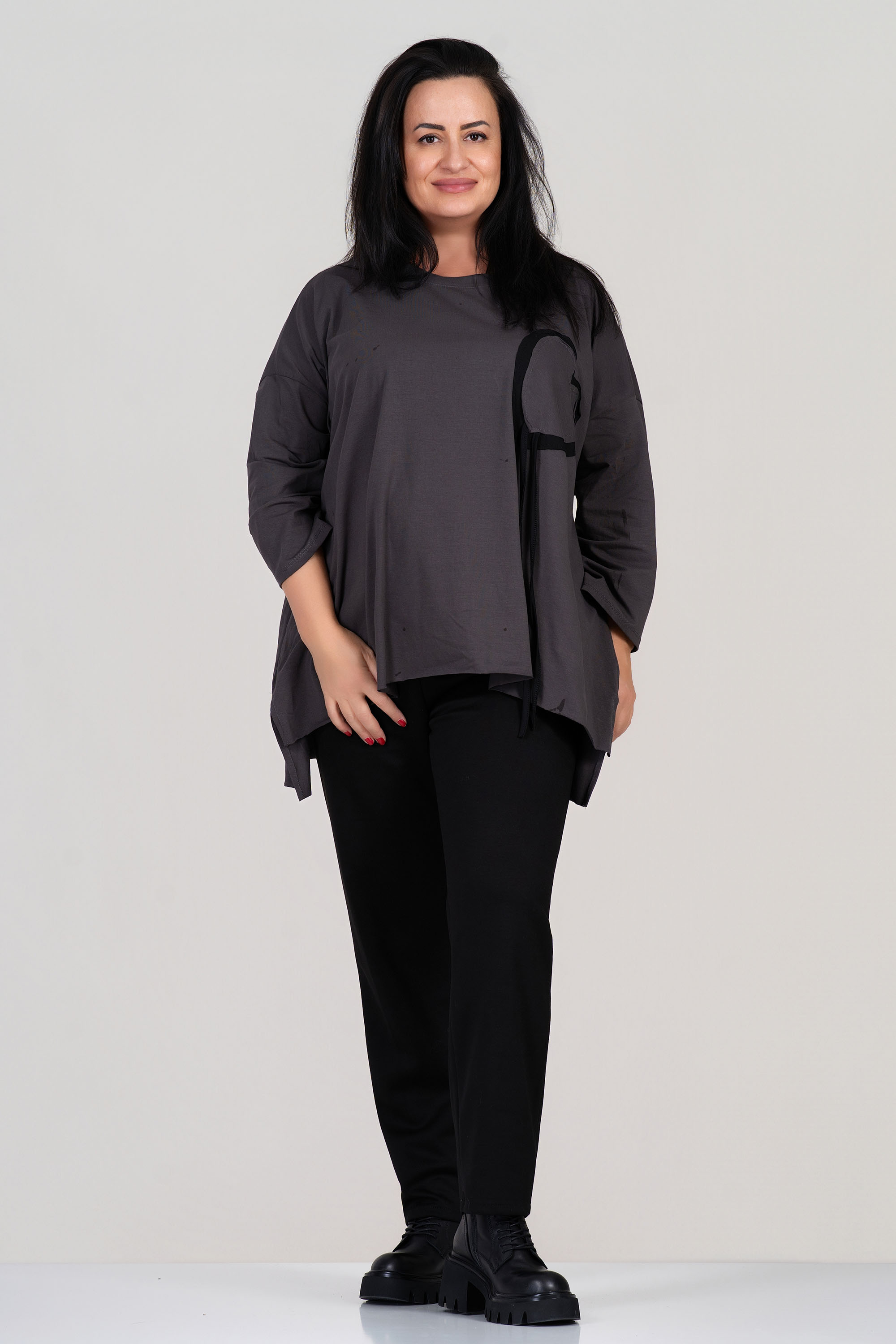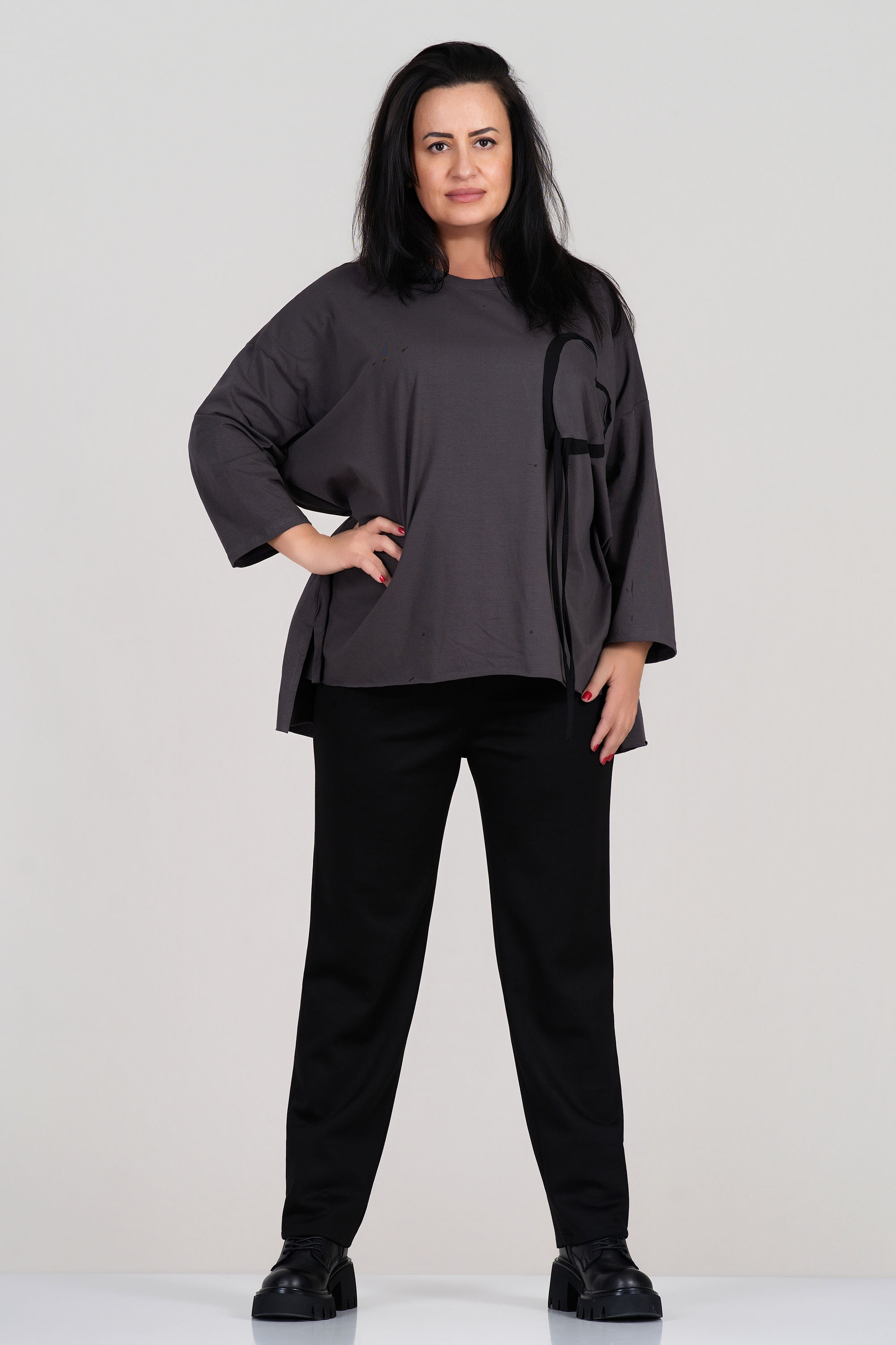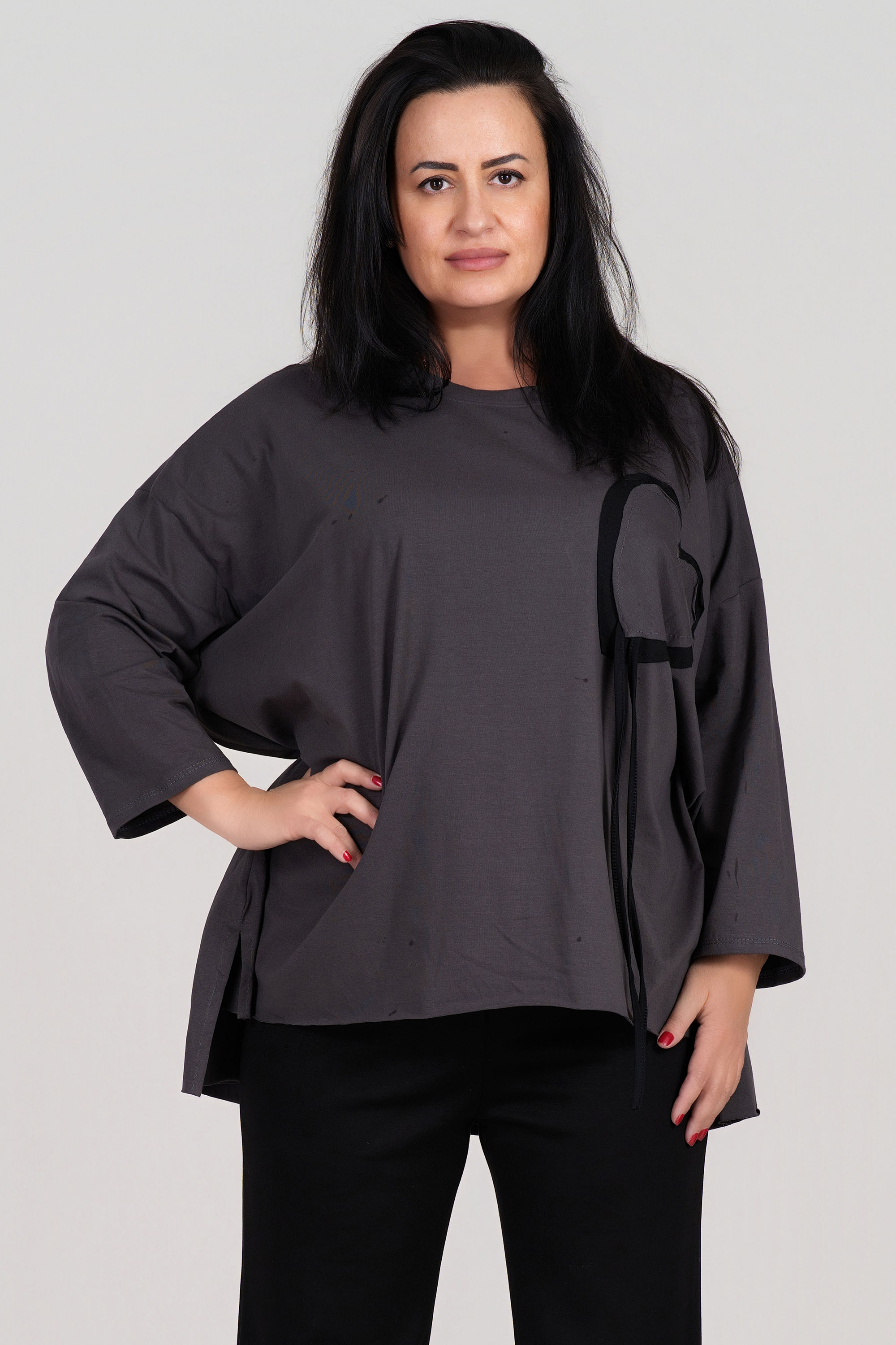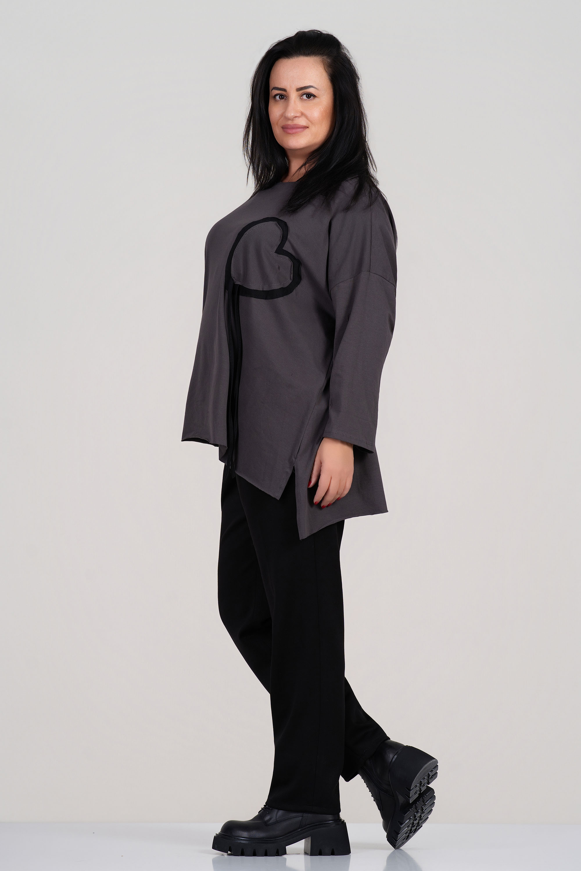 Комфортна макси блуза от меко еластично трико в сив нюанс. Декорирана е с фино бродирано сърце и връзки, които добавят женствен акцент. Моделът е с обло деколте и свободна линия, осигуряваща лекота и удобство при движение. Идеален избор за ежедневна визия с нотка на елегантност.