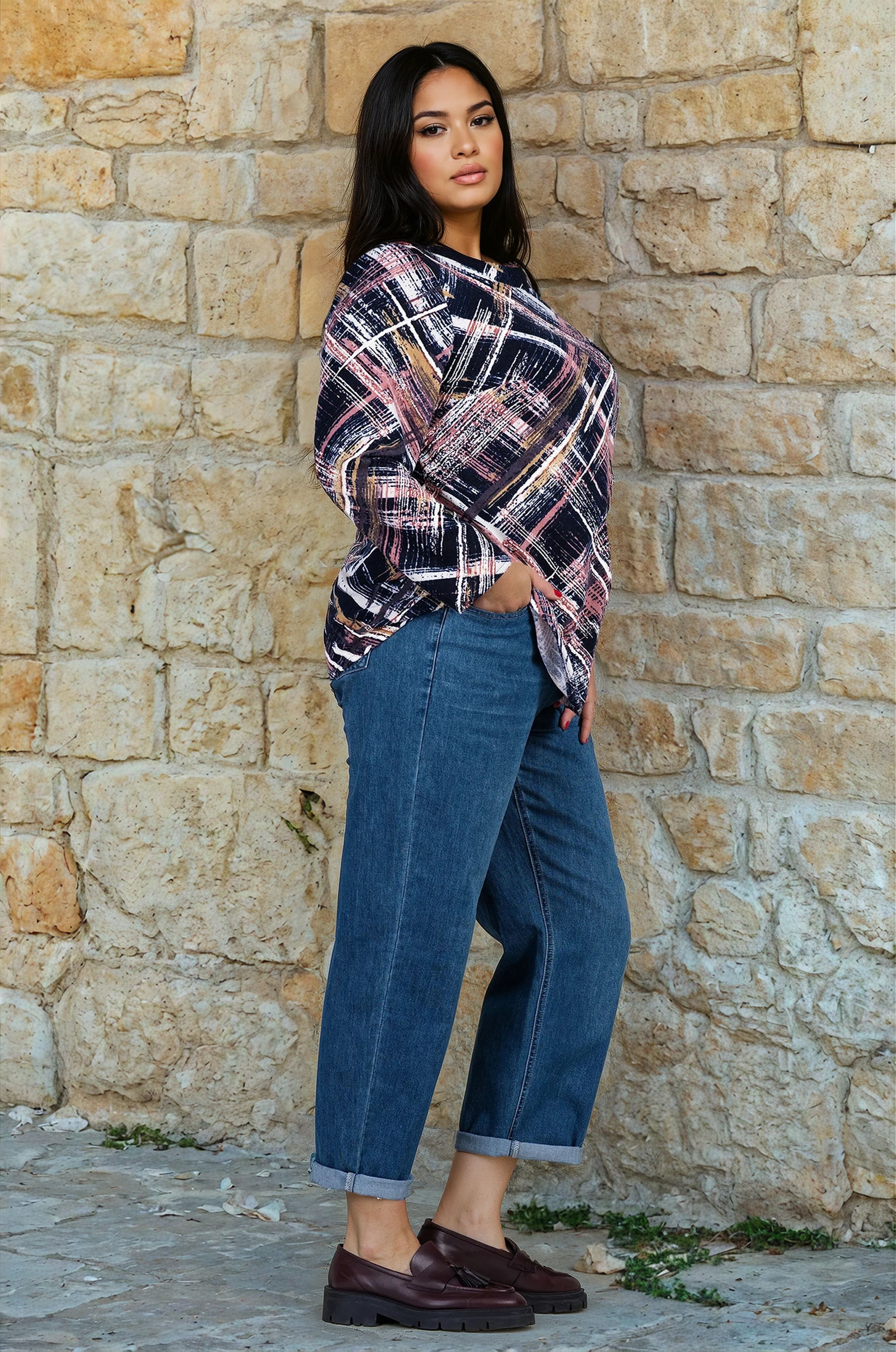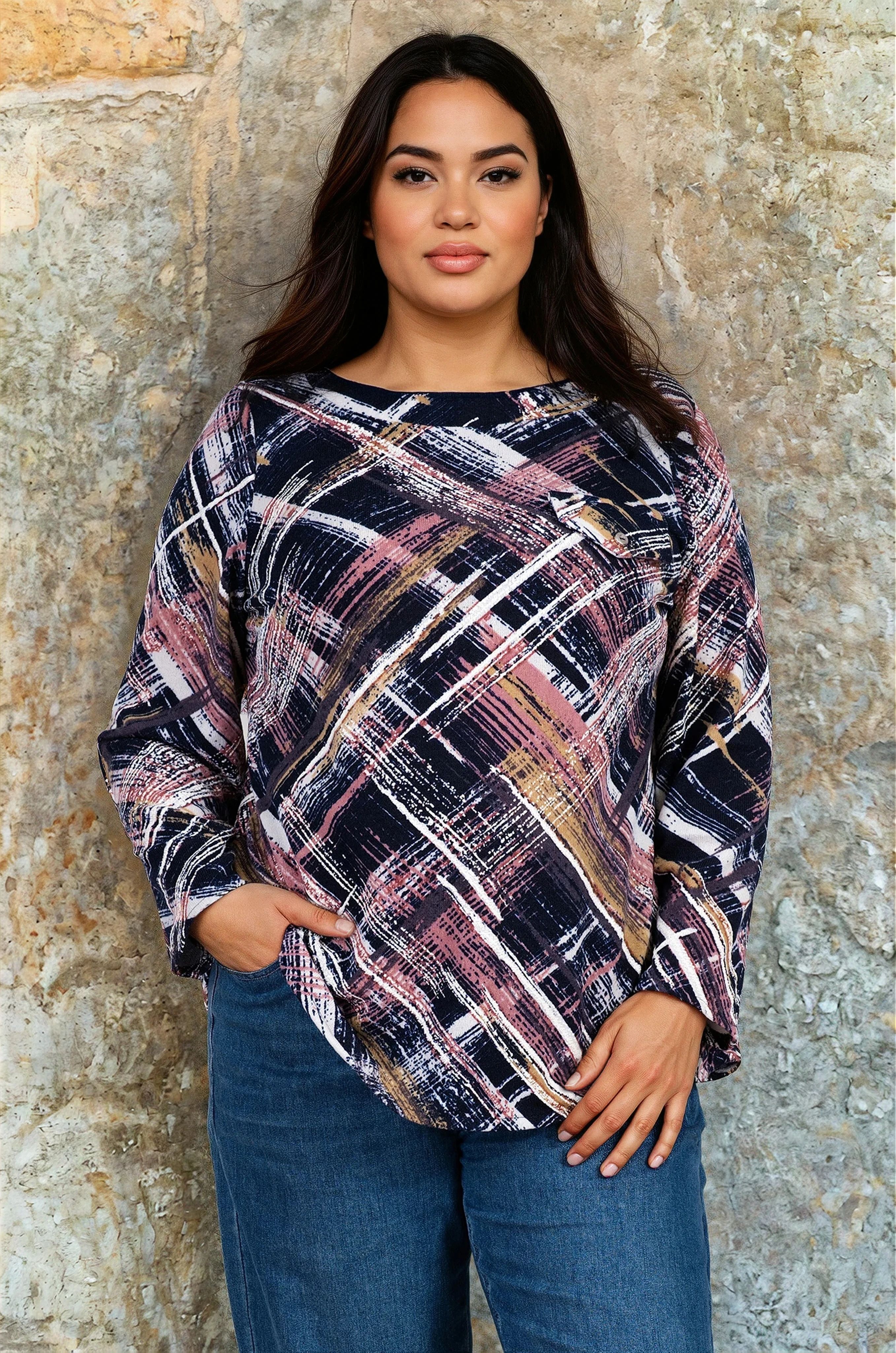 Тази модерна макси блуза впечатлява с уникалния си дизайн и стилен цветови контраст. Изработена от мека и комфортна материя, тя осигурява приятно усещане върху кожата и свобода на движение, което я прави чудесен избор за всеки ден. Дизайнът се отличава с абстрактен геометричен принт в нюанси на бордо, горчица, тъмносиньо и бяло, които се преплитат в динамичен и артистичен модел. Кройката е свободна, подходяща за всякакъв тип фигура, като подчертава линията на тялото с лекота. Облото деколте и дългите ръкави придават класически вид, а малкият декоративен джоб отпред добавя модерен акцент. Блузата се комбинира лесно с дънки, панталони или пола, което я прави универсално попълнение в гардероба на всяка дама. Подходяща е както за ежедневието, така и за по-елегантни поводи, когато искате да изглеждате стилно и уверено.