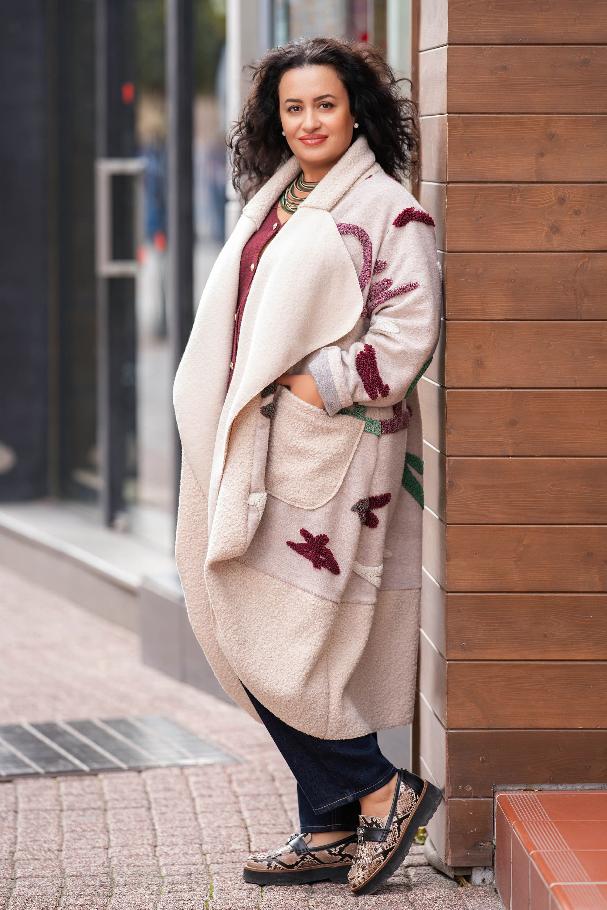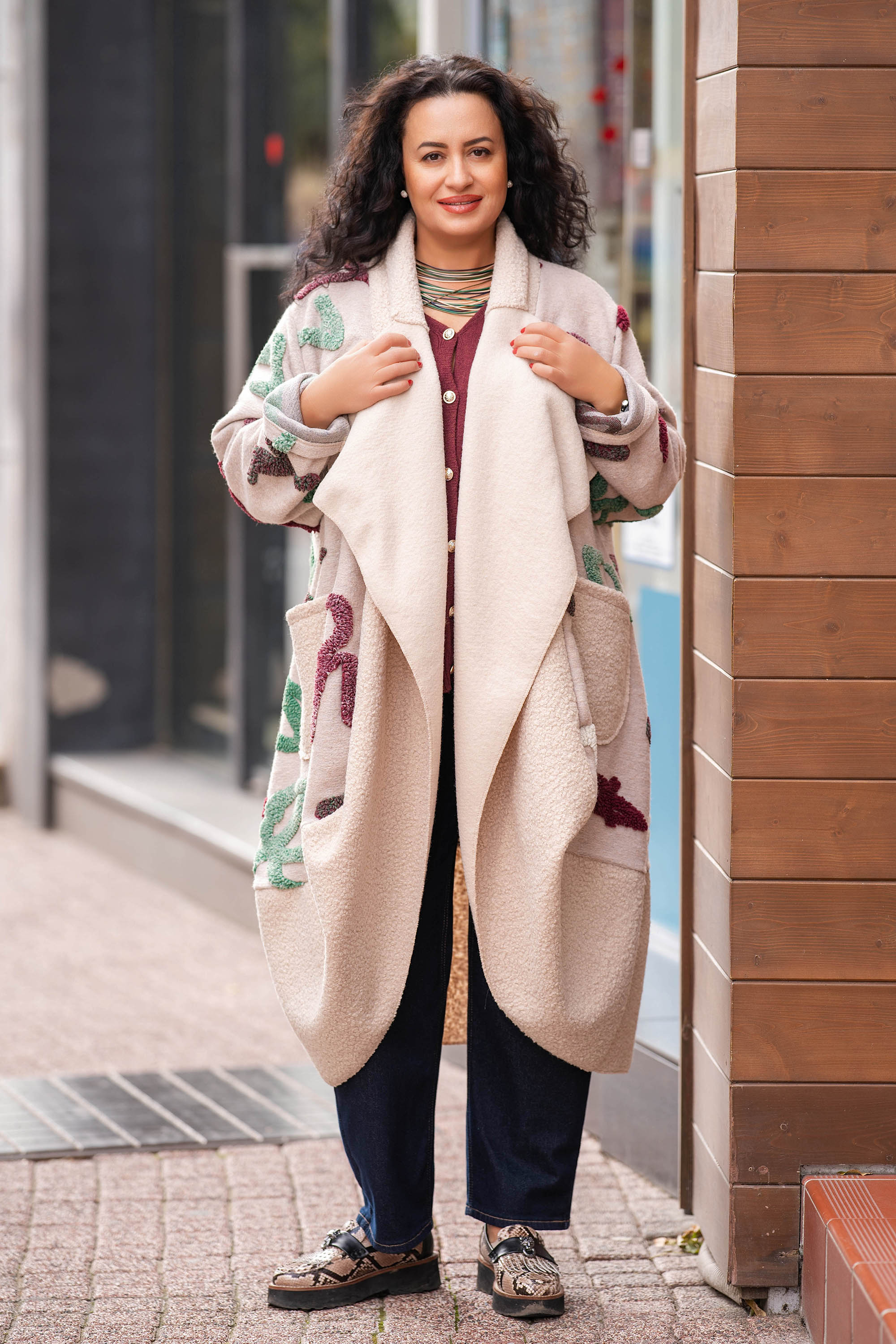Модерно макси палто в лимитирана серия с вълна. Изработено е от мека материя в основен цвят бежово, която създава усещане за топлина и комфорт. Кройката е свободна, без закопчаване, в типичен оувърсайз стил, което го прави универсално и подходящо за различни фигури. Палтото е с широка свободно падаща яка, която придава елегантен и женствен завършек. Дължината е миди, осигуряваща добра защита в по-хладни дни. Моделът е апликиран с цветни абстрактни букви, които придават артистичен и свеж акцент върху светлата основа. В предната част има големи джобове, добавящи практичност и удобство. Това палто е чудесен избор за градска визия, комбинира се лесно с панталони, рокли или поли и е подходящо както за ежедневието, така и за по-специални поводи, когато искаш да изглеждаш стилно, артистично и модерно.