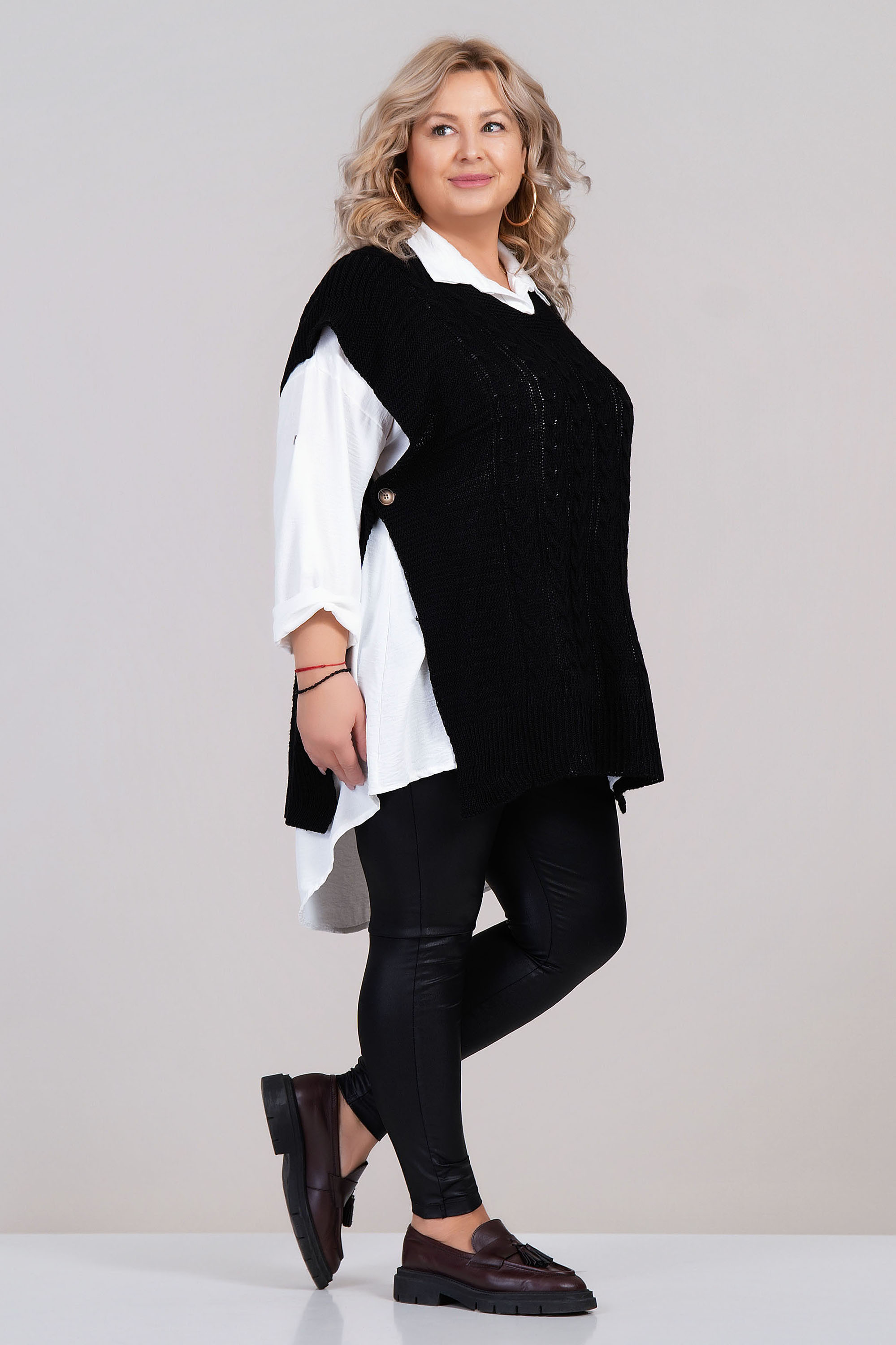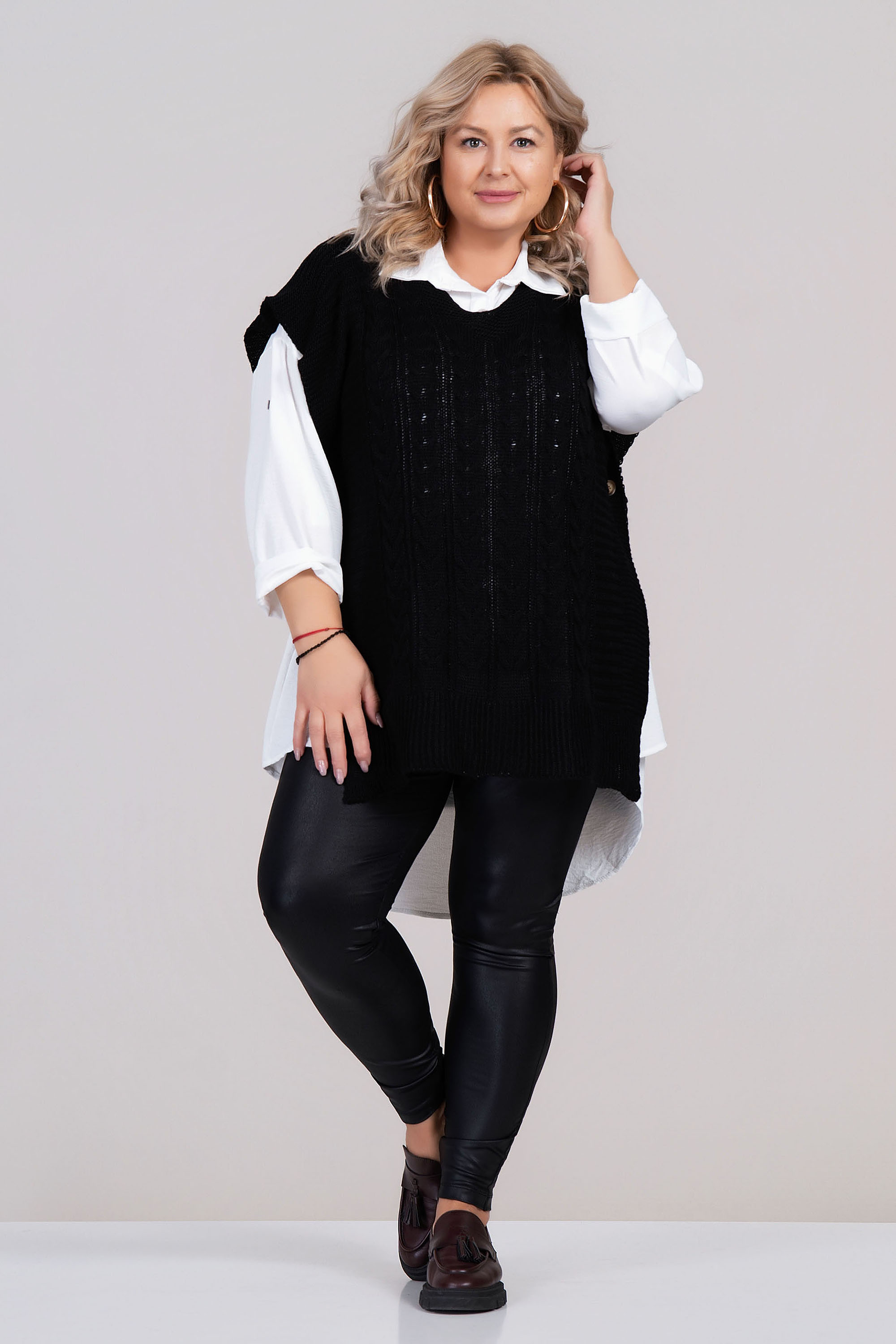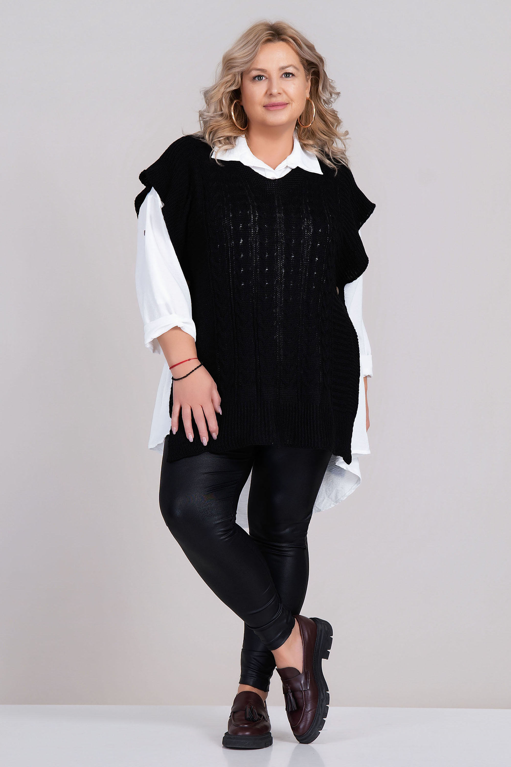 Дизайнерско предложение в две части – класическа риза с дълъг ръкав и контрастен пуловер с плетен релеф. Визията е завършена, без нужда от допълнителен стилов пласт. Черно-бялата комбинация е винаги актуална и лесна за комбиниране.