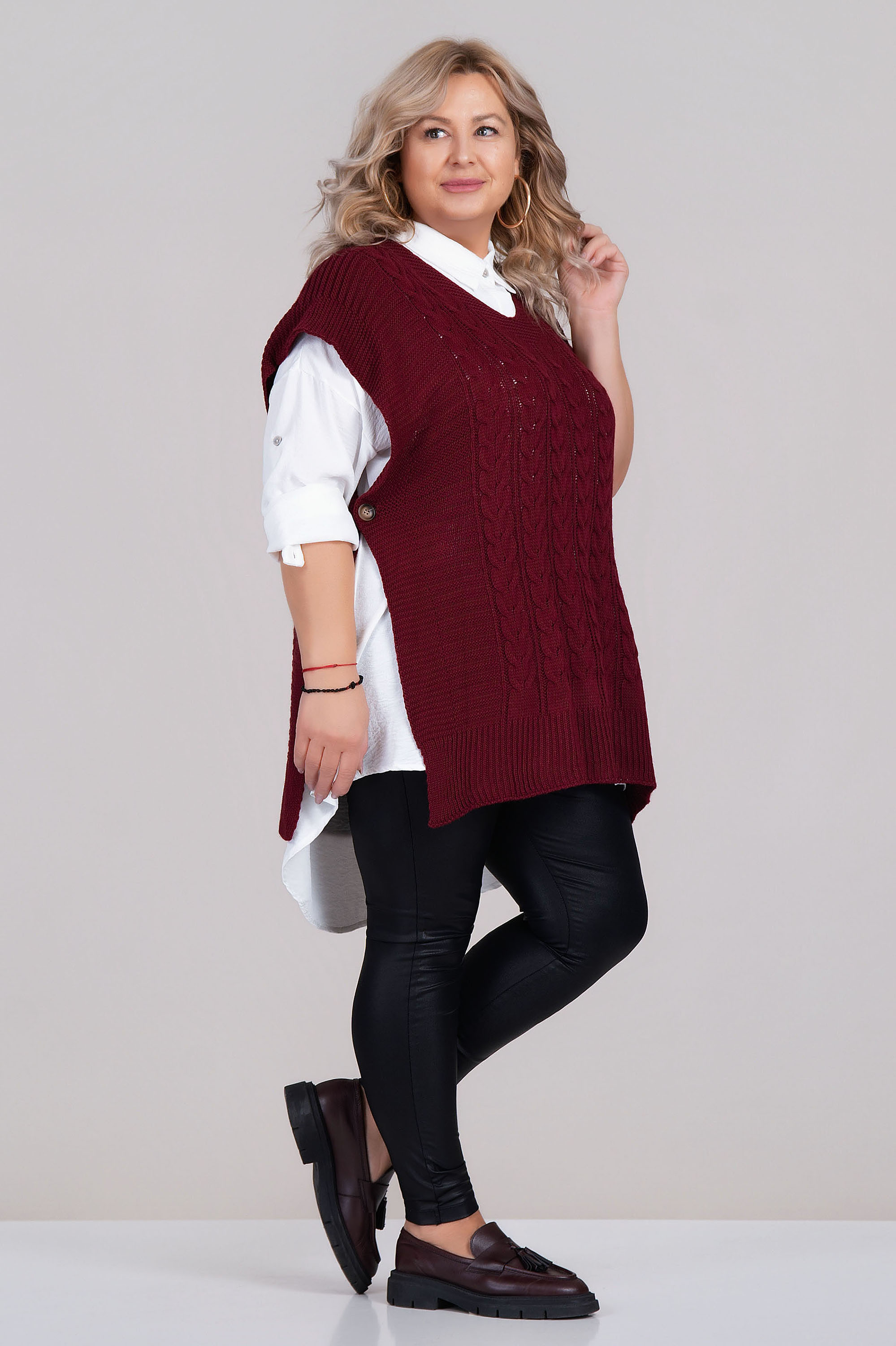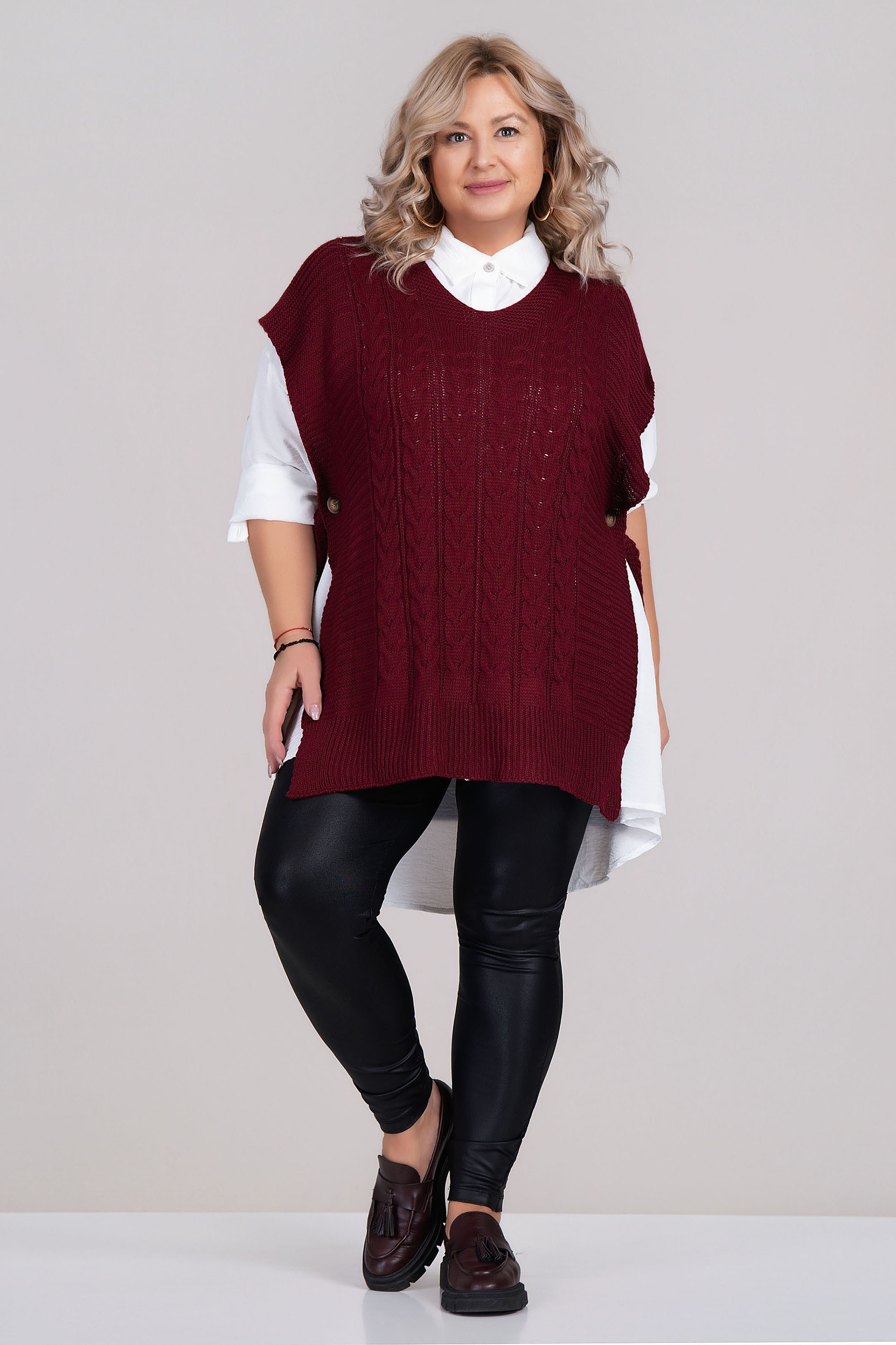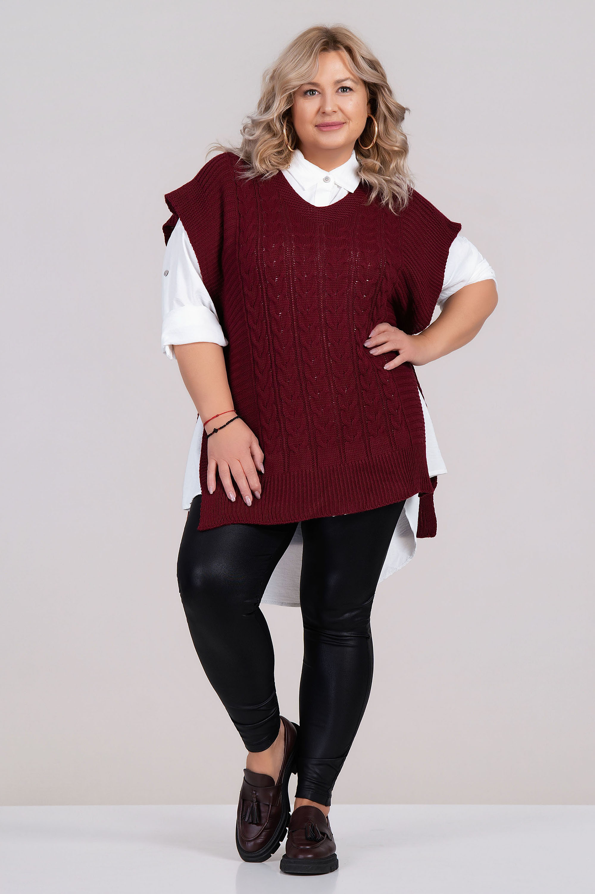 Дизайнерско предложение в две части – класическа риза с дълъг ръкав и контрастен пуловер с плетен релеф. Визията е завършена, без нужда от допълнителен стилов пласт. Червено-бялата комбинация е лесна за комбиниране.