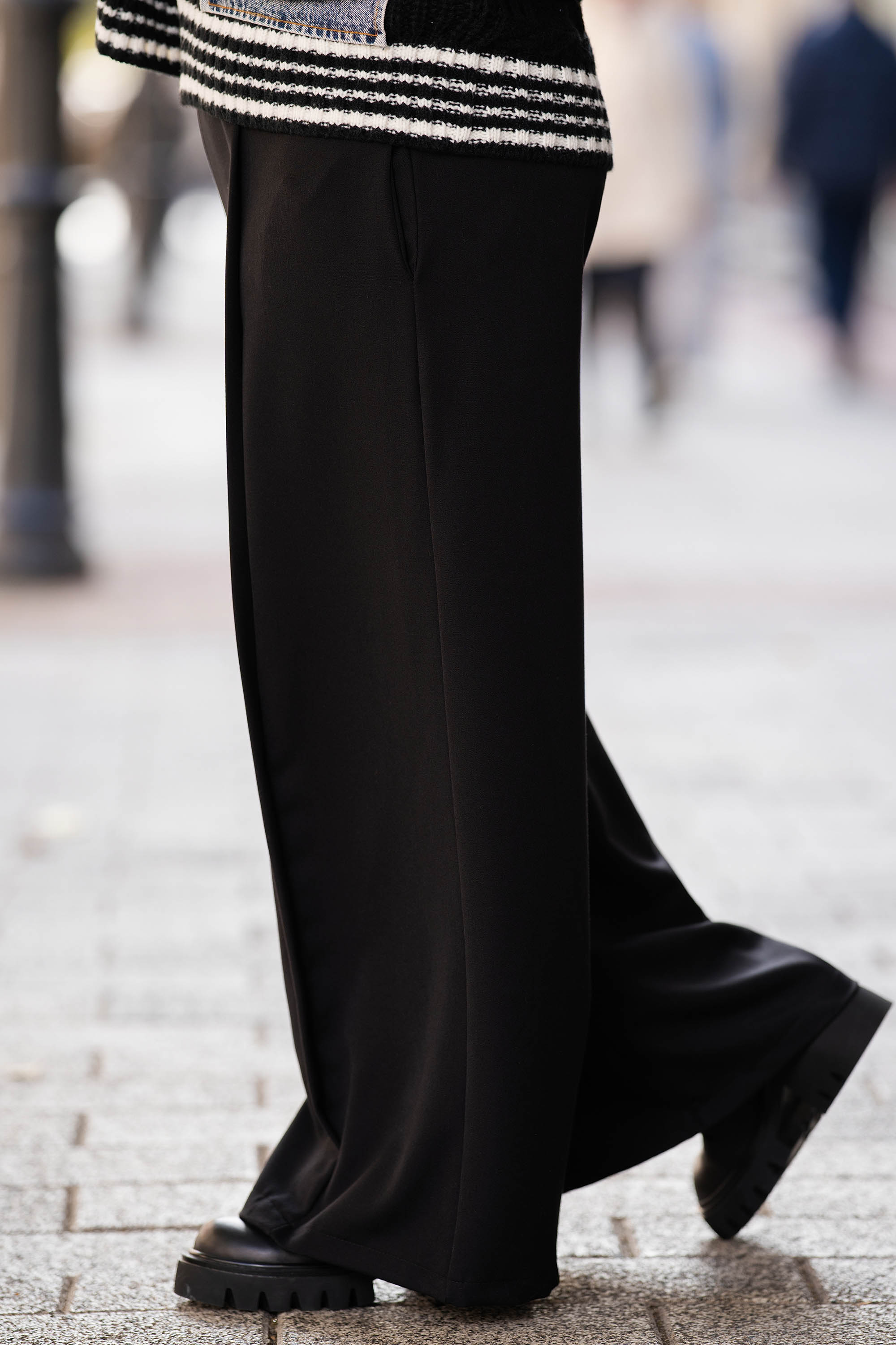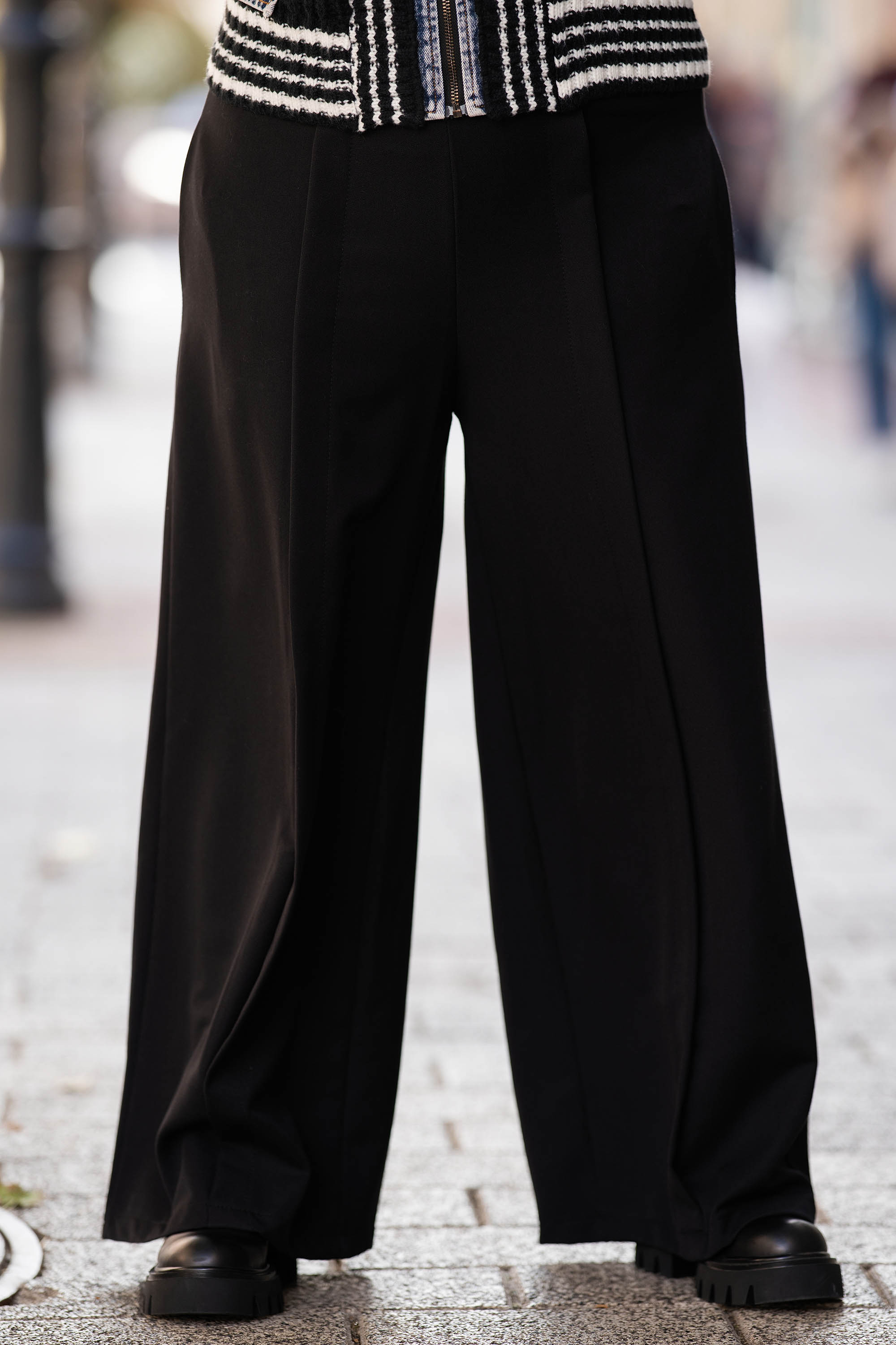 МАКСИ черен панталон с широки крачоли и ръб тип плоха