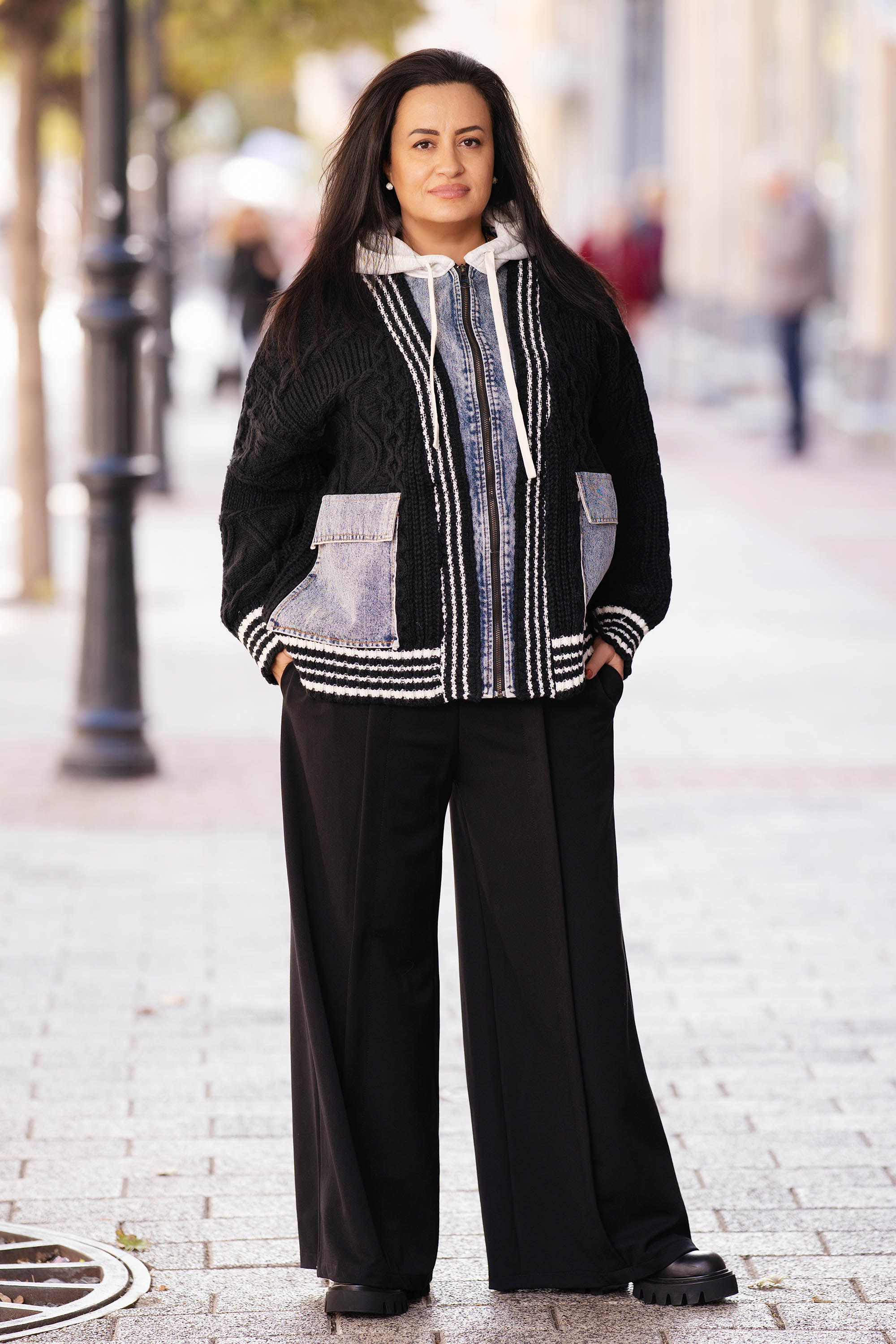 Функционален макси панталон с елегантно падаща линия и широк крачол. Материята е лека и еластична, което го прави подходящ за интензивно ежедневие и различни типове фигура. Черният цвят позволява лесно комбиниране с жилетки, блузи или палта от същата линия.