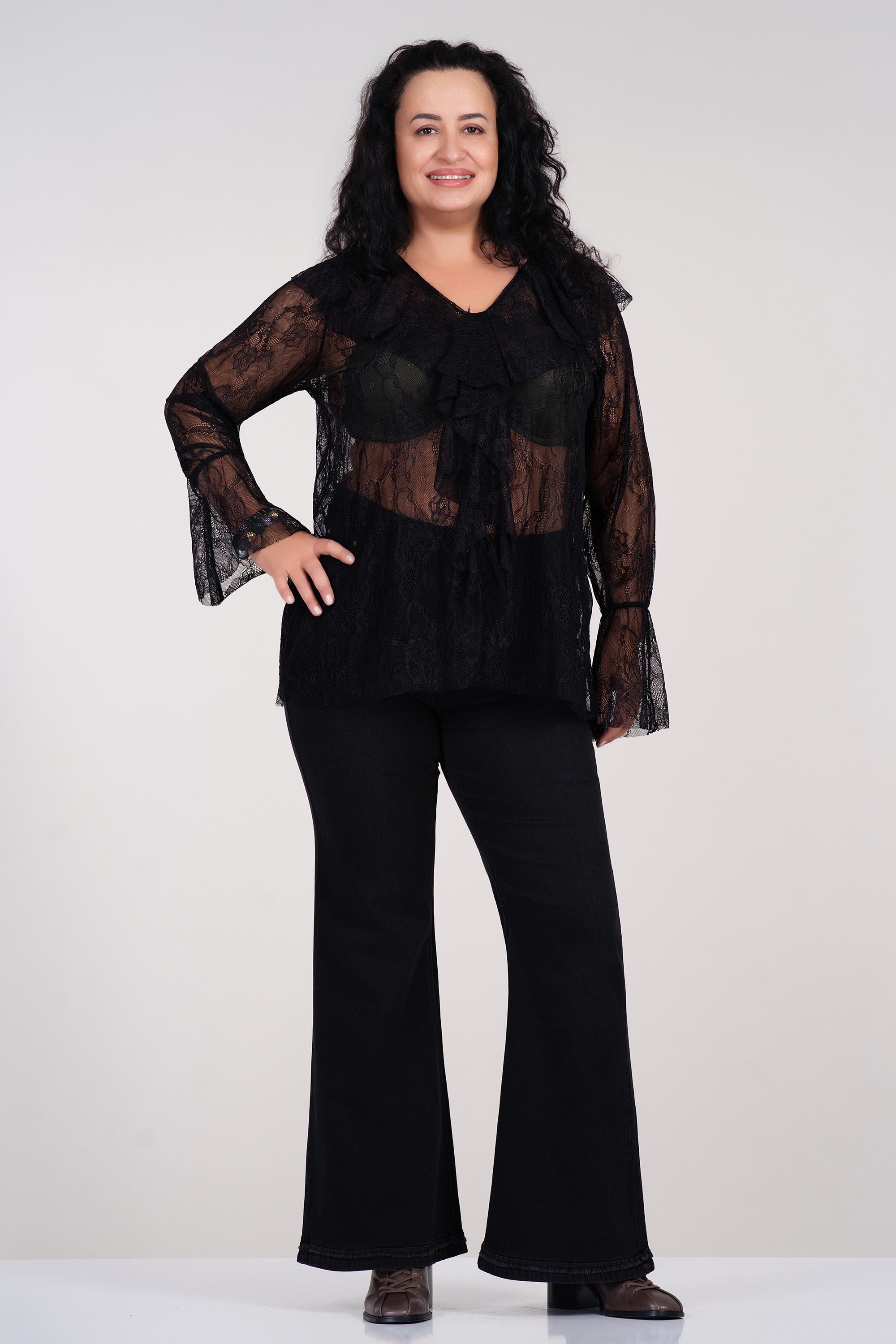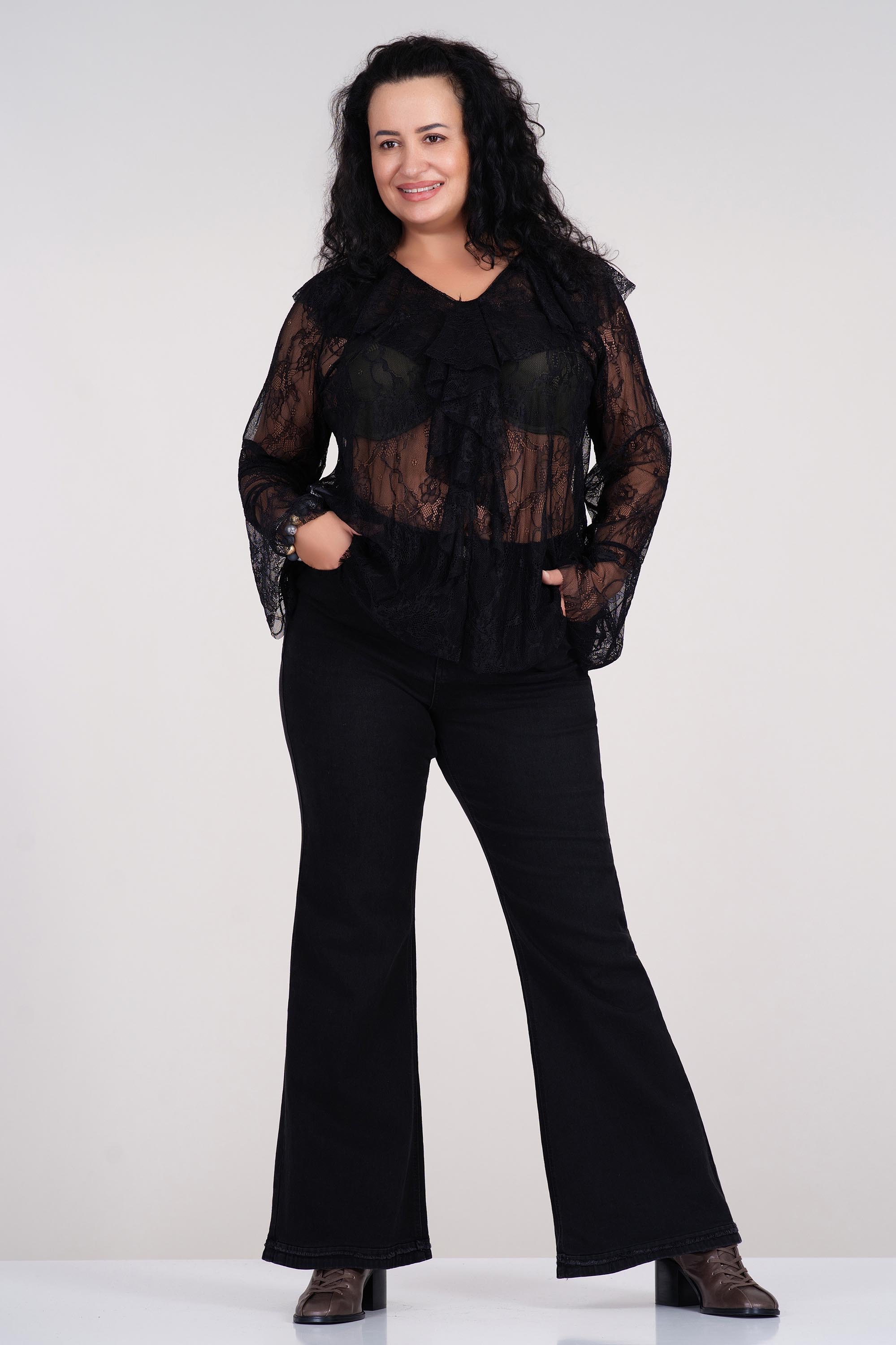 Елегантна блуза от фина дантела в черен нюанс, която подчертава женствеността с изискани волани и остро деколте. Меката еластична материя приляга комфортно по тялото, а едноцветният дизайн придава класическо излъчване. Моделът е подходящ за специални поводи и вечерни визии, комбиниран с елегантен панталон или пола. Италианска изработка с внимание към детайла.