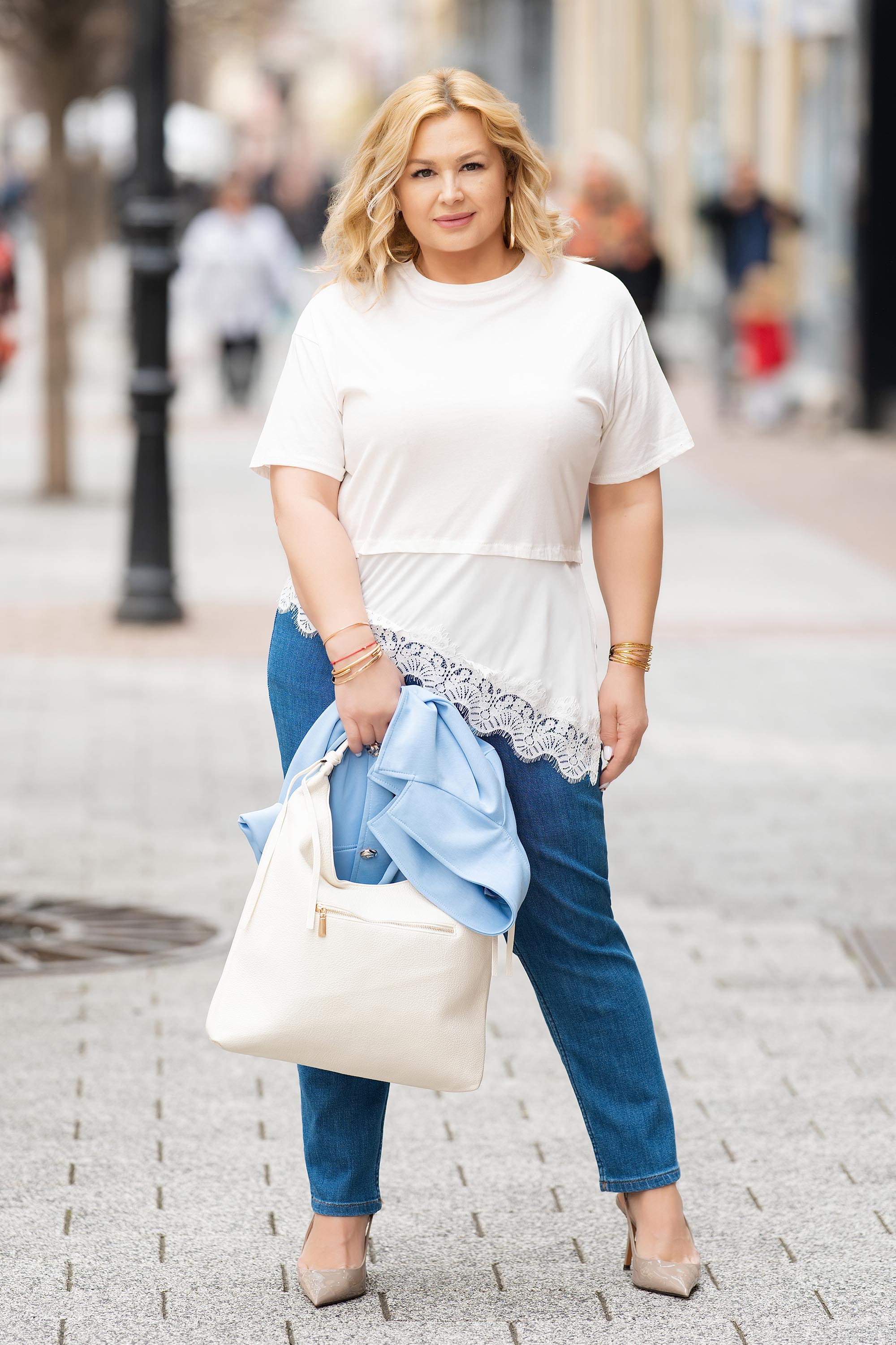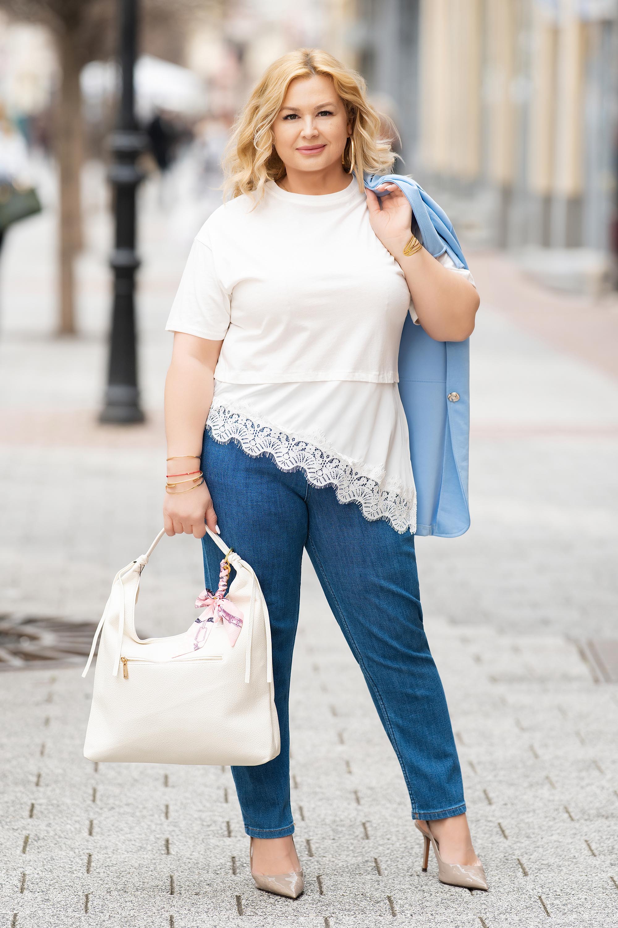 Свеж и комфортен модел с модерно излъчване. Памучната материя осигурява мекота и естествена проветривост, а добавените влакна допринасят за по-добра устойчивост на формата. Асиметричната кройка и сатененият плат с фина бродерия в бяло създават интересен визуален акцент. Подходяща е както за ежедневие, така и за по-елегантна градска визия.