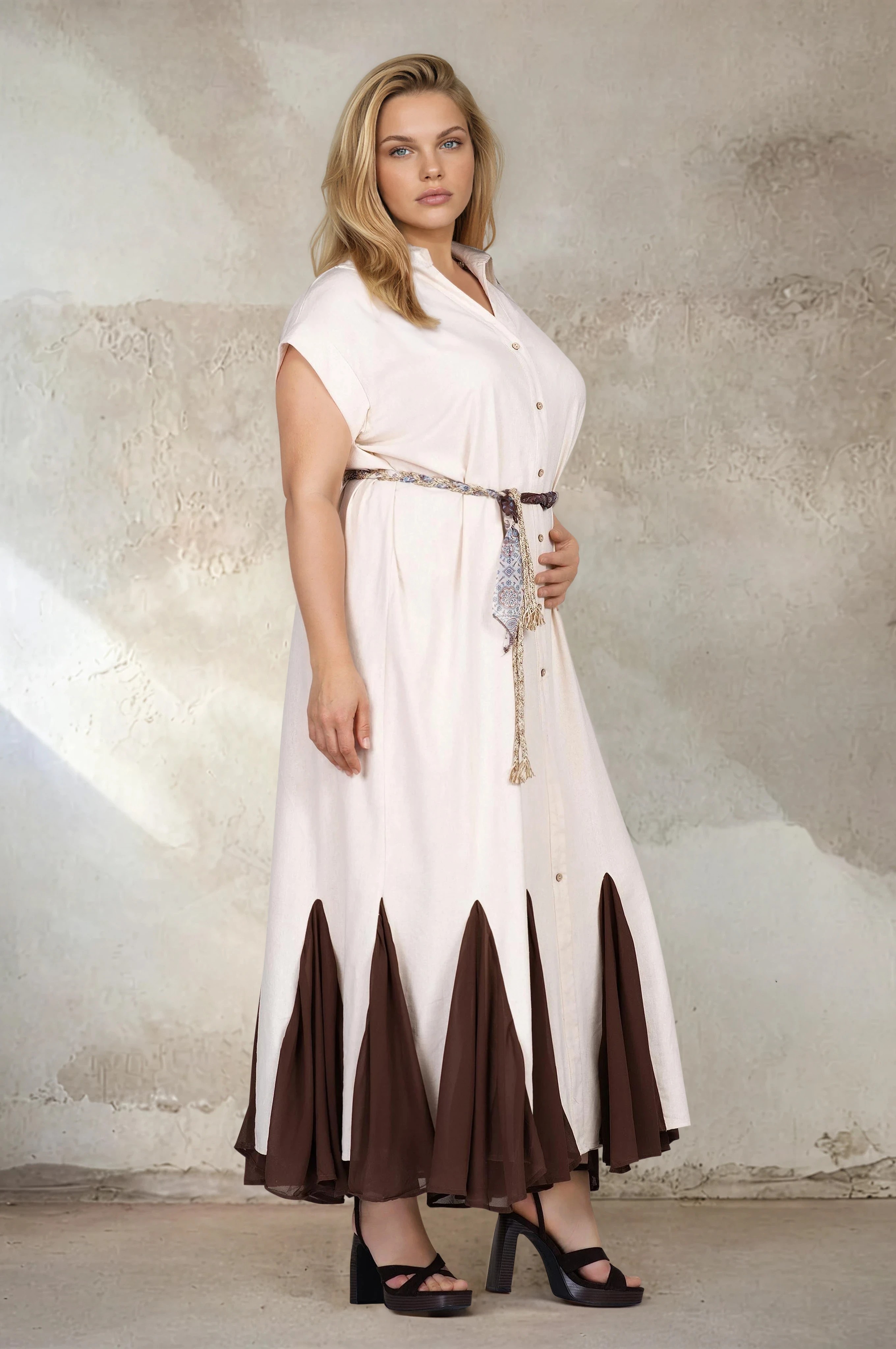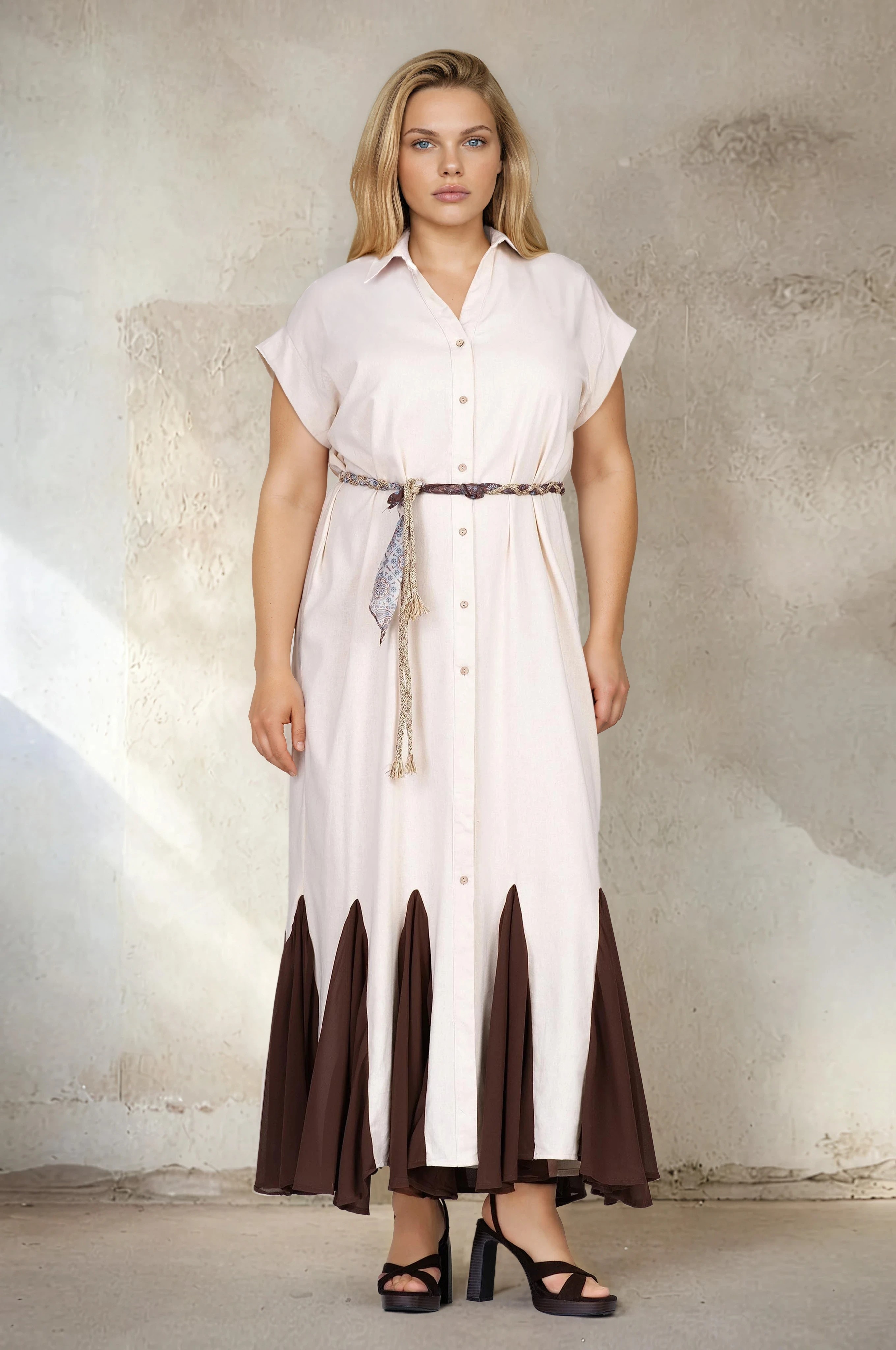 Стилна макси рокля с модерно излъчване. Ленената материя създава усещане за прохлада и комфорт, което я прави идеална за пролетно-летния сезон. Коланът оформя талията и придава женственост, а копчетата по цялата дължина добавят практичност. Контрастният детайл в долната част придава динамика и отличителен характер.