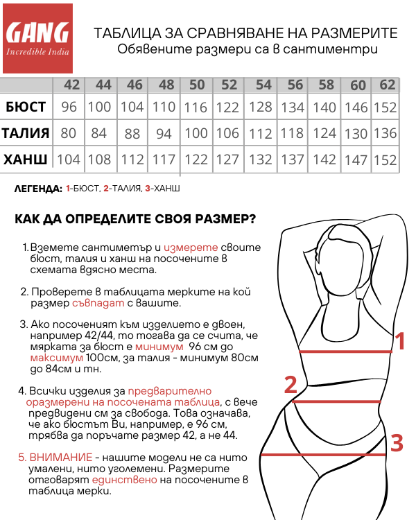 Към всеки артикул в онлайн магазин GANG има приложена таблица с размери. Ако имате нужда от допълнителни указания, наш консултант ще се радва да ви съдейства на телефони 0892257459, 0886122276.