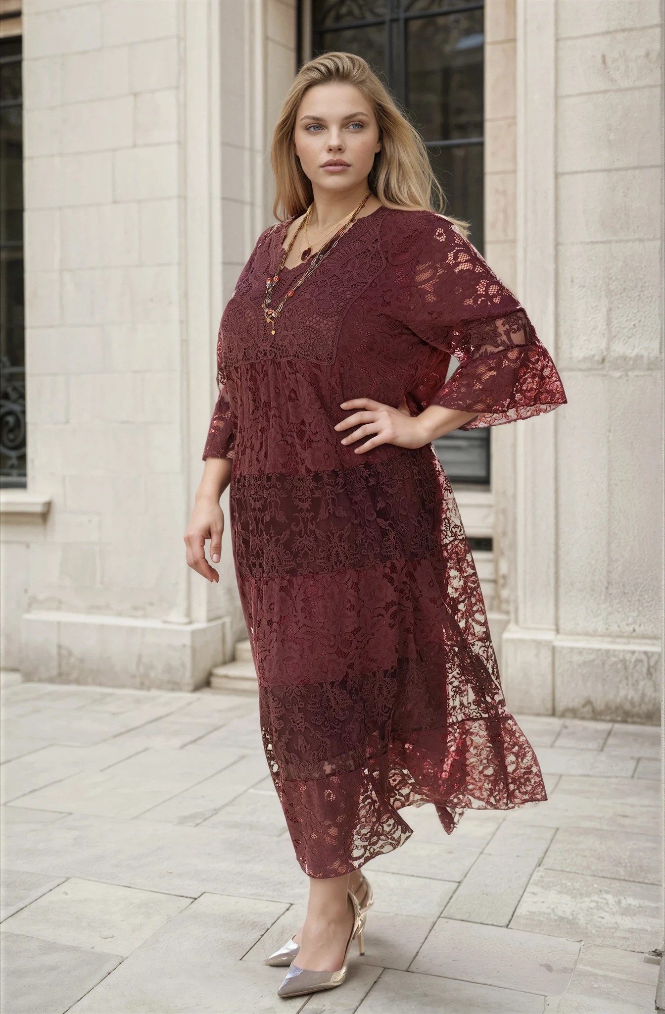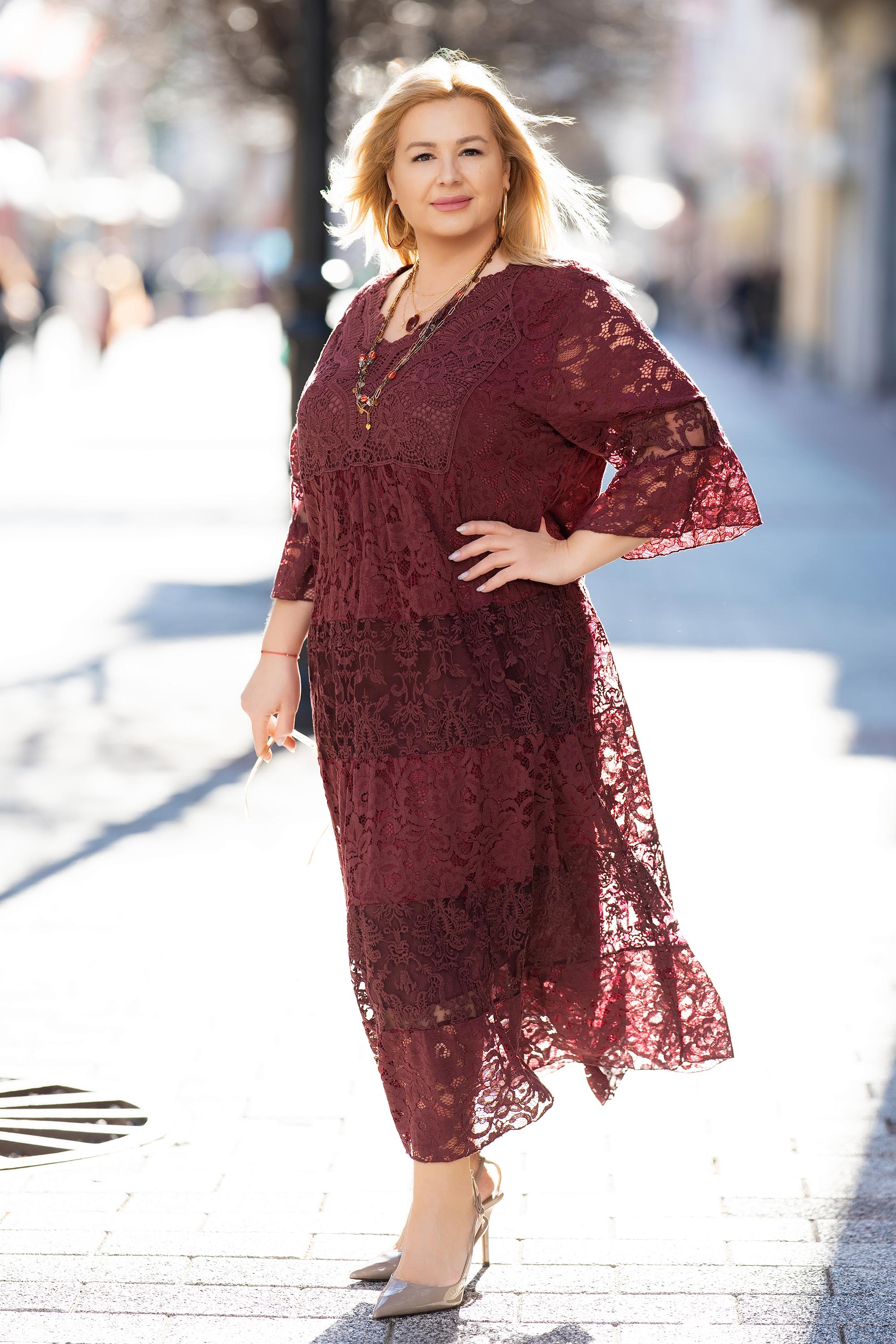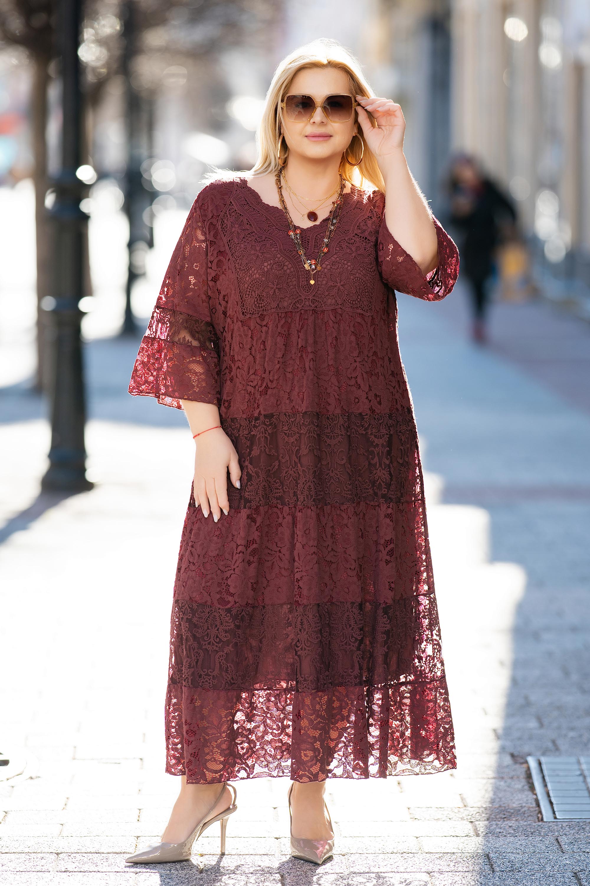 МАКСИ дълга рокля в цвят бордо с богата рязана дантела