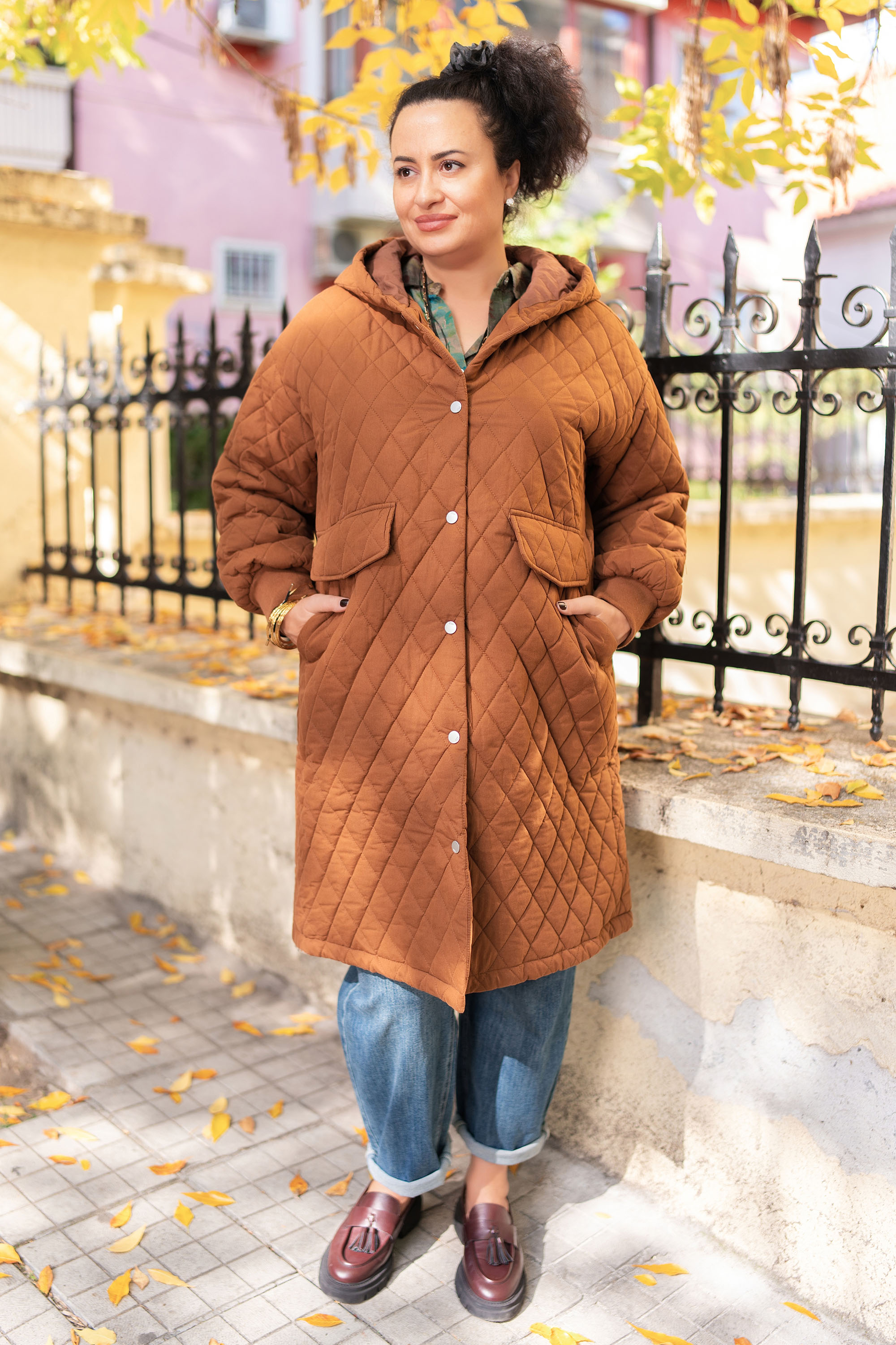 МАКСИ дълго капитонирано яке от памук в кафяво с качулка и джоб с капак