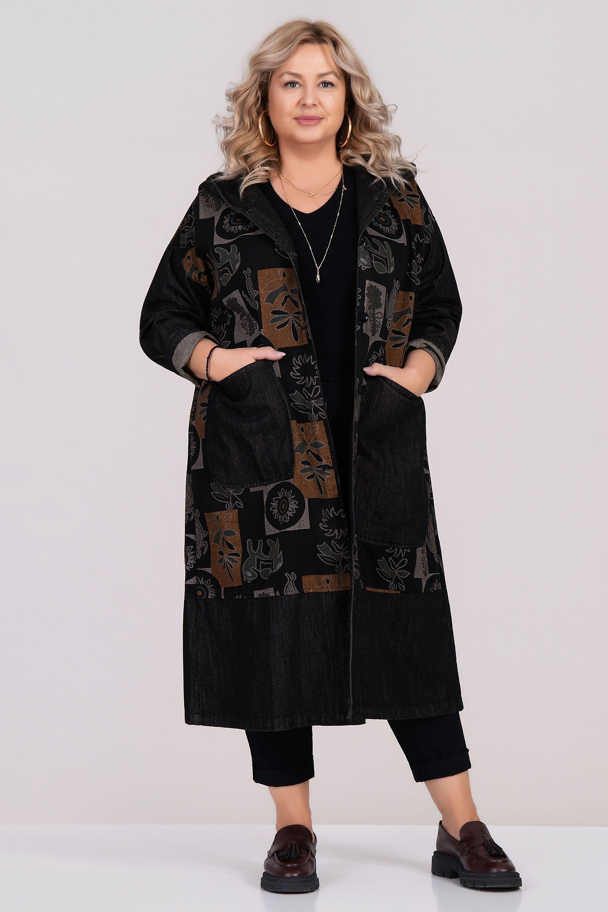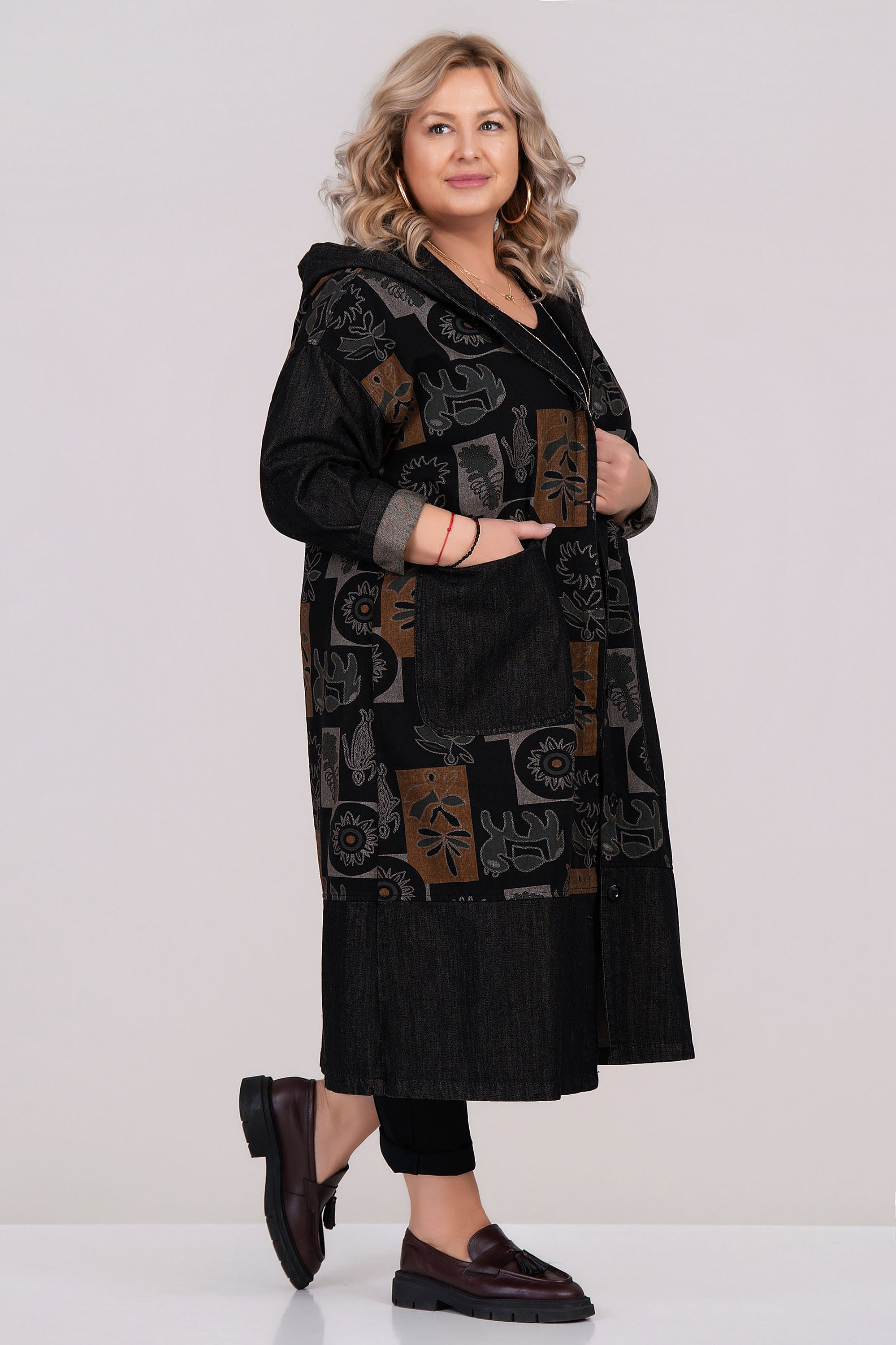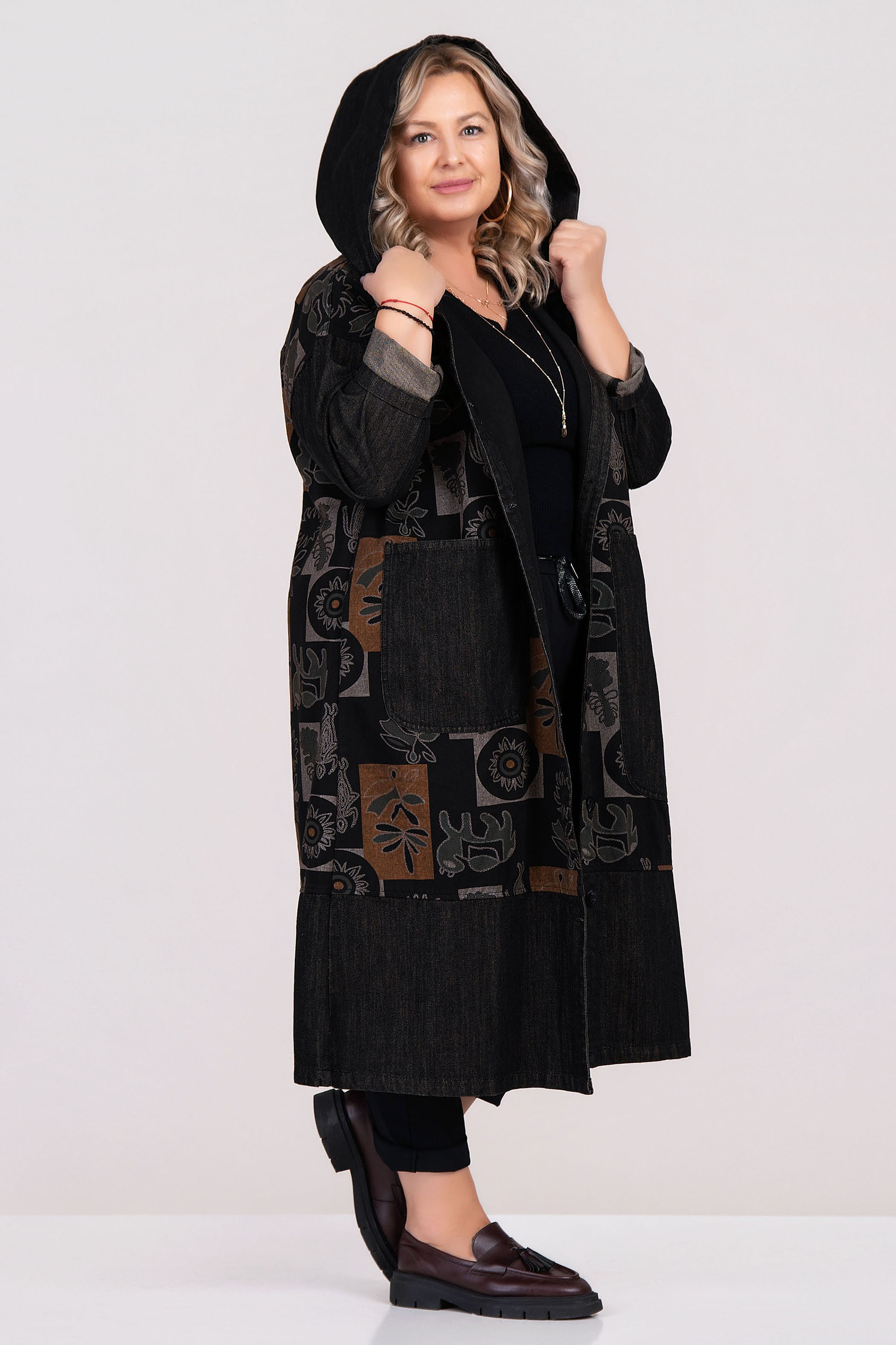 Макси дълго яке от деним в черно с качулка и принт с кактуси