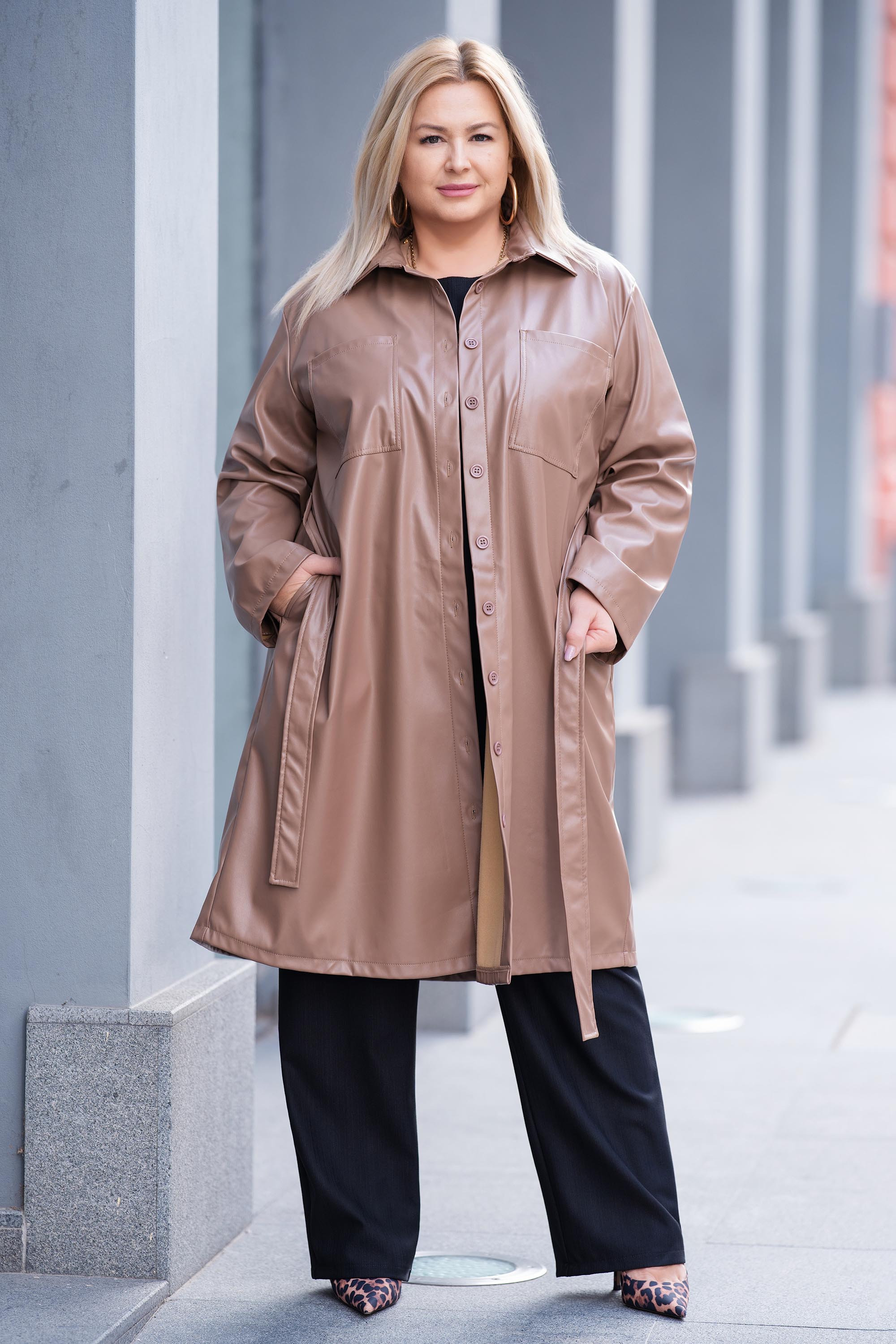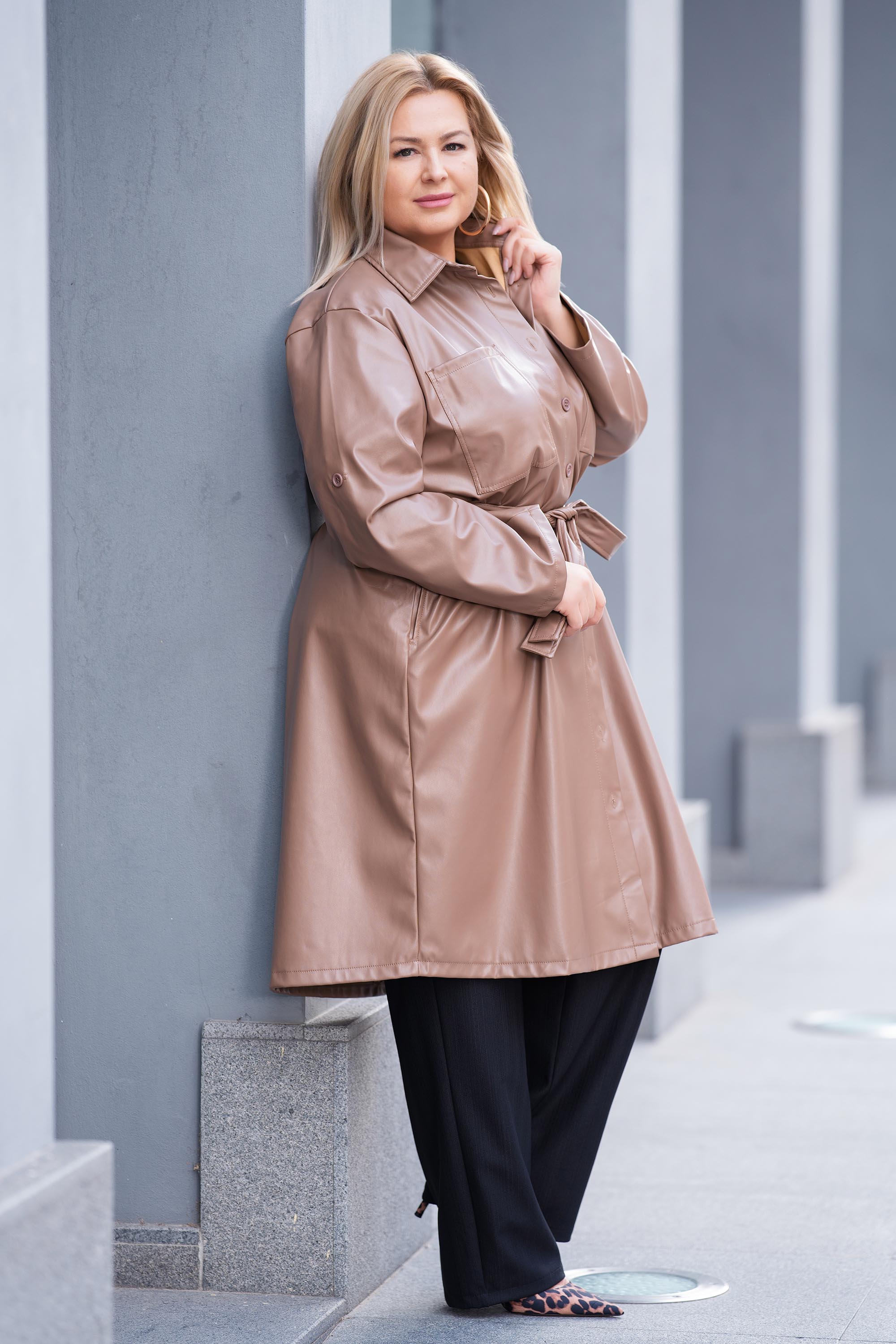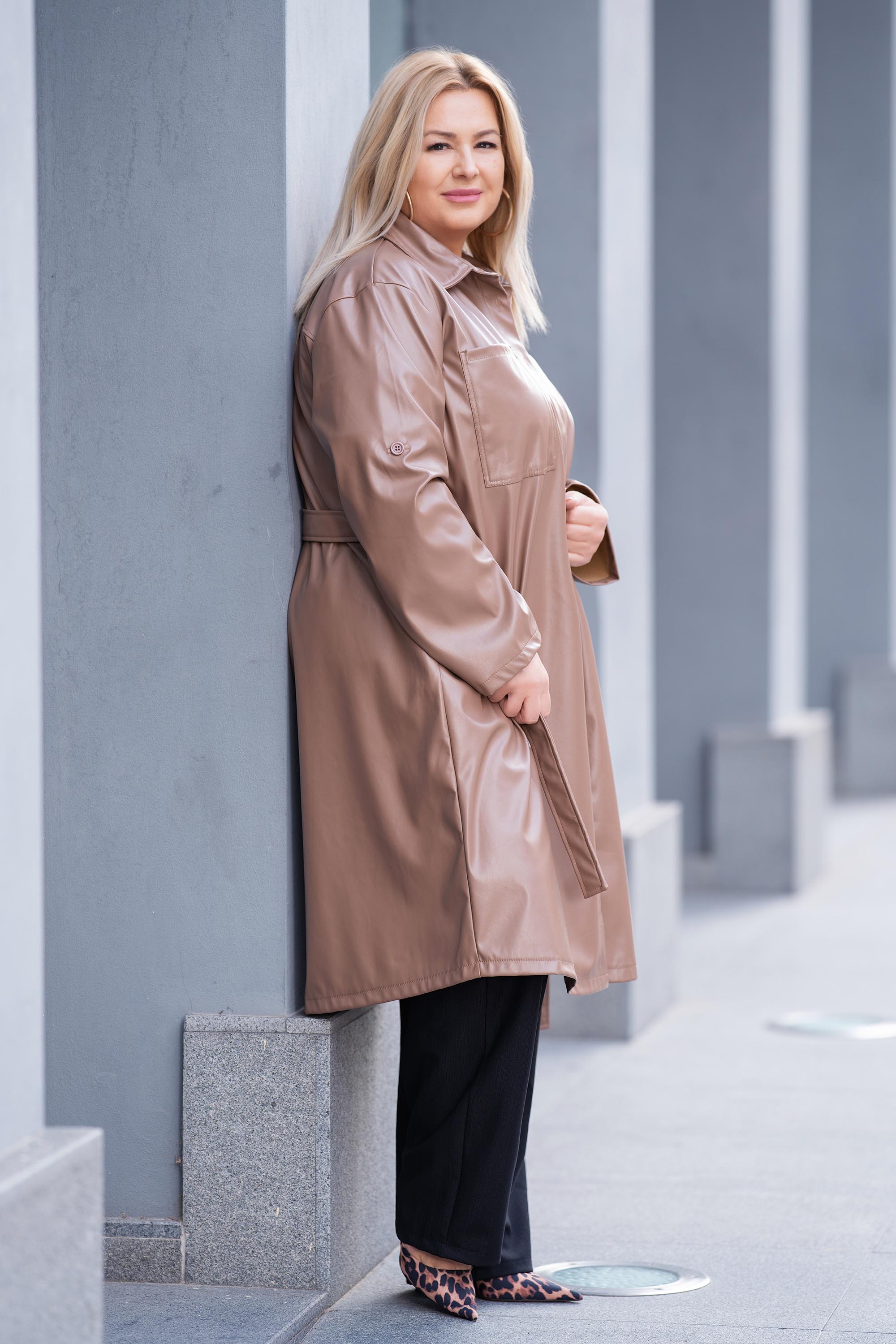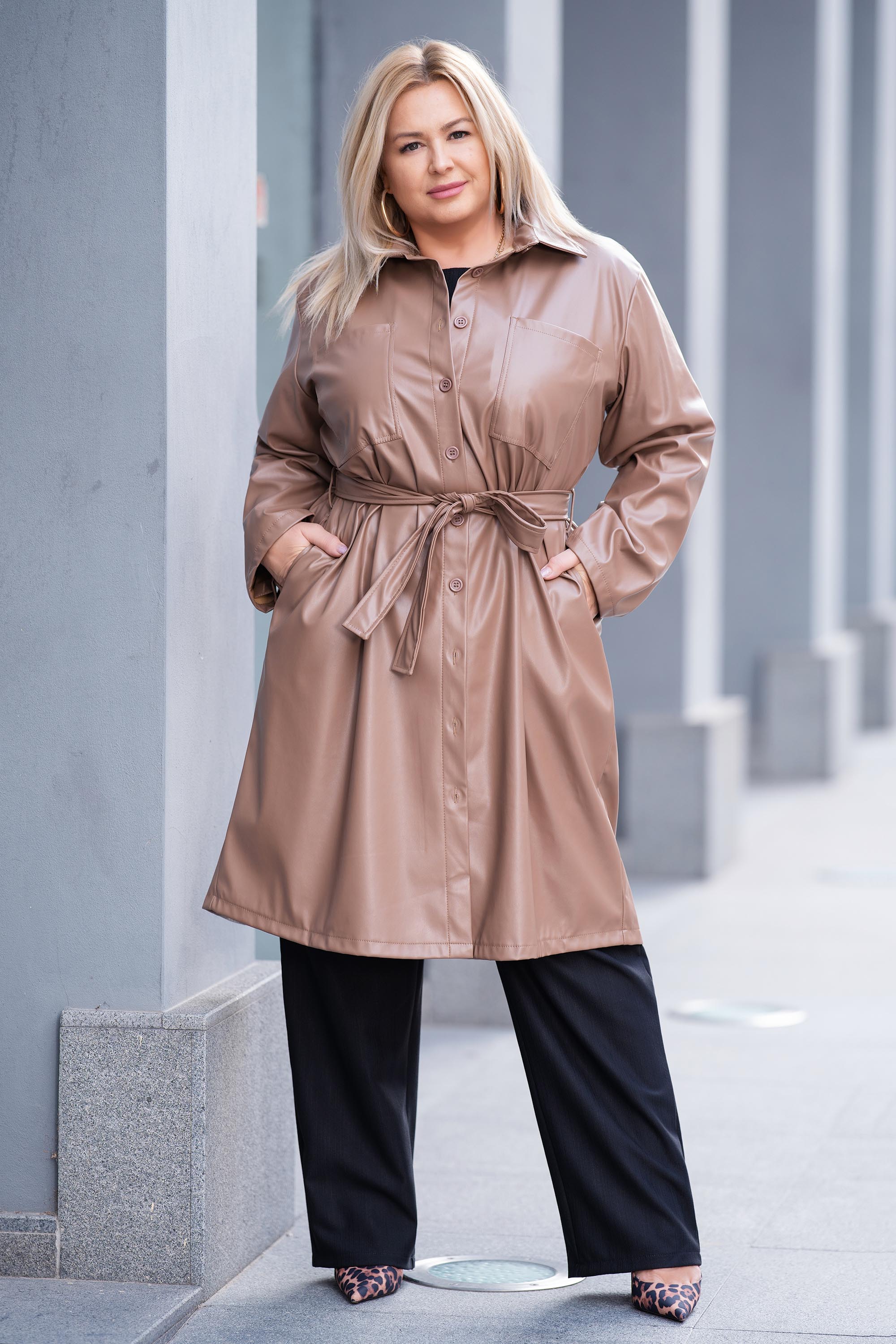 Елегантно и модерно дълго яке от еко кожа в бежов цвят. Моделът е с права кройка, дълъг регулиращ се ръкав и колан на талията, който подчертава силуета и придава женственост. Закопчава се с копчета по цялата дължина и има практични странични джобове. Материята е мека и комфортна, подходяща за есенните дни. Перфектен избор за стилна градска визия или по-елегантен повод.
