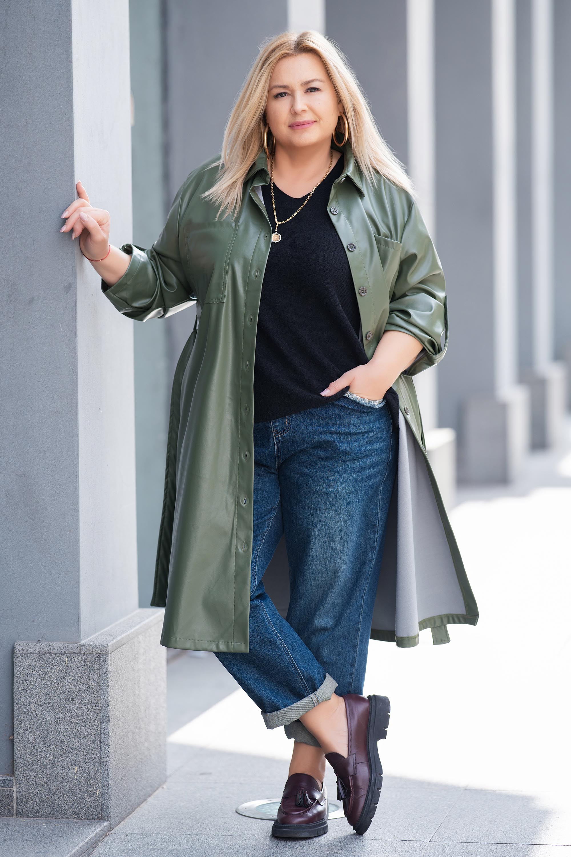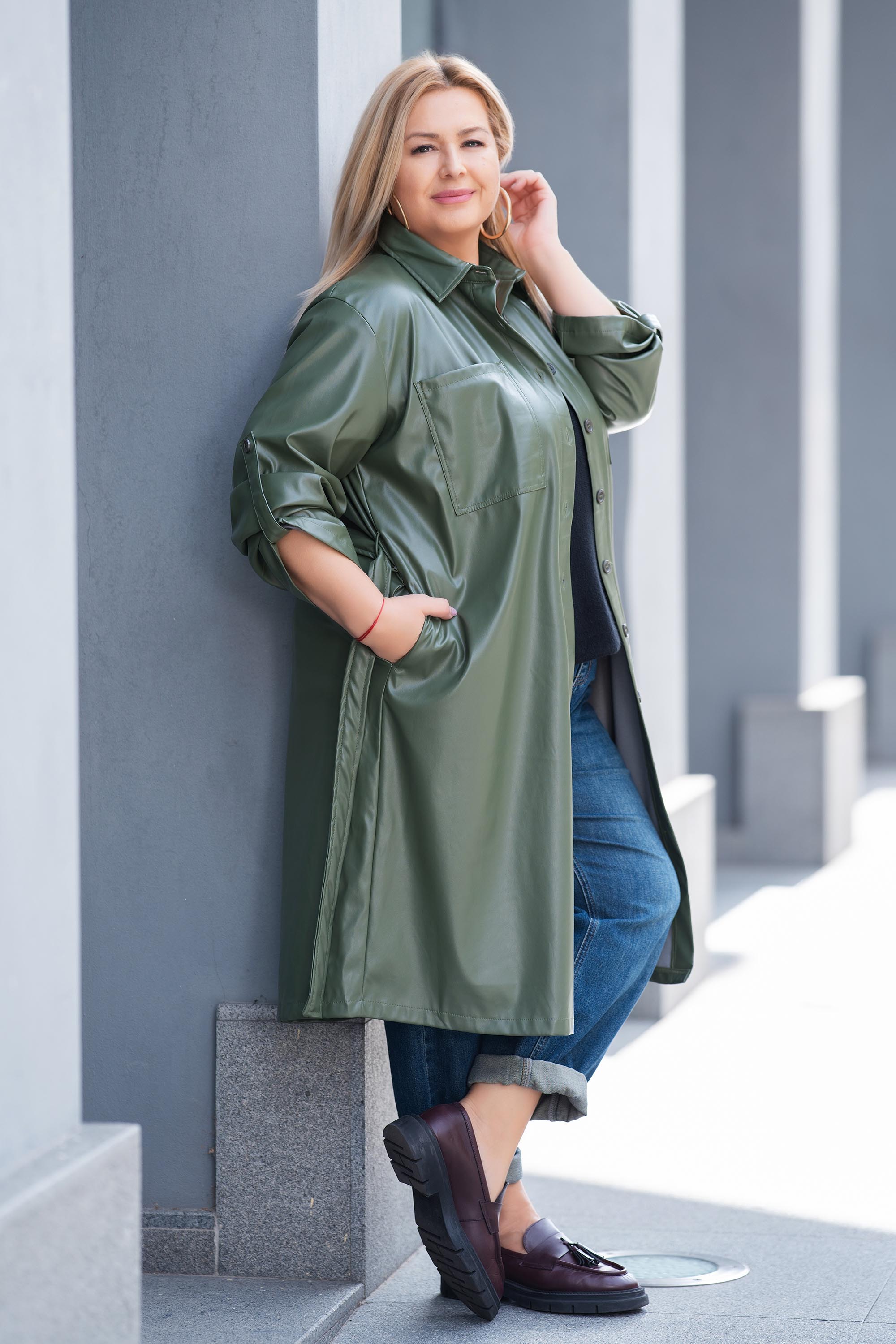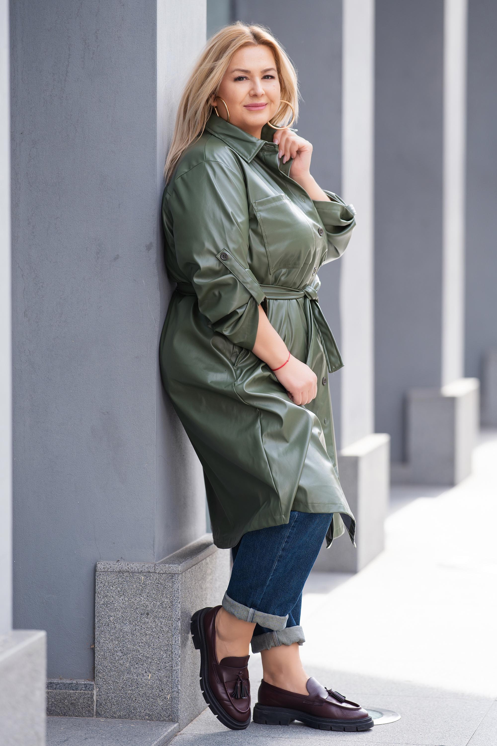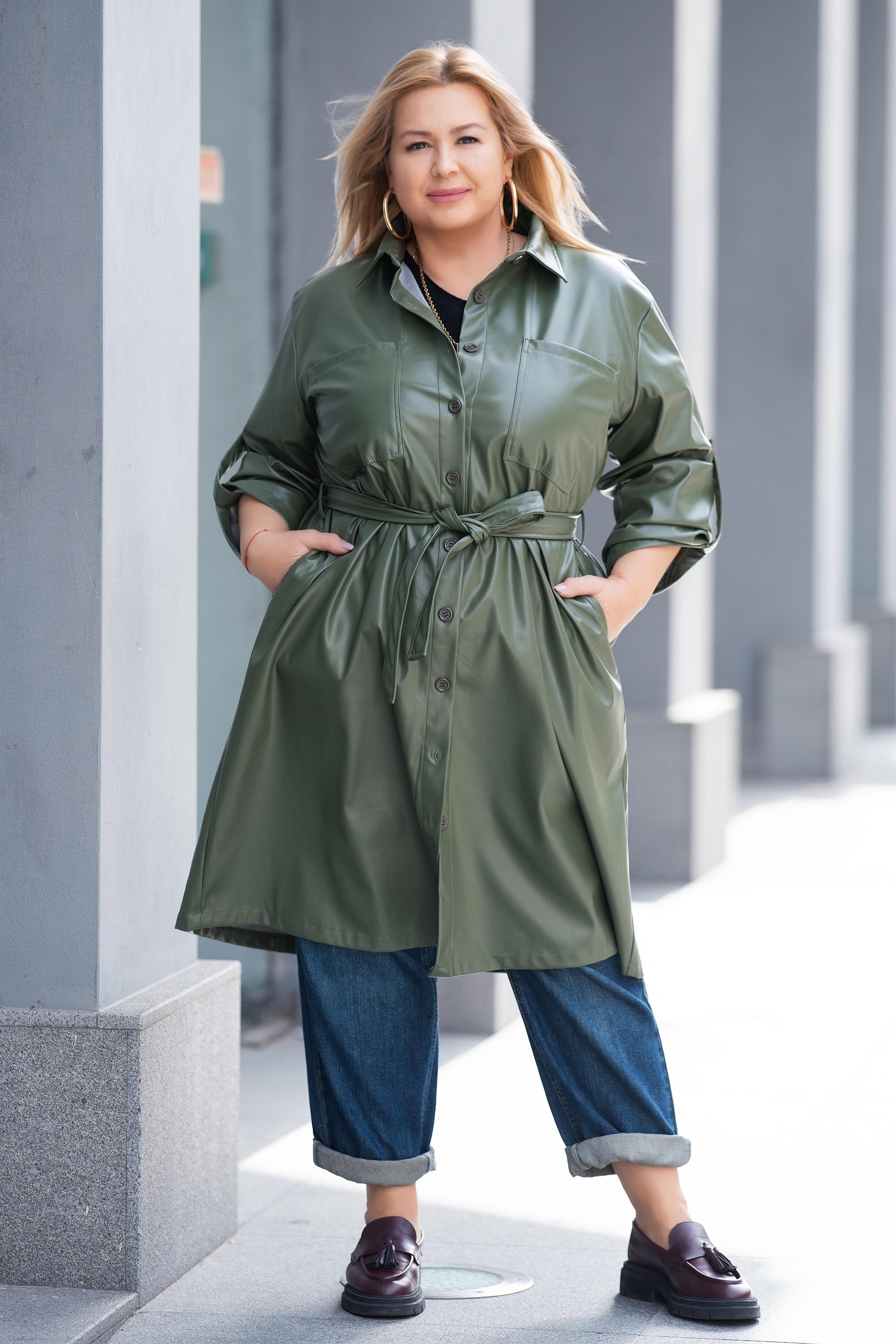 Елегантно и модерно дълго яке от еко кожа в цвят милитъри. Моделът е с права кройка, дълъг регулиращ се ръкав и колан на талията, който подчертава силуета и придава женственост. Закопчава се с копчета по цялата дължина и има практични странични джобове. Материята е мека и комфортна, подходяща за есенните дни. Перфектен избор за стилна градска визия или по-елегантен повод.