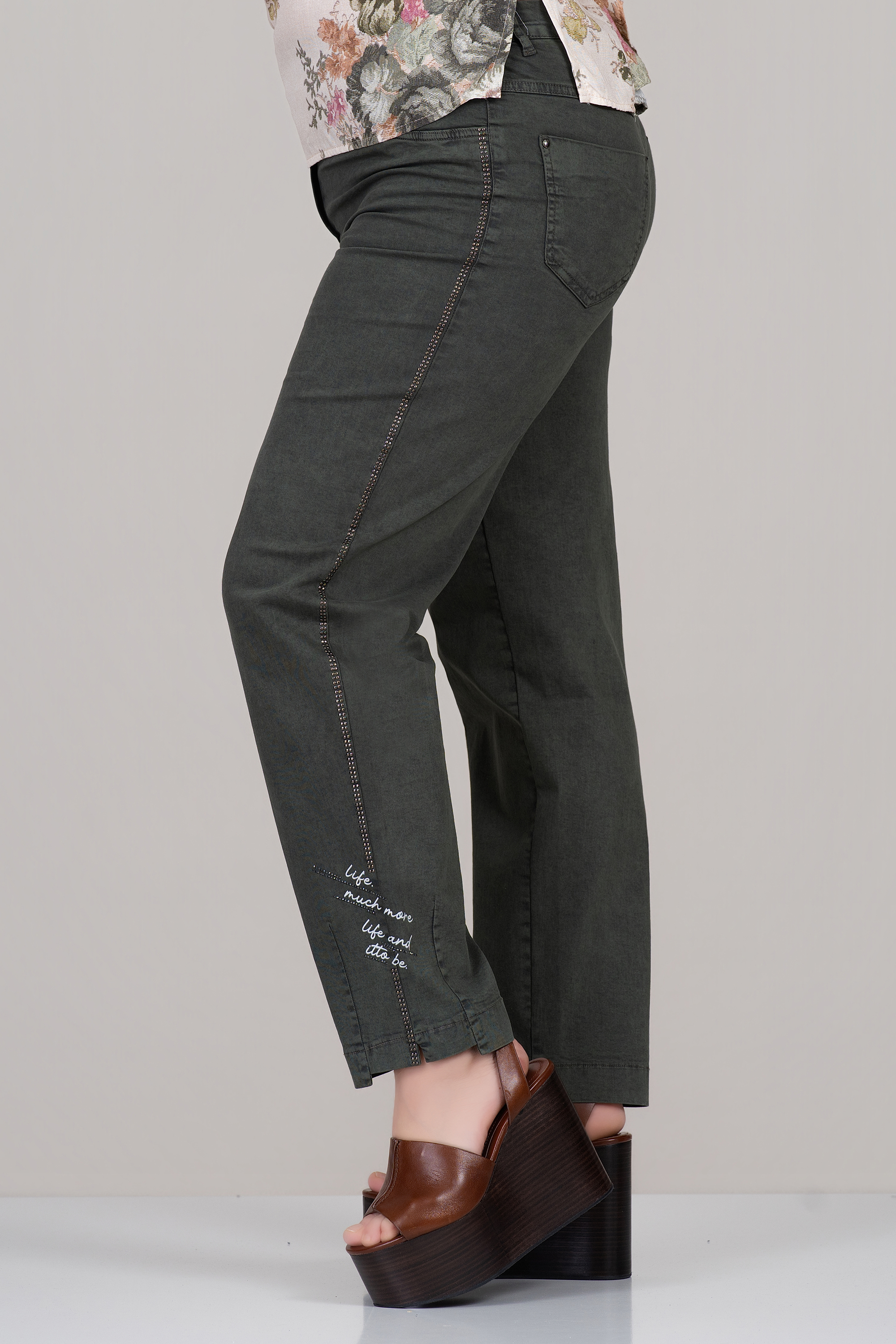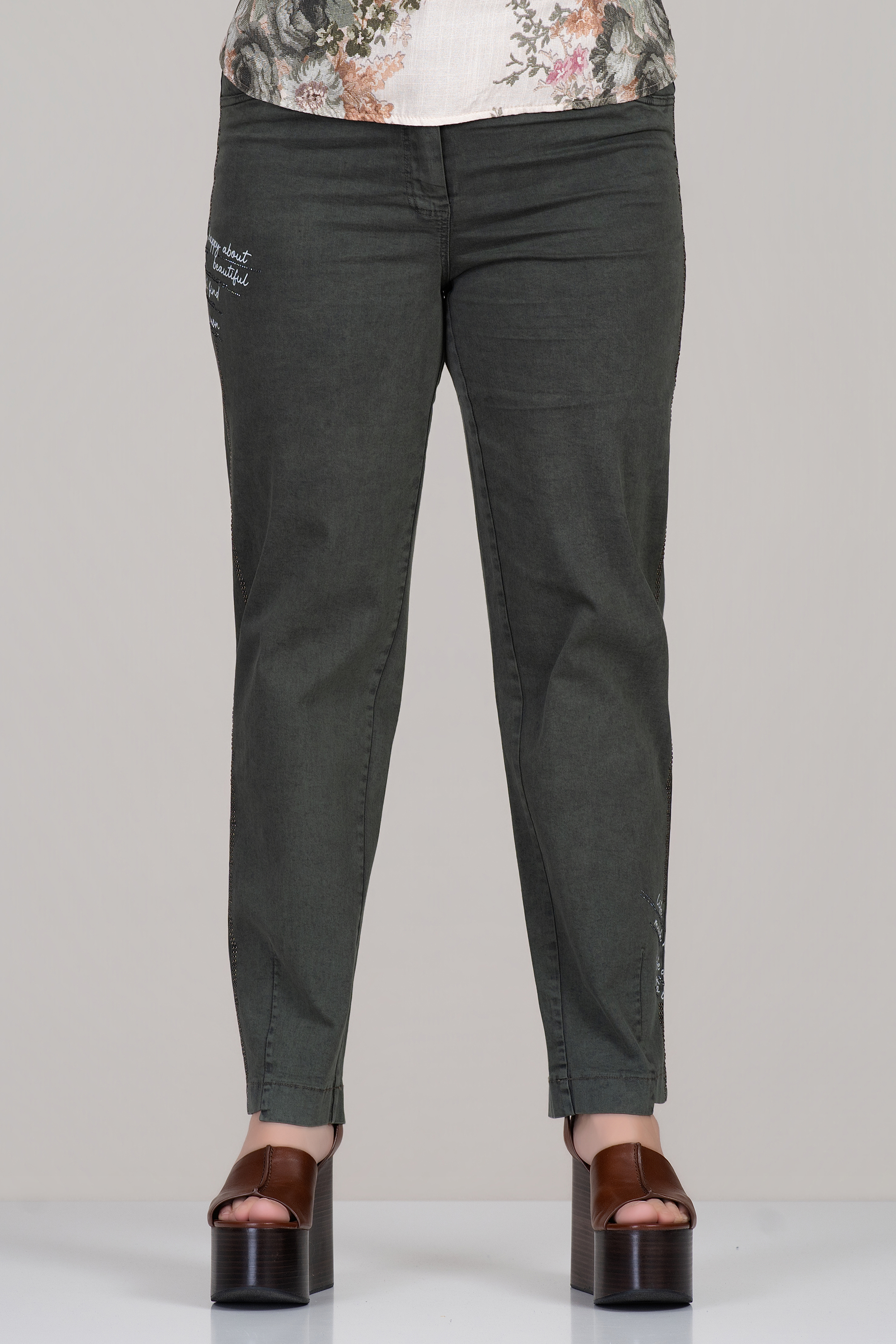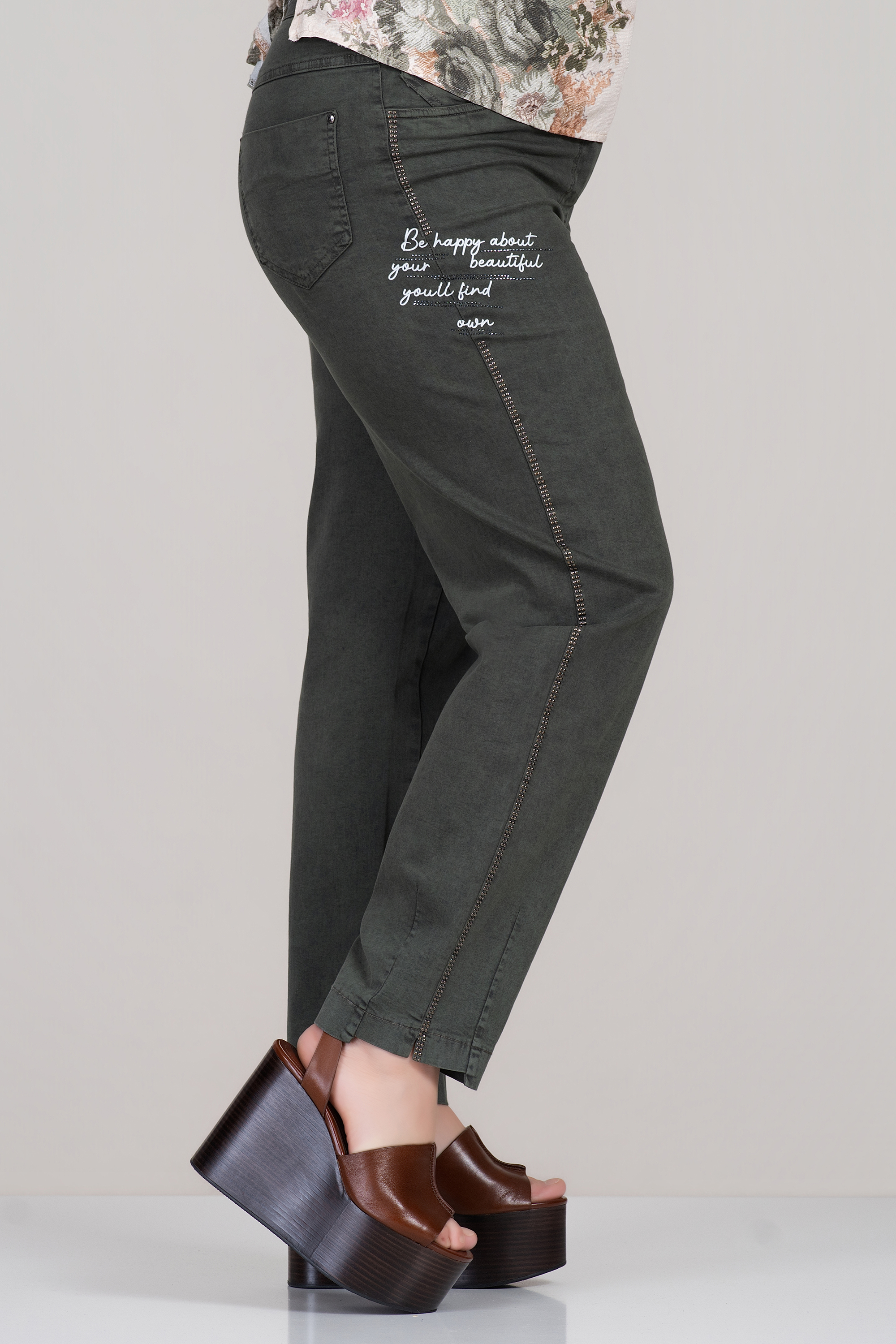 Макси дънки от памук в цвят милитъри с еластична талия и надпис и декоративни камъни