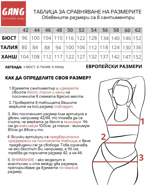Към всеки артикул в онлайн магазин GANG има приложена таблица с размери. Ако имате нужда от допълнителни указания, наш консултант ще се радва да ви съдейства на телефони 0892257459, 0886122276.