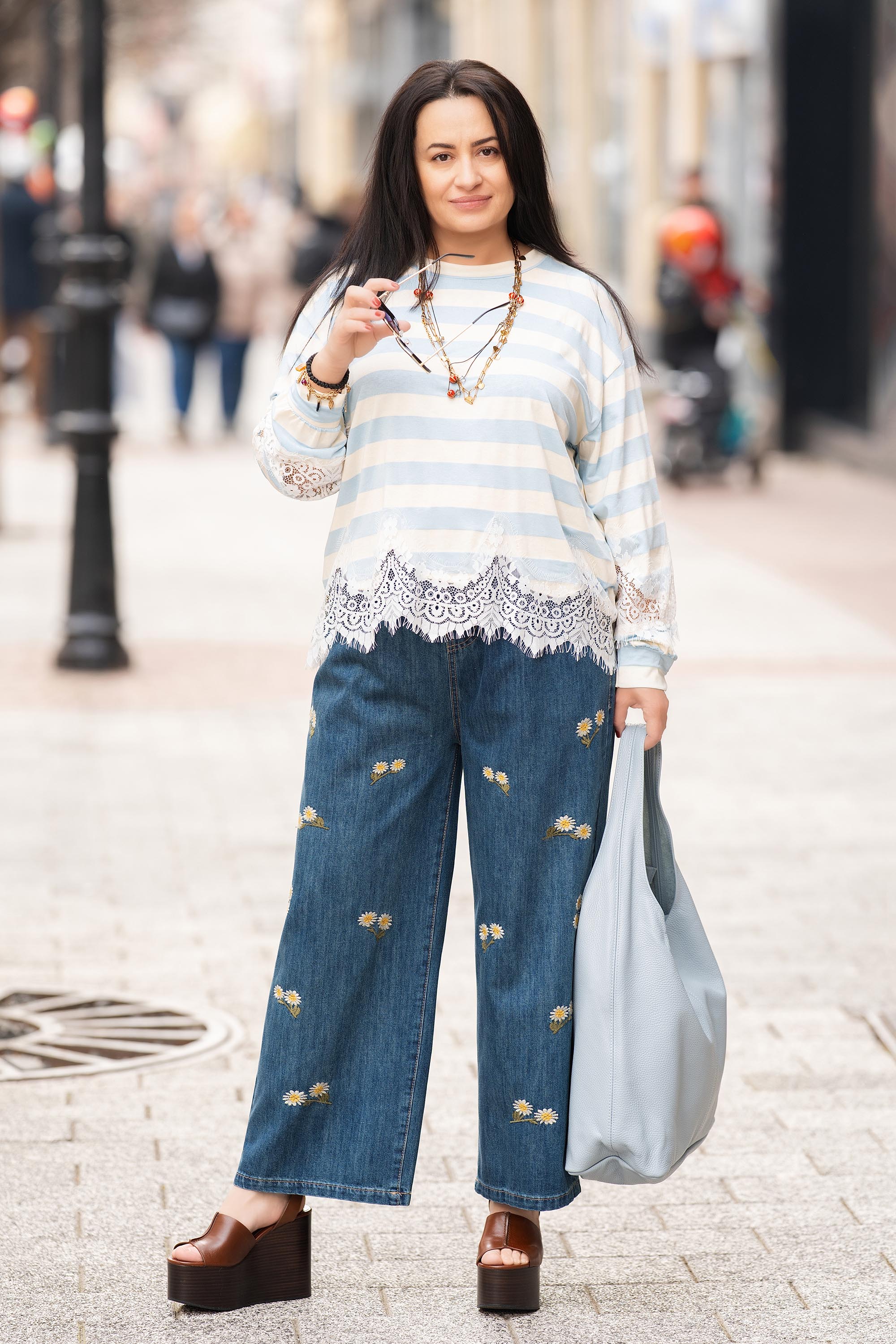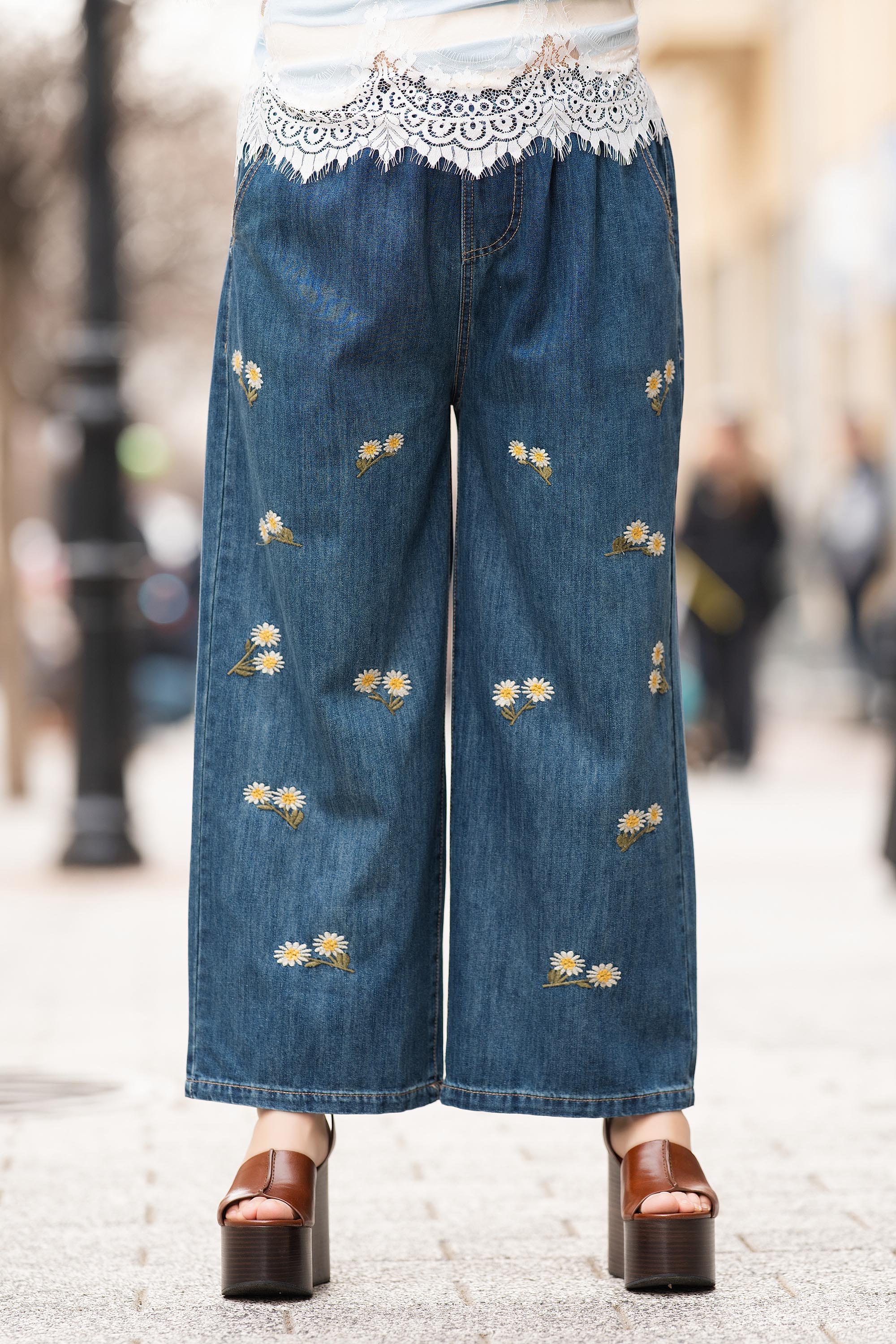 Стилни дънки от мек памучен деним, които съчетават комфорт и артистичен акцент. Моделът е с еластична талия, която осигурява удобно прилягане и свобода на движение през целия ден. Декоративните бродирани маргарити придават свеж и женствен характер на дизайна, превръщайки дънките в отличителен елемент от визията. Широкият силует и практичните джобове ги правят подходящ избор както за ежедневни градски комбинации, така и за по-непринудени уикенд визии.