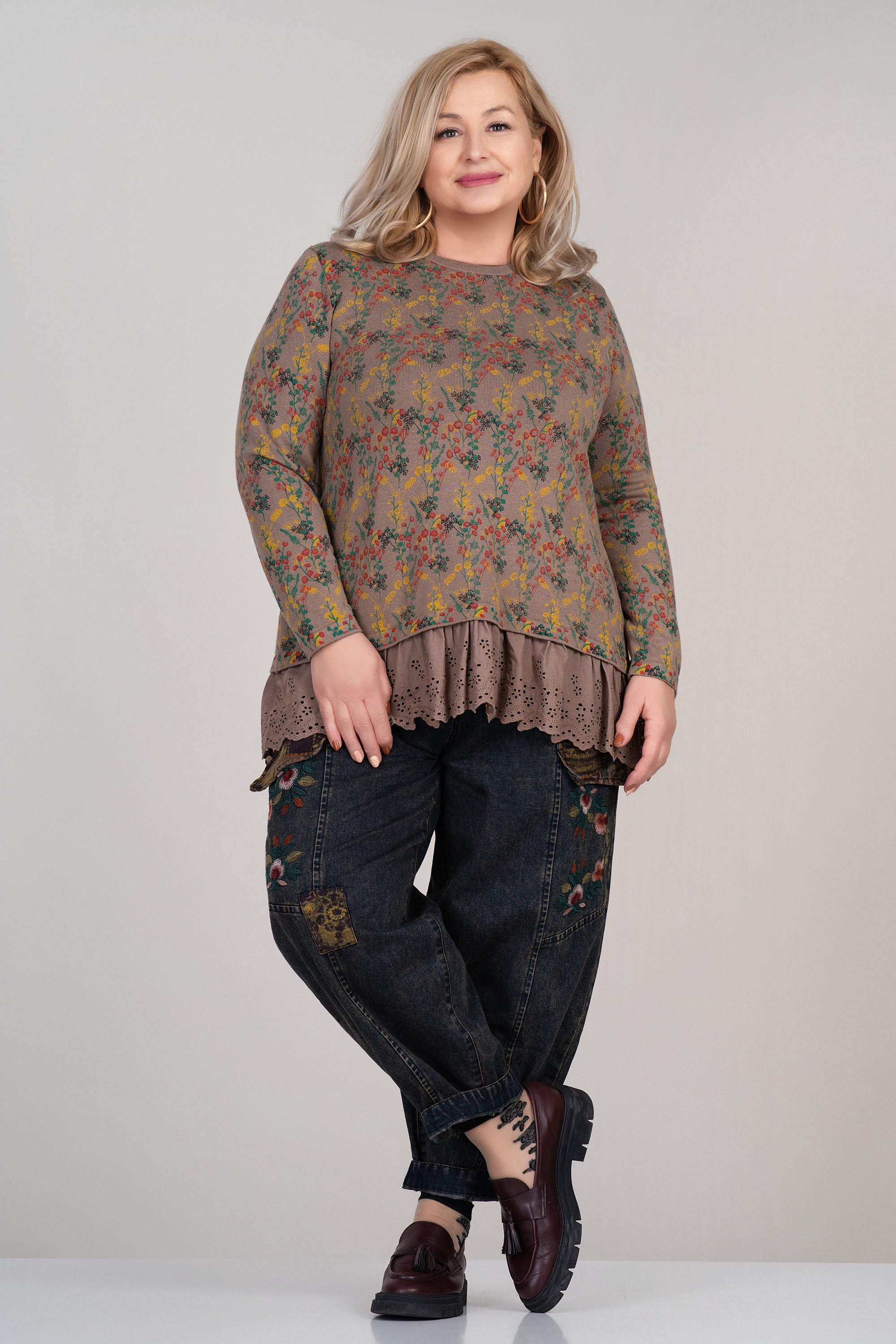 Артистичен модел с подчертана индивидуалност – тези макси дънки впечатляват с богати флорални бродерии и декоративни емеленти на коленете. Кройката тип балон и еластичният колан осигуряват свобода на движение и максимален комфорт. Подходящи за ежедневието или креативна визия през преходните сезони.