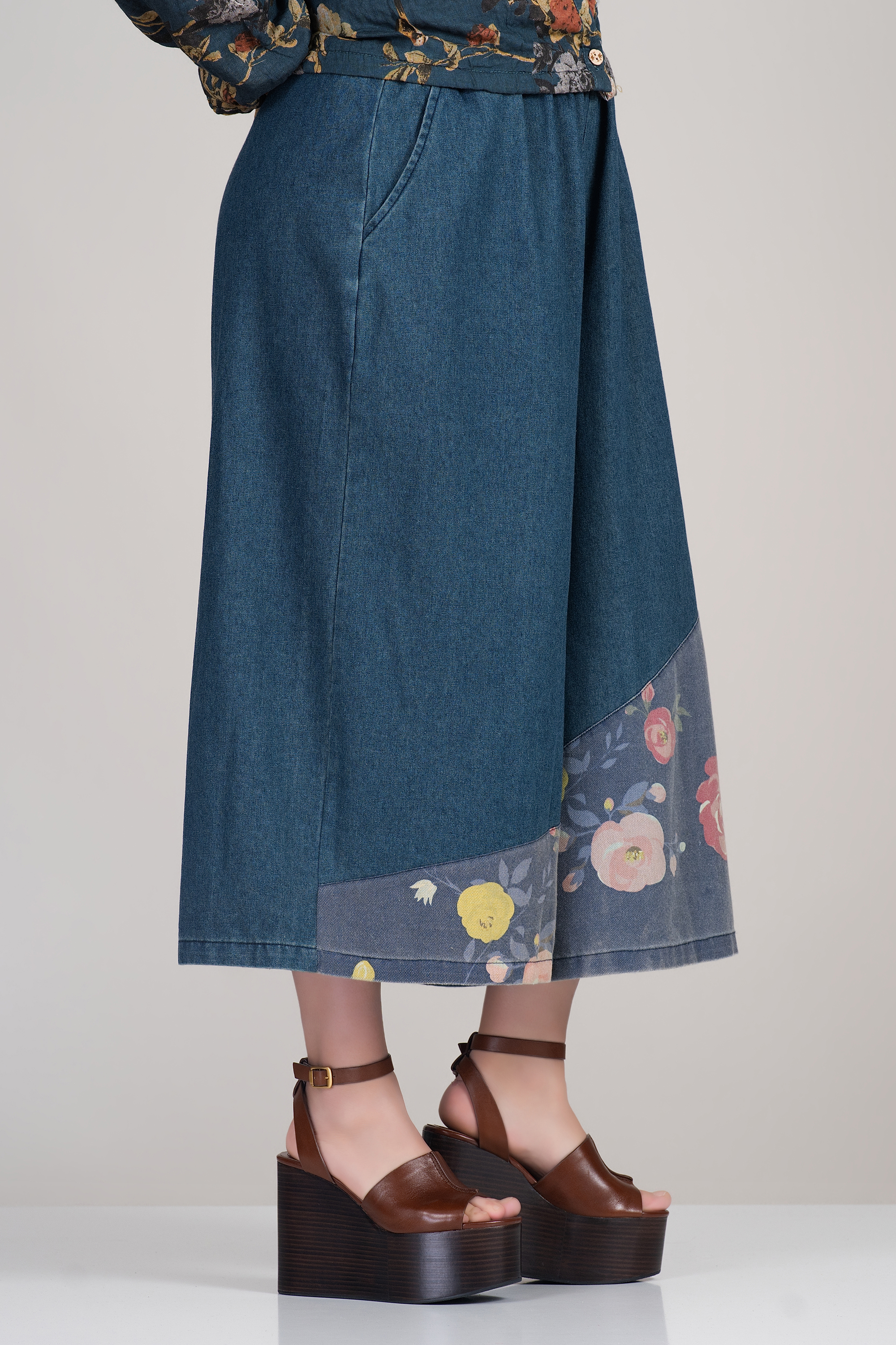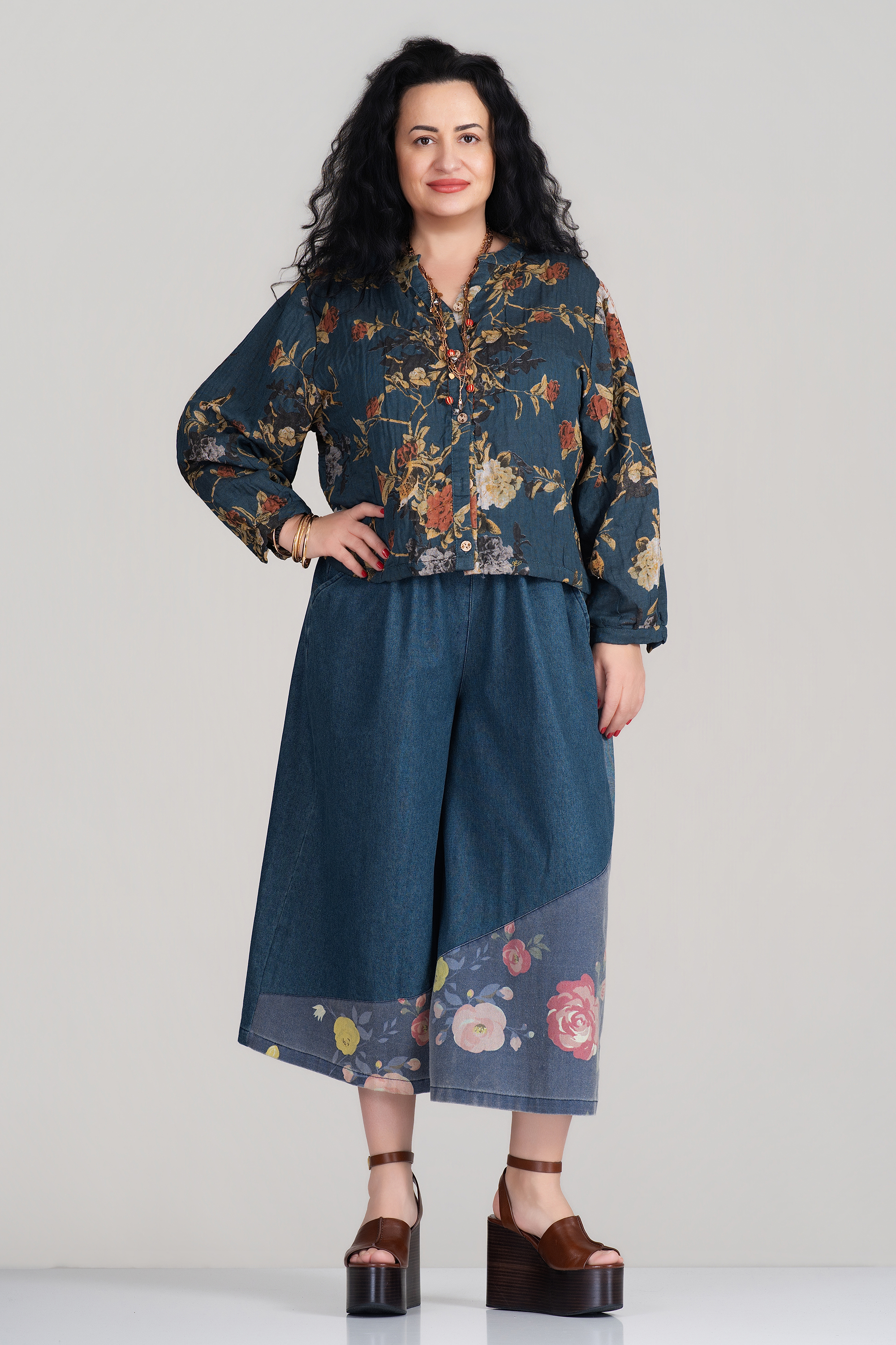 Тези дънки впечатляват с артистичен акцент – широки крачоли, завършени с контрастен флорален принт в червено и жълто. Ластичната талия с връзки осигурява комфорт и свобода на движение. Подходящи за ежедневни визии с бохемски дух и модерен прочит на класическия деним.