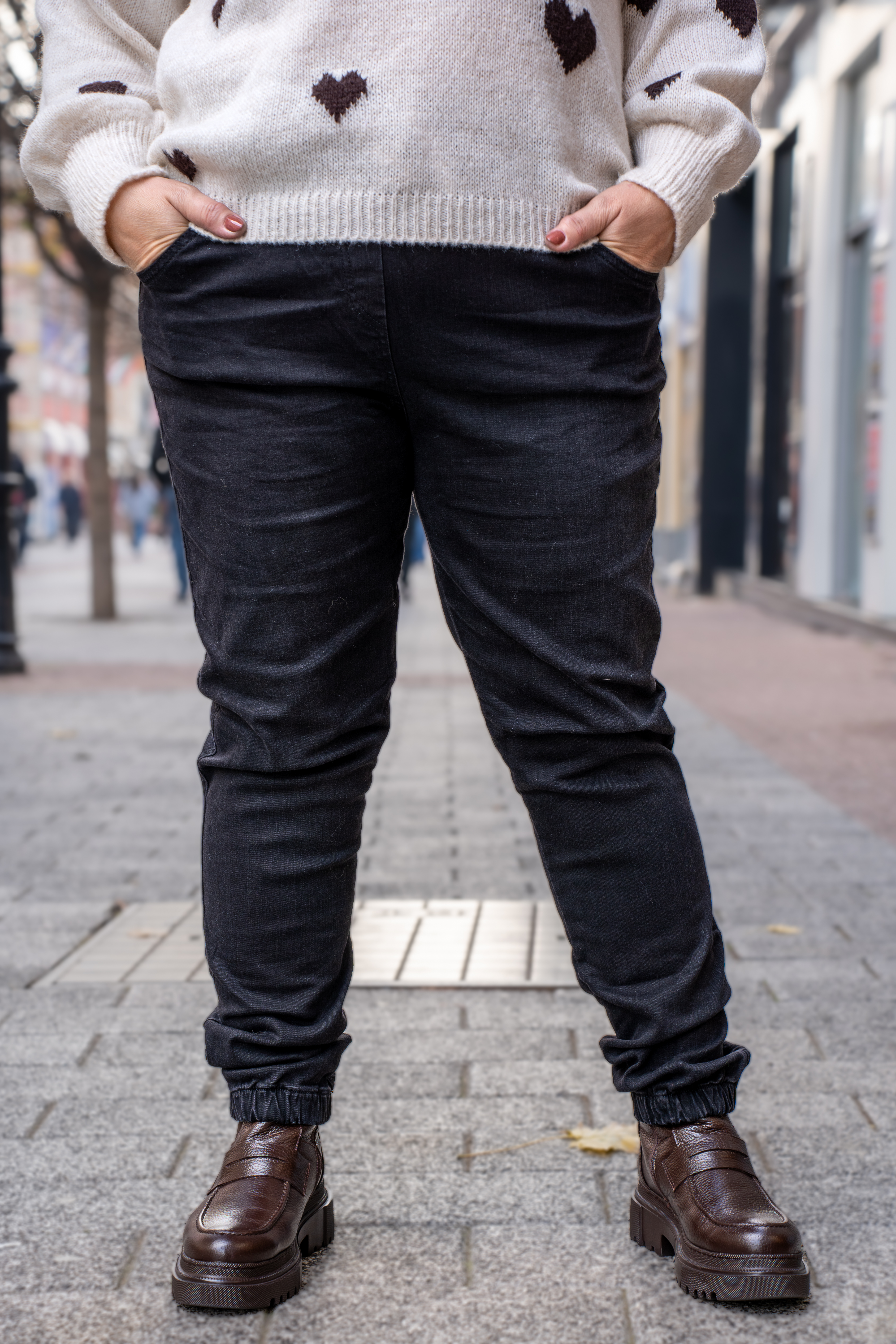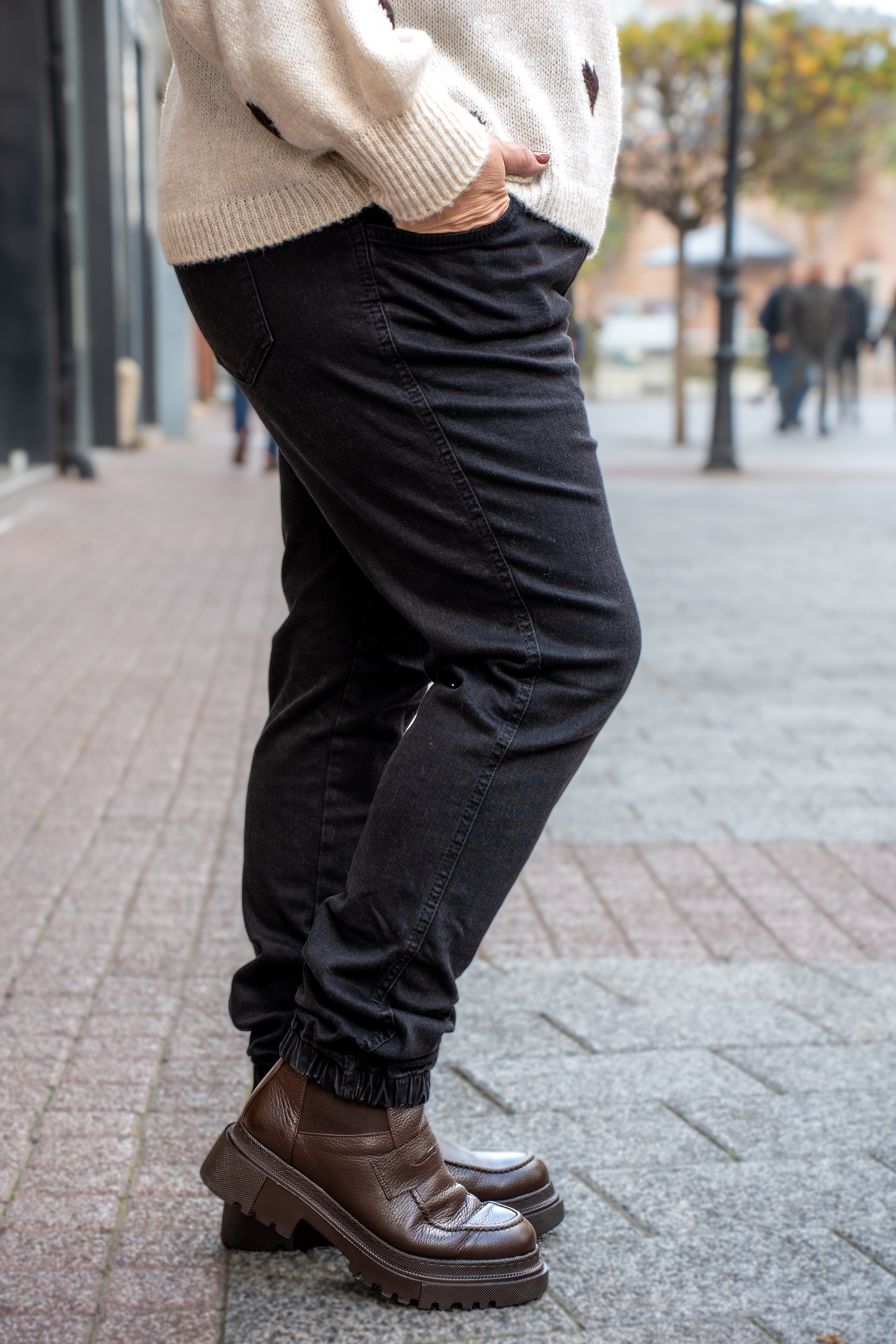 Мека материя, комфортна талия с ластик и елегантен прав силует – това са отличителните черти на този модел дънки. Черният деним придава завършеност на визията, докато белите връзки добавят лек акцент. Перфектен избор за натоварен градски ритъм и комфорт през целия ден.