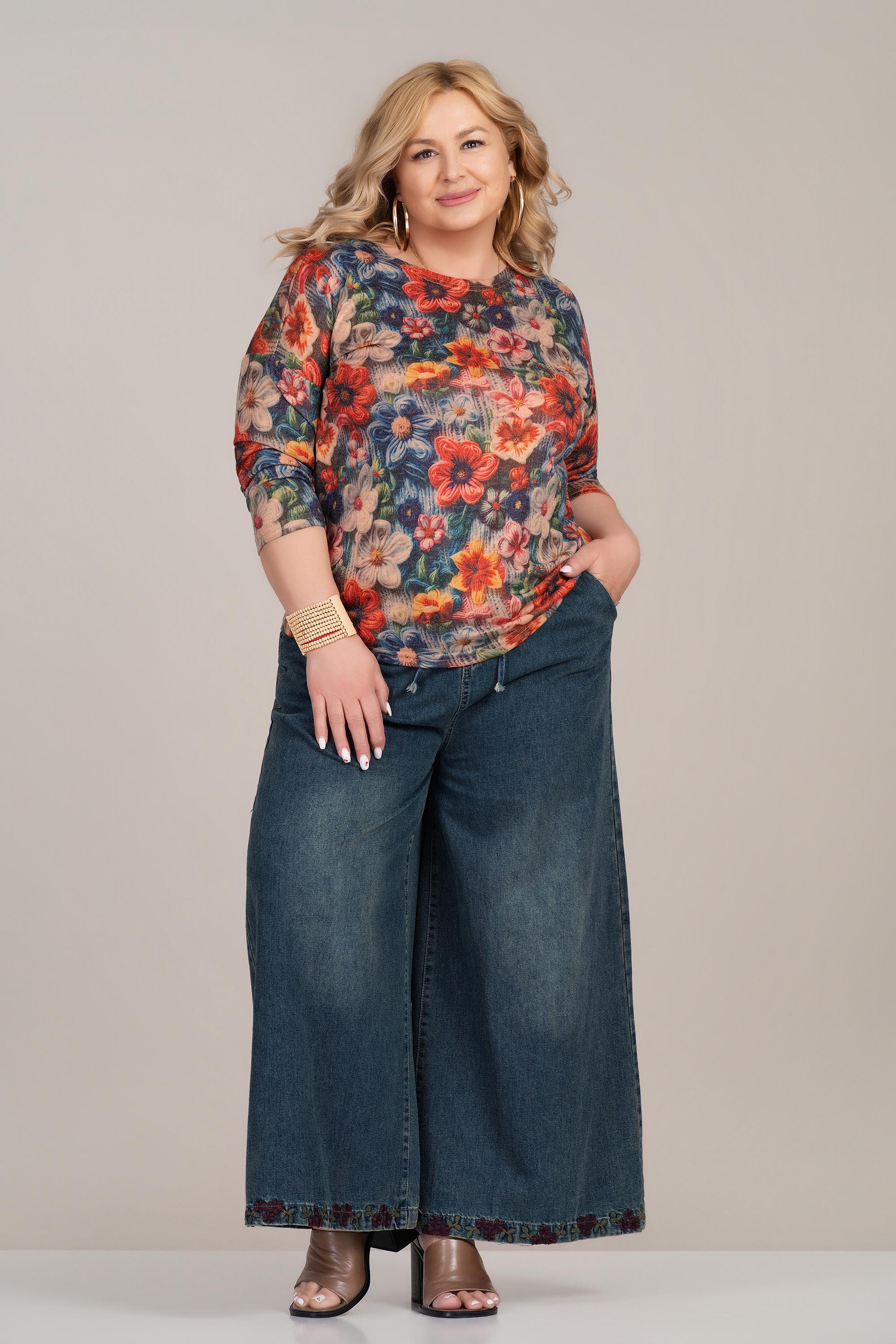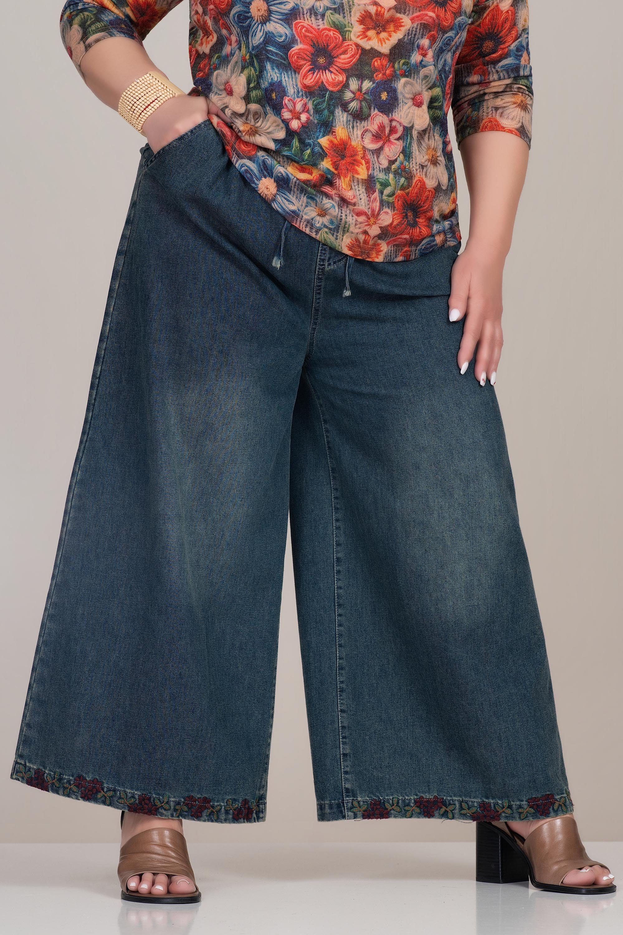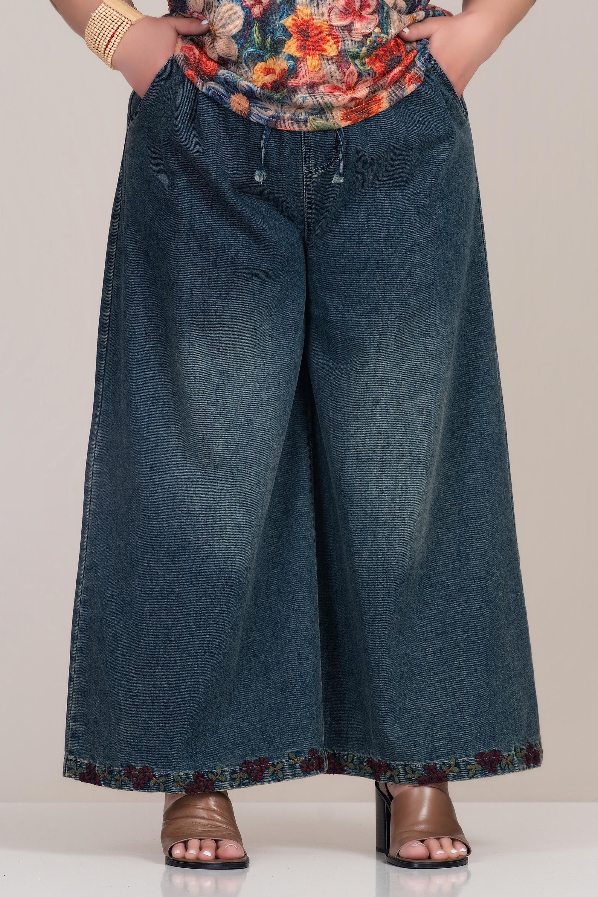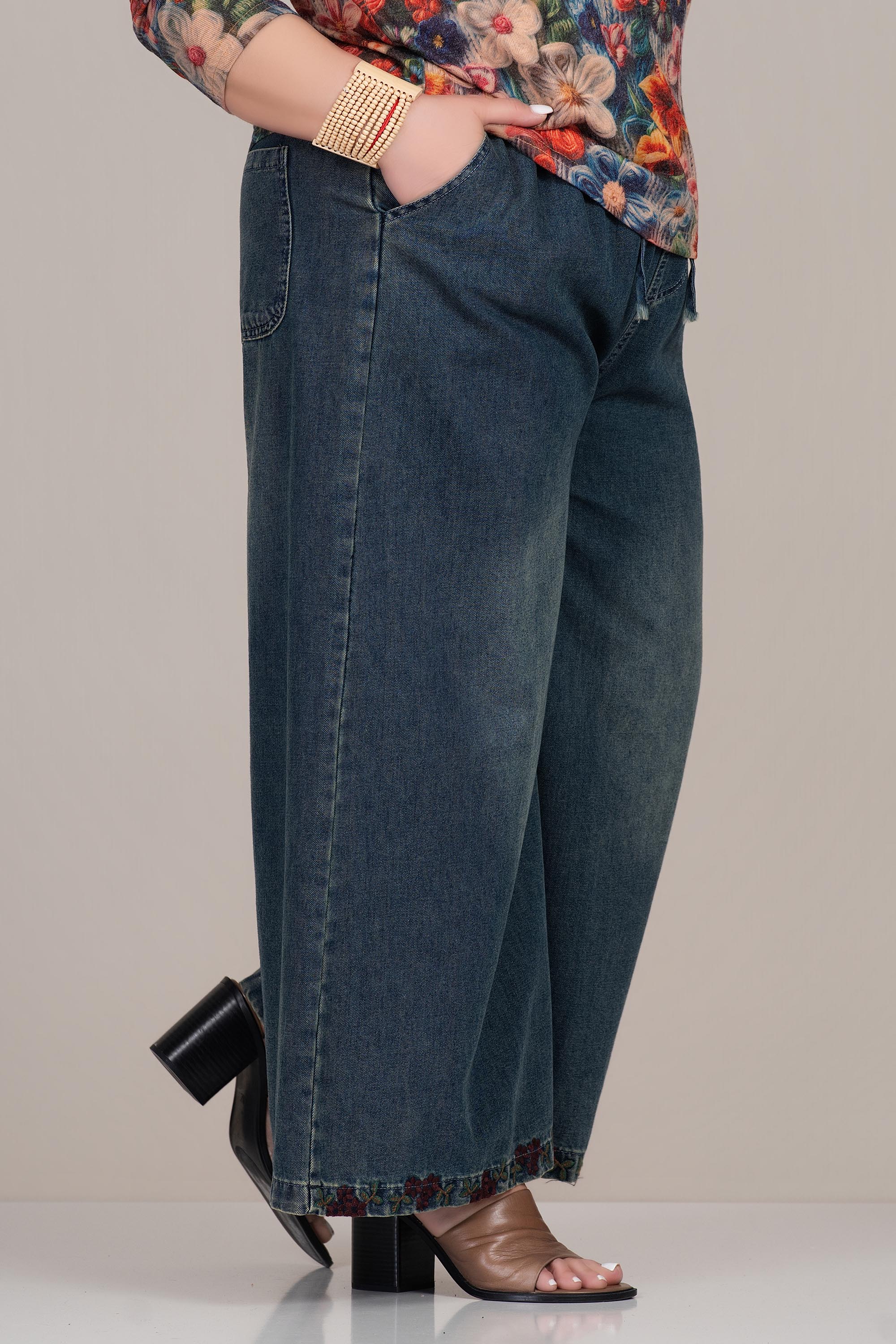 Актуален макси модел с подчертана модерна линия и комфорт. Денимът е устойчив и приятен на допир, осигуряващ удобство при ежедневно носене. Широкият крачол създава свободен силует, а еластичната талия с връзки гарантира добро прилягане. Бродираният подгъв добавя фин акцент и отличава визията.