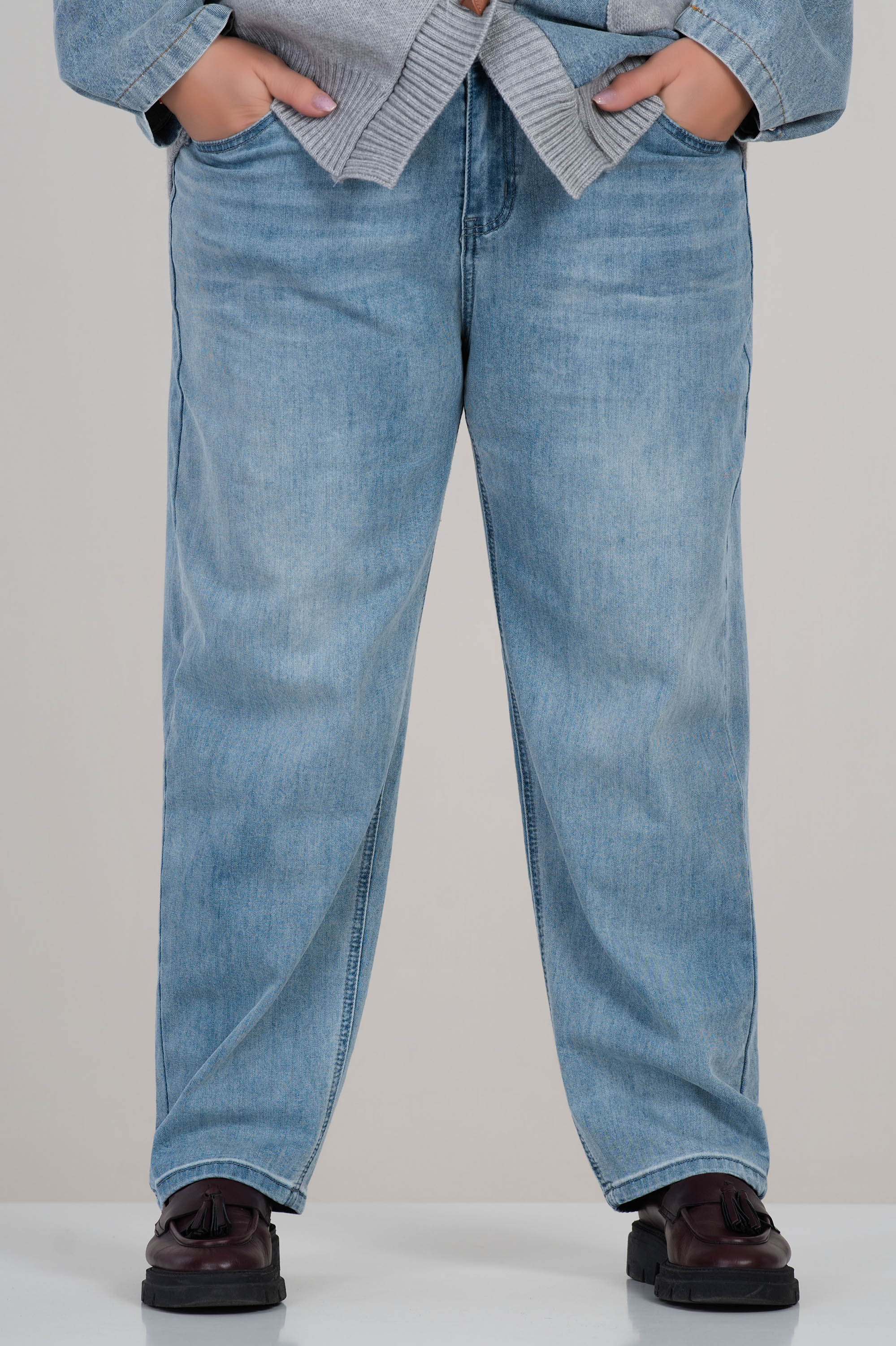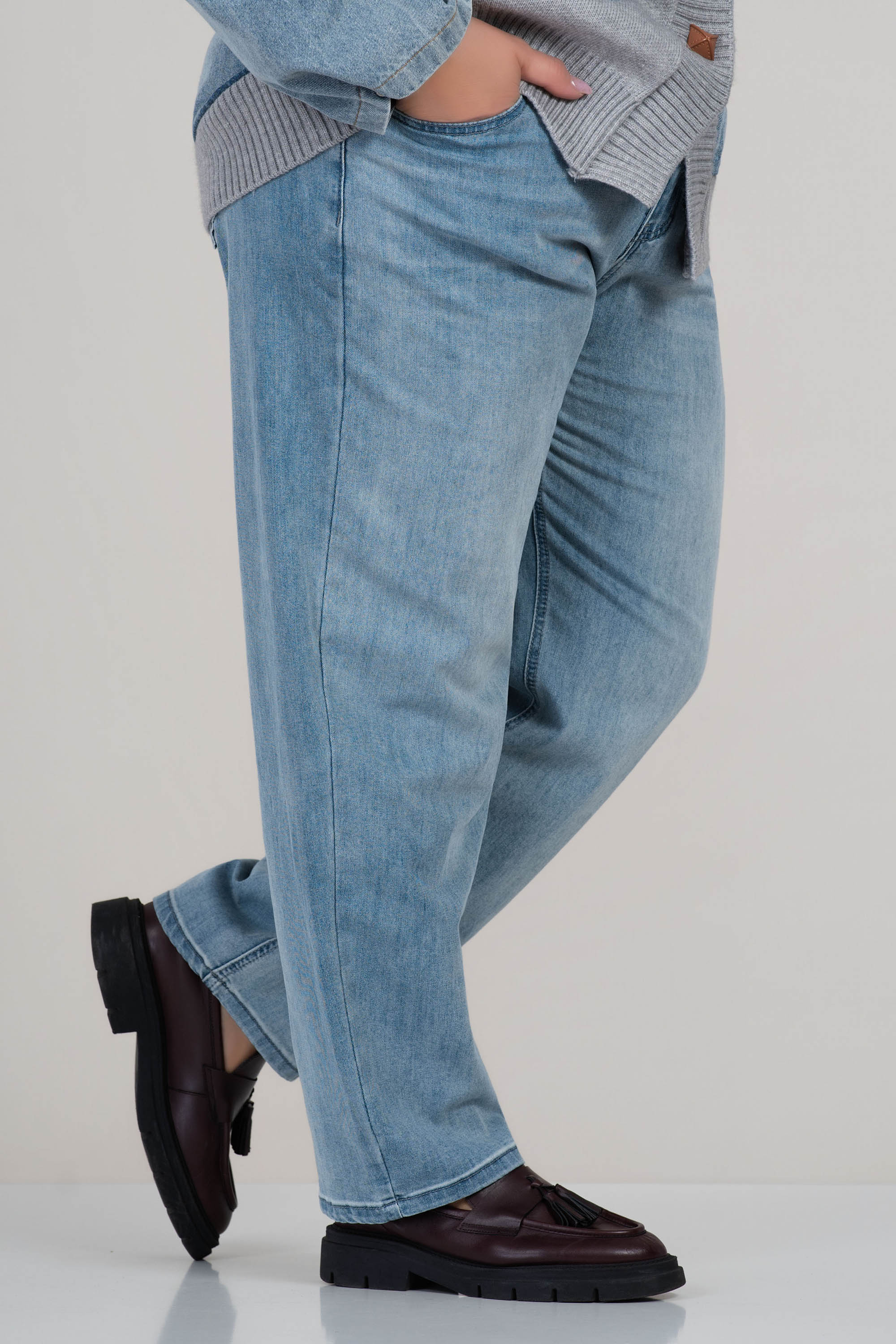 МАКСИ дънки в светлосиньо с ластик в кръста и бежова кожена емблема