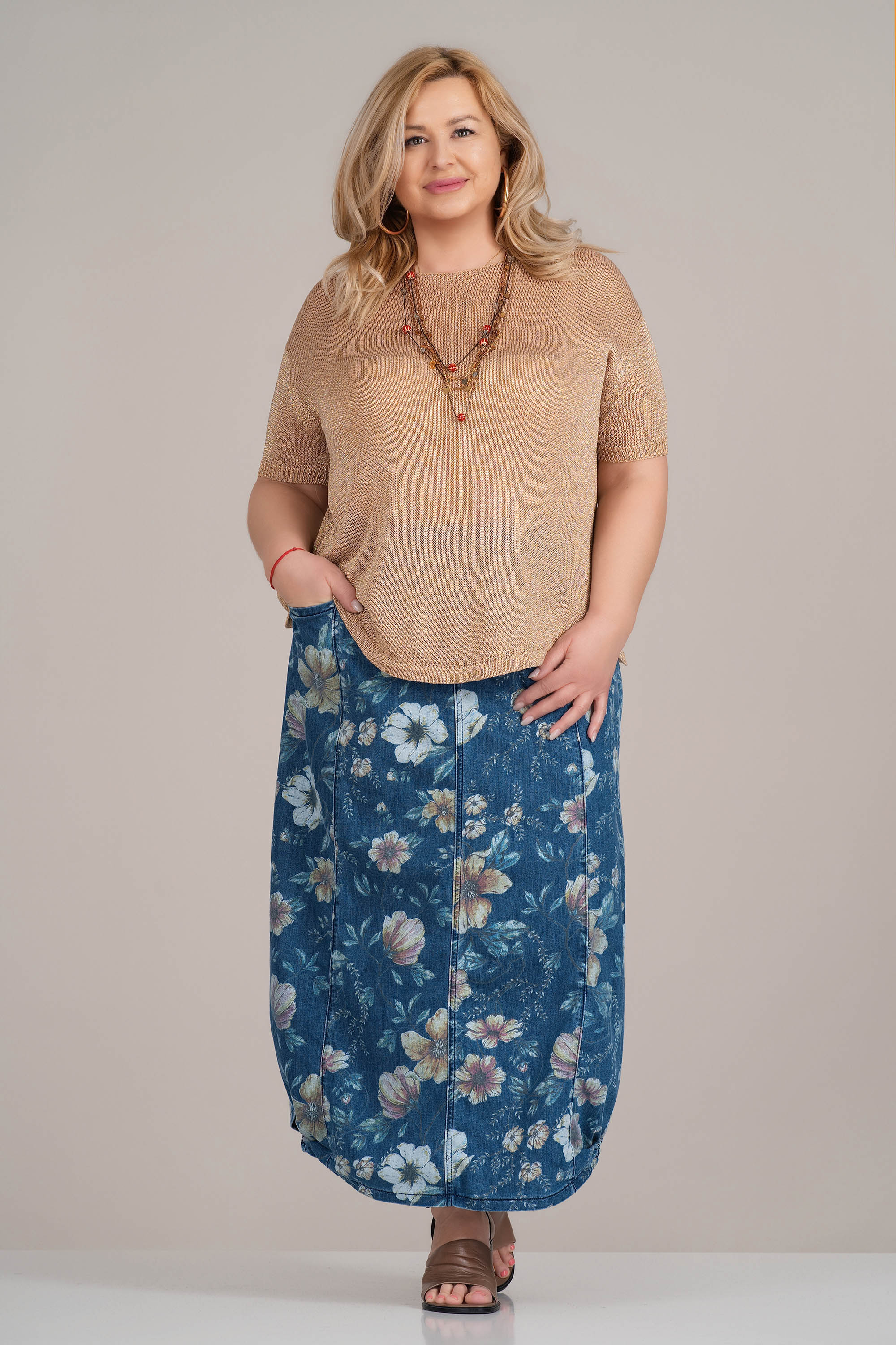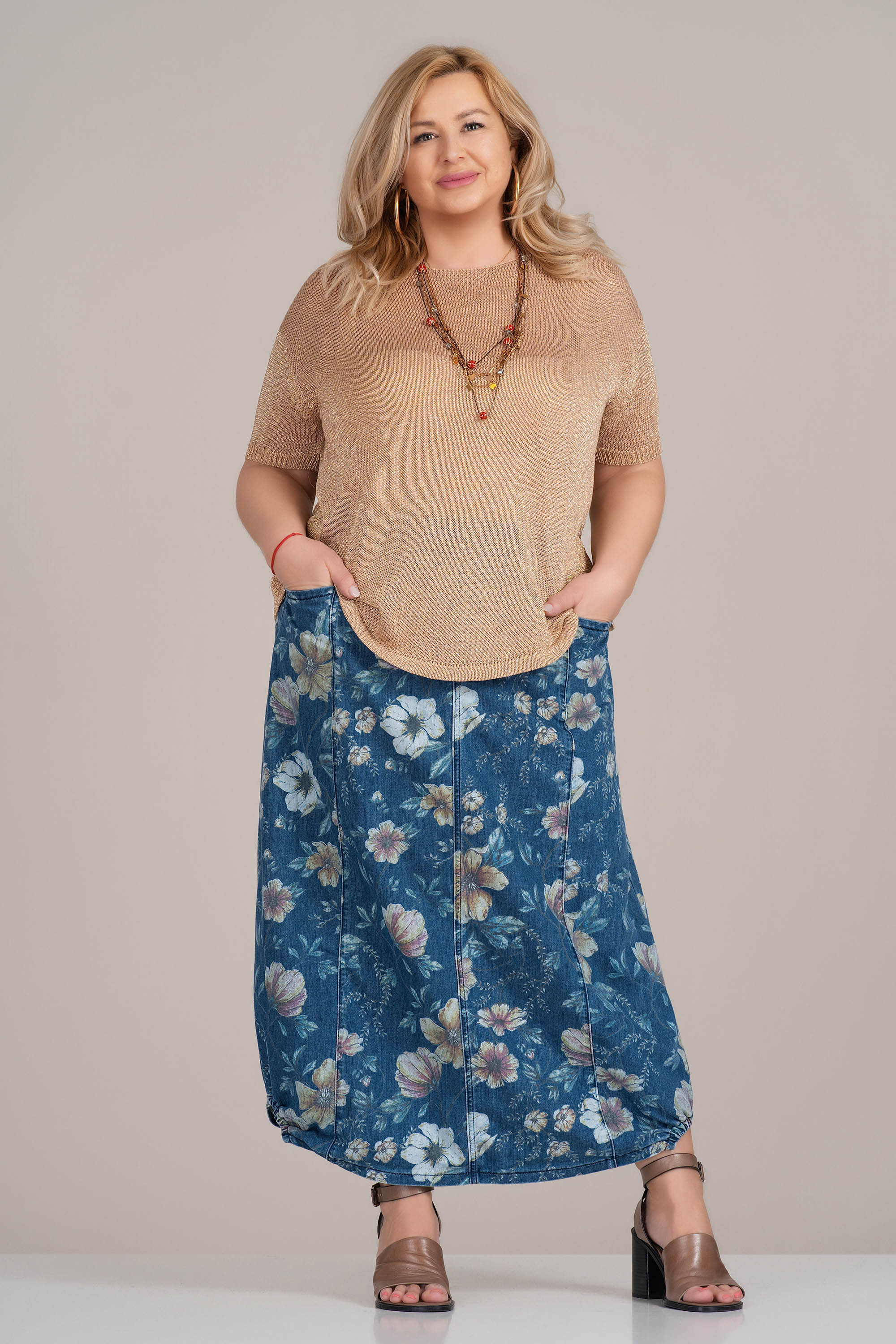 МАКСИ дънкова пола ''Dragonfly" в синьо с ластик в талията и флорален принт