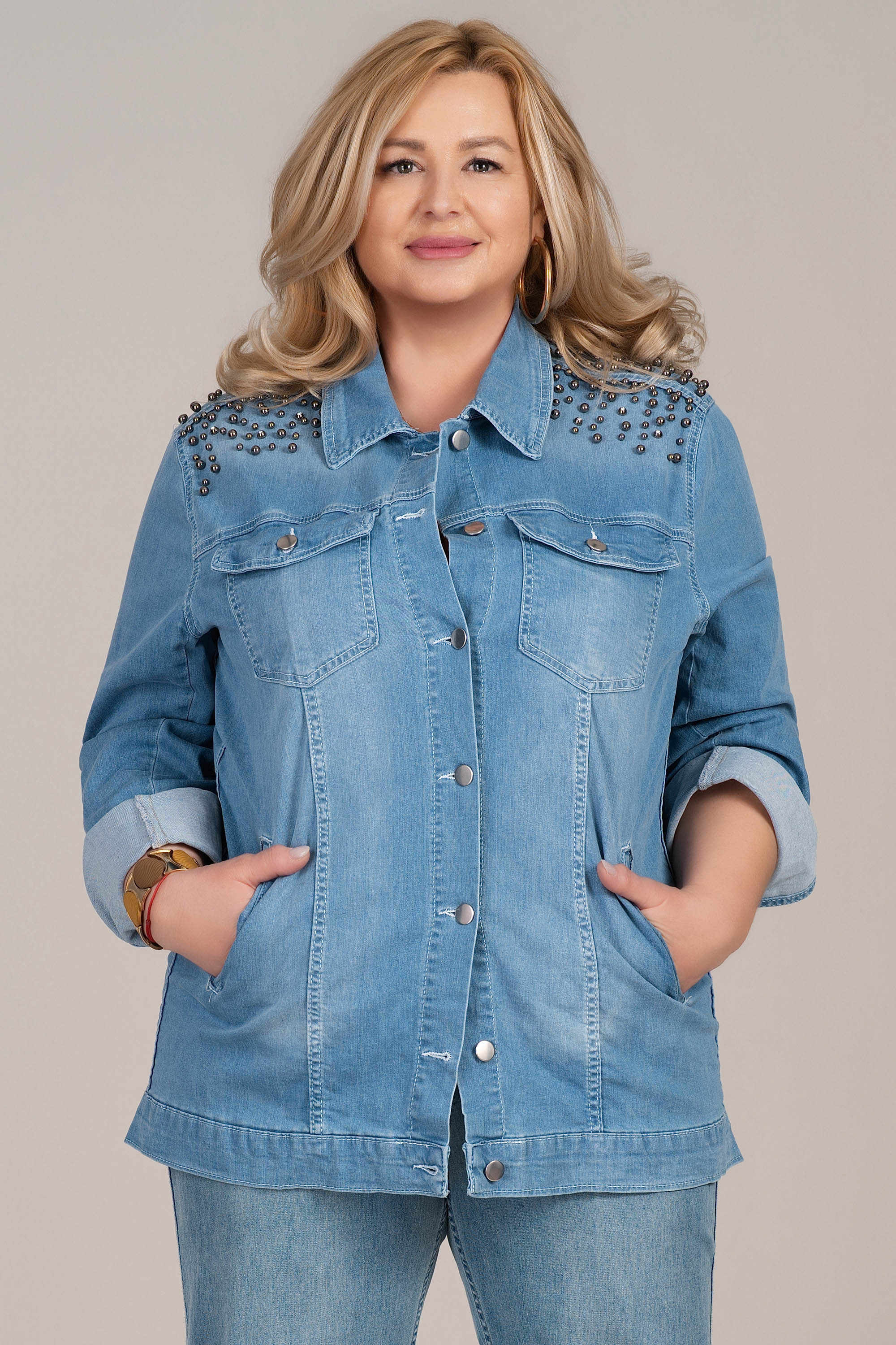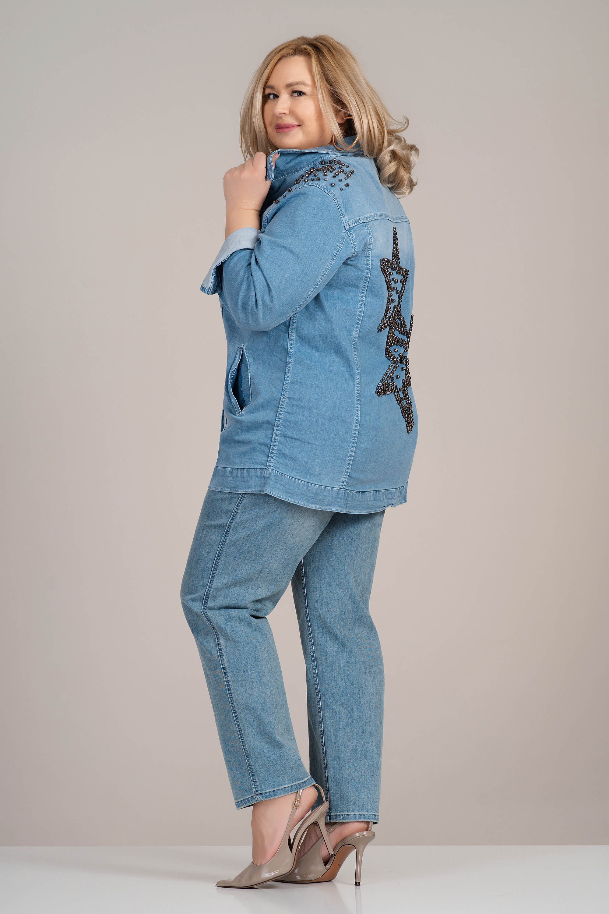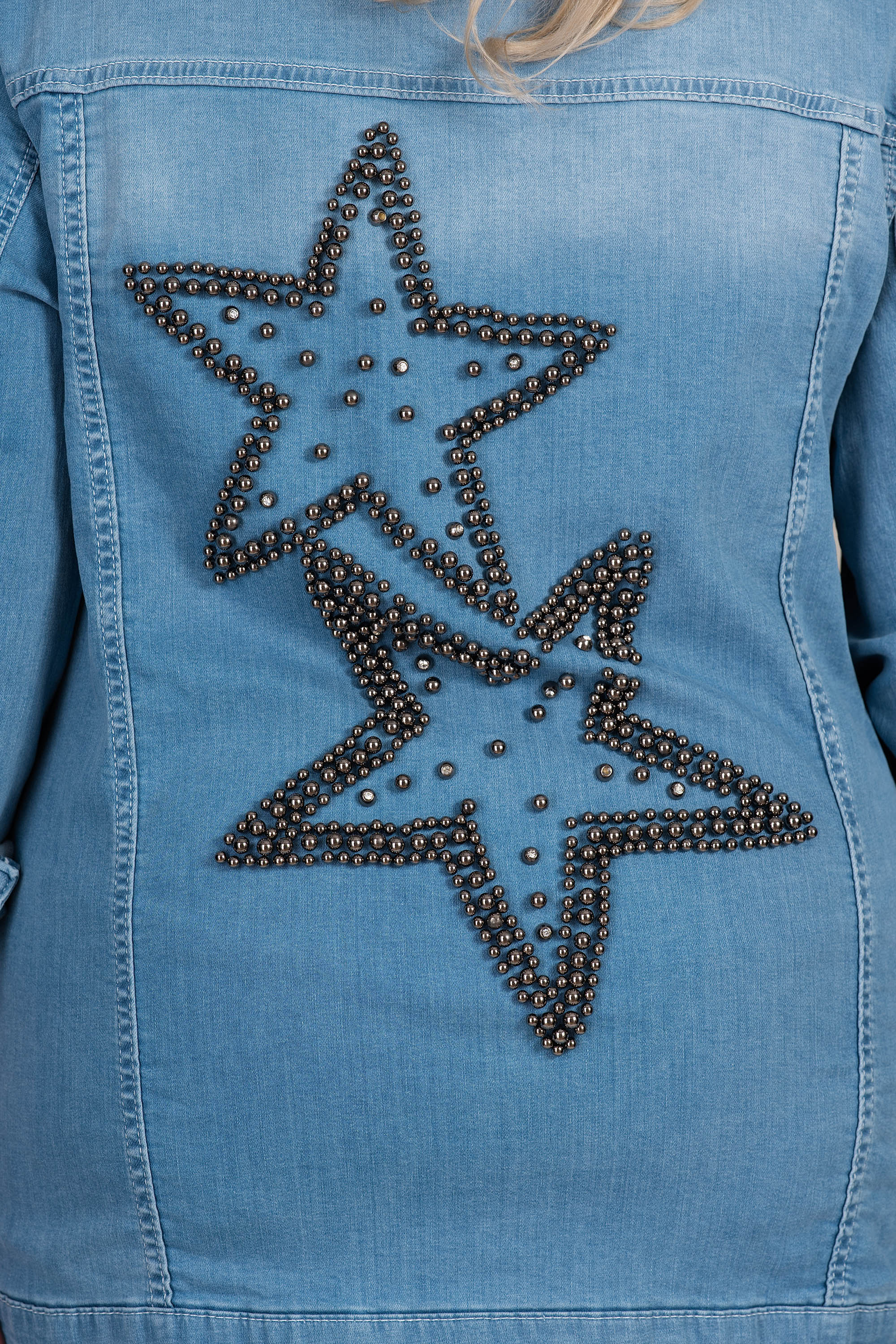 Това светлосиньо макси яке е модерно и удобно предложение за ежедневието. Изработено от мек еластичен деним, моделът осигурява комфорт и свобода на движение. Металните капси по раменете и декоративният мотив от звезди на гърба придават отличителен характер и индивидуалност. Комбинира се лесно с дънки или панталон и е отличен избор за пролет и есен.