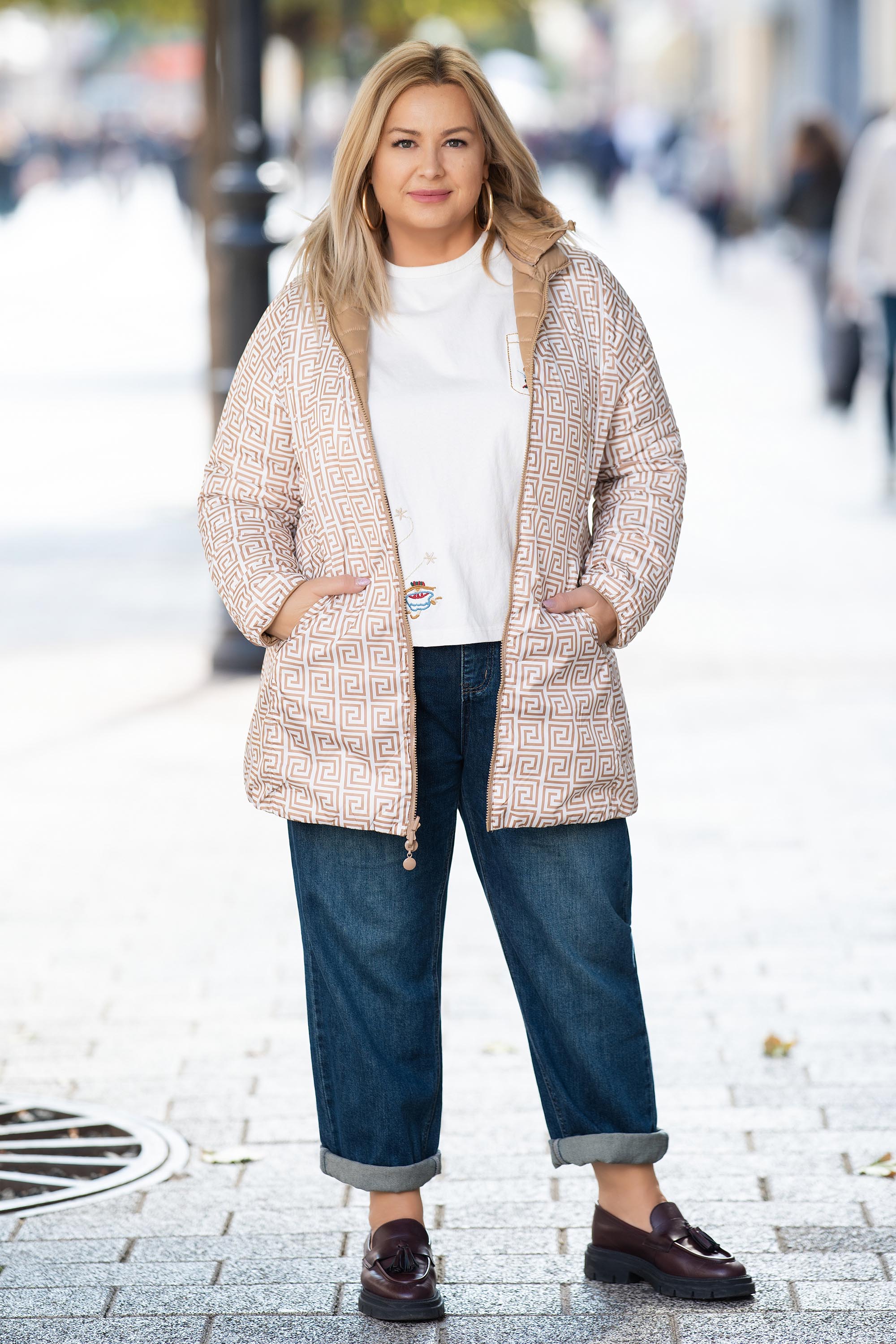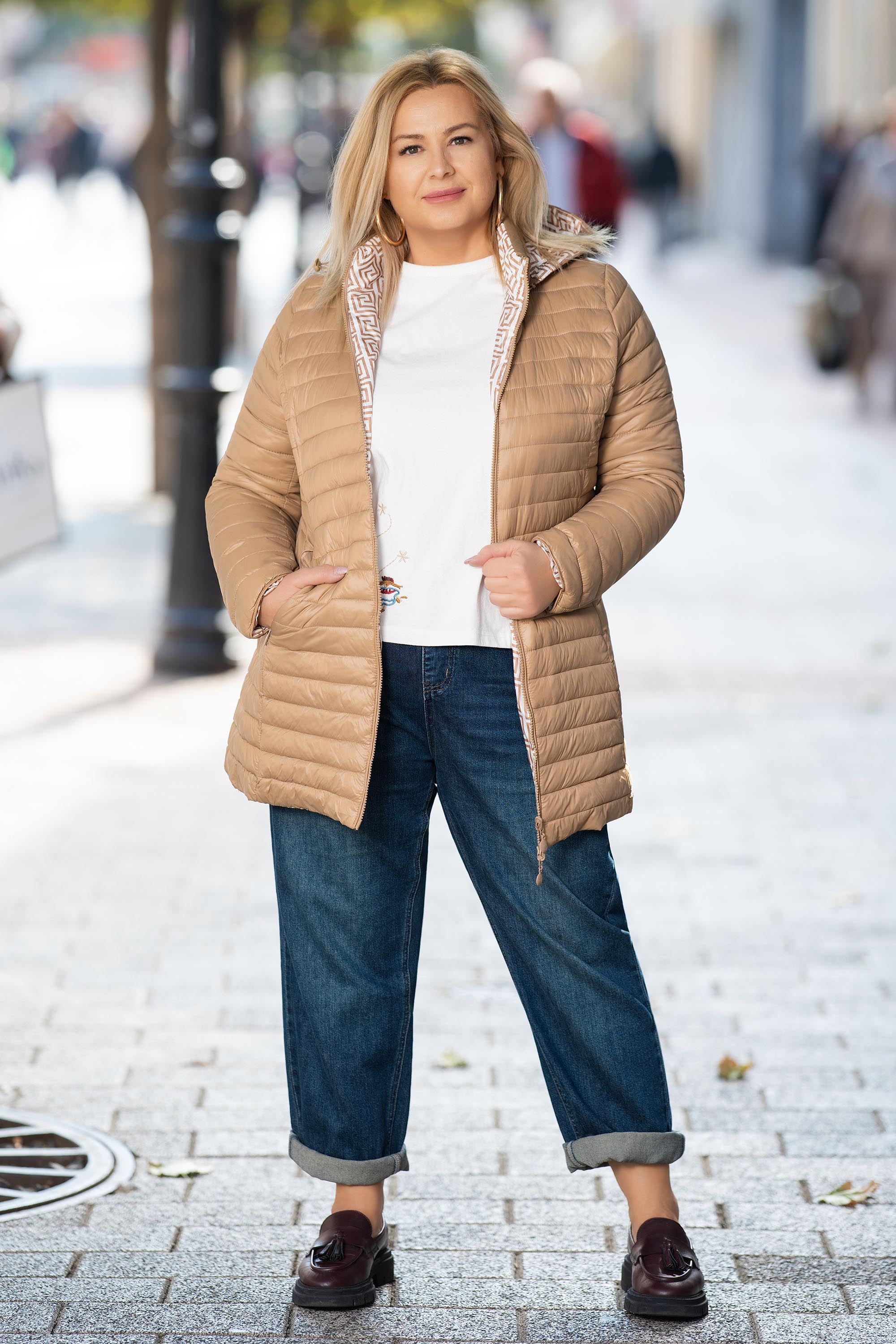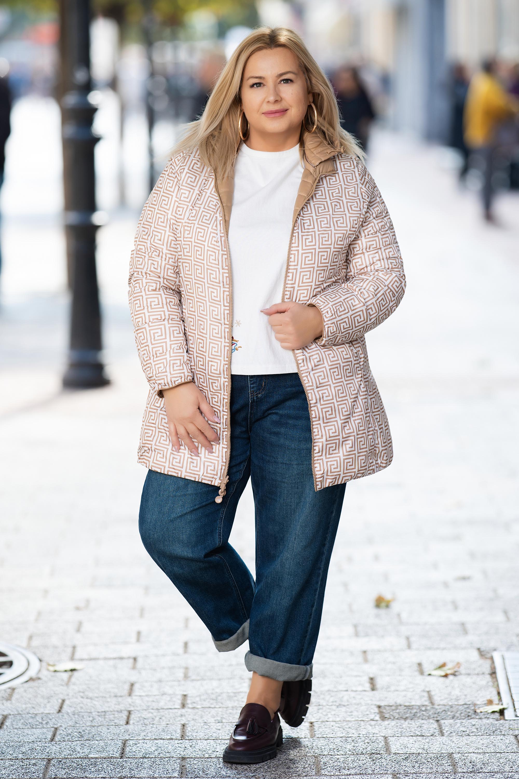 Това двулицево макси яке е съчетание от стил, практичност и комфорт – перфектният избор за динамичното ежедневие. Едната страна е в изчистен, елегантен бежов цвят, а другата впечатлява с модерен геометричен принт в кремаво и светлобежово. Така можеш лесно да променяш визията си – от класическа до ефектна, само с едно обръщане. Моделът е лек, топъл и изключително удобен, изработен от висококачествена материя с мека подплата, подходящ за преходните сезони. Кройката е права и свободна, което осигурява комфорт и свобода на движение, а дължината покрива ханша за допълнителна защита от студа. Якето се закопчава с двупосочен цип и има практични странични джобове. Стилно и функционално, това яке ще допълни чудесно твоя гардероб и ще се превърне в любим избор за есенните и пролетни дни.