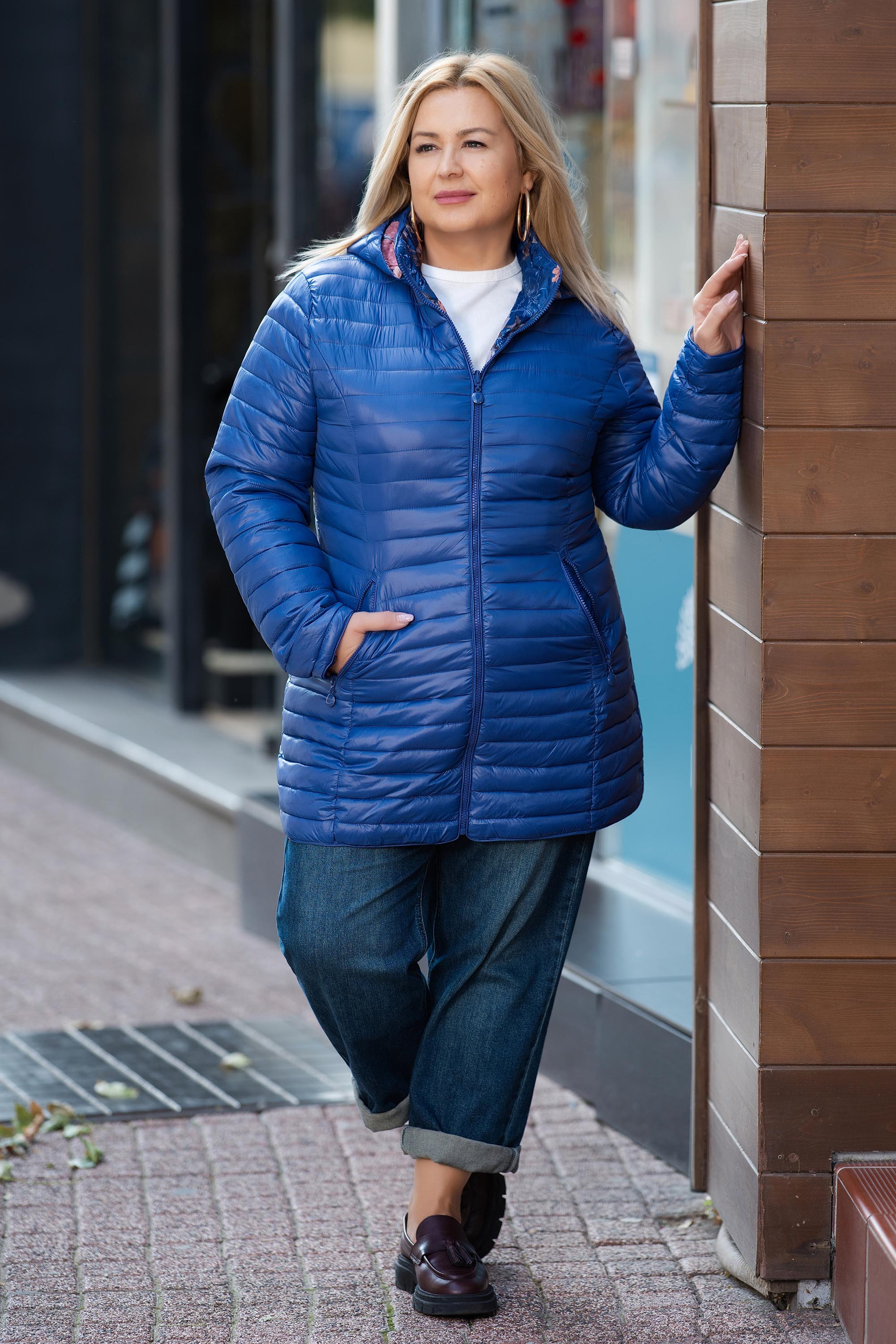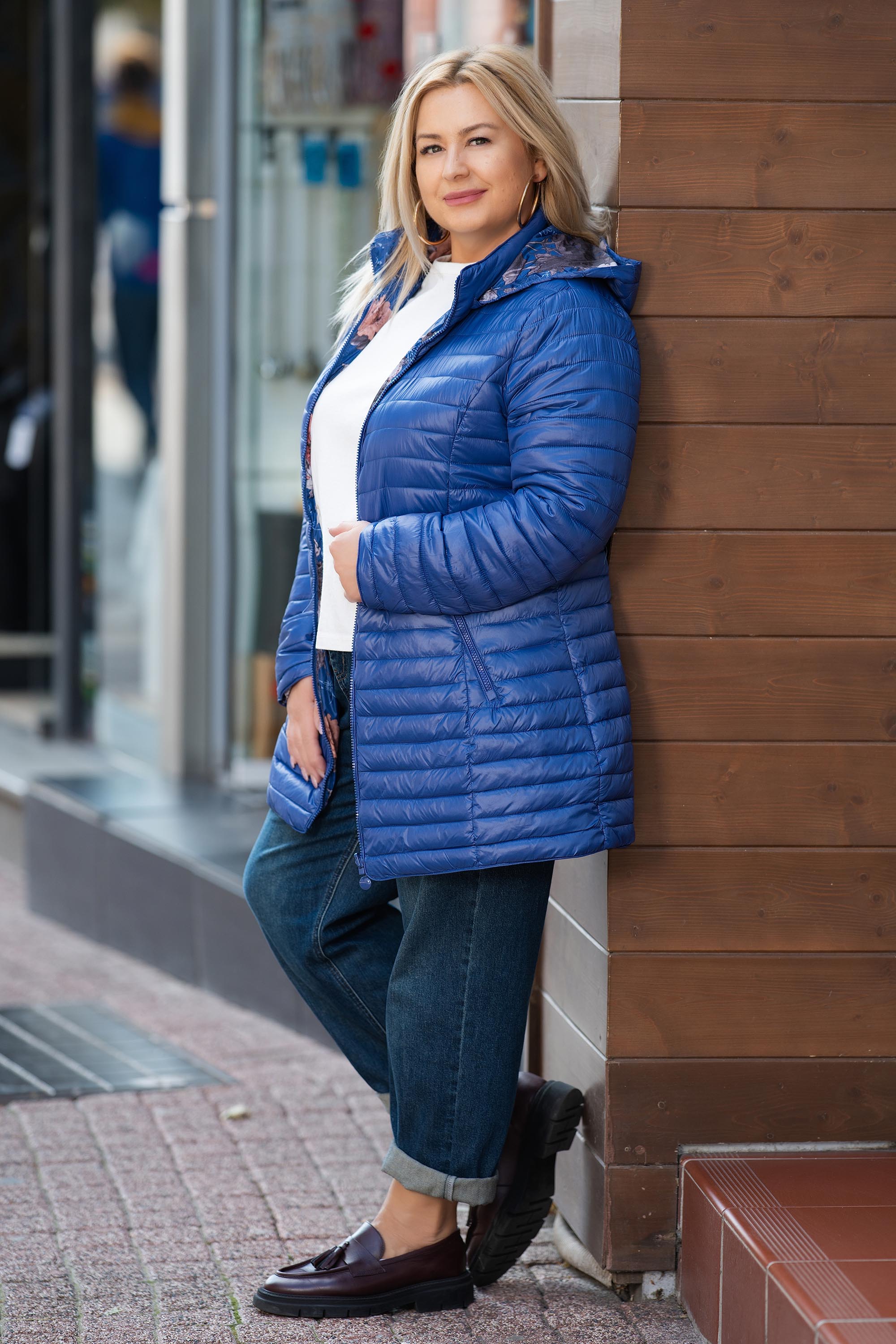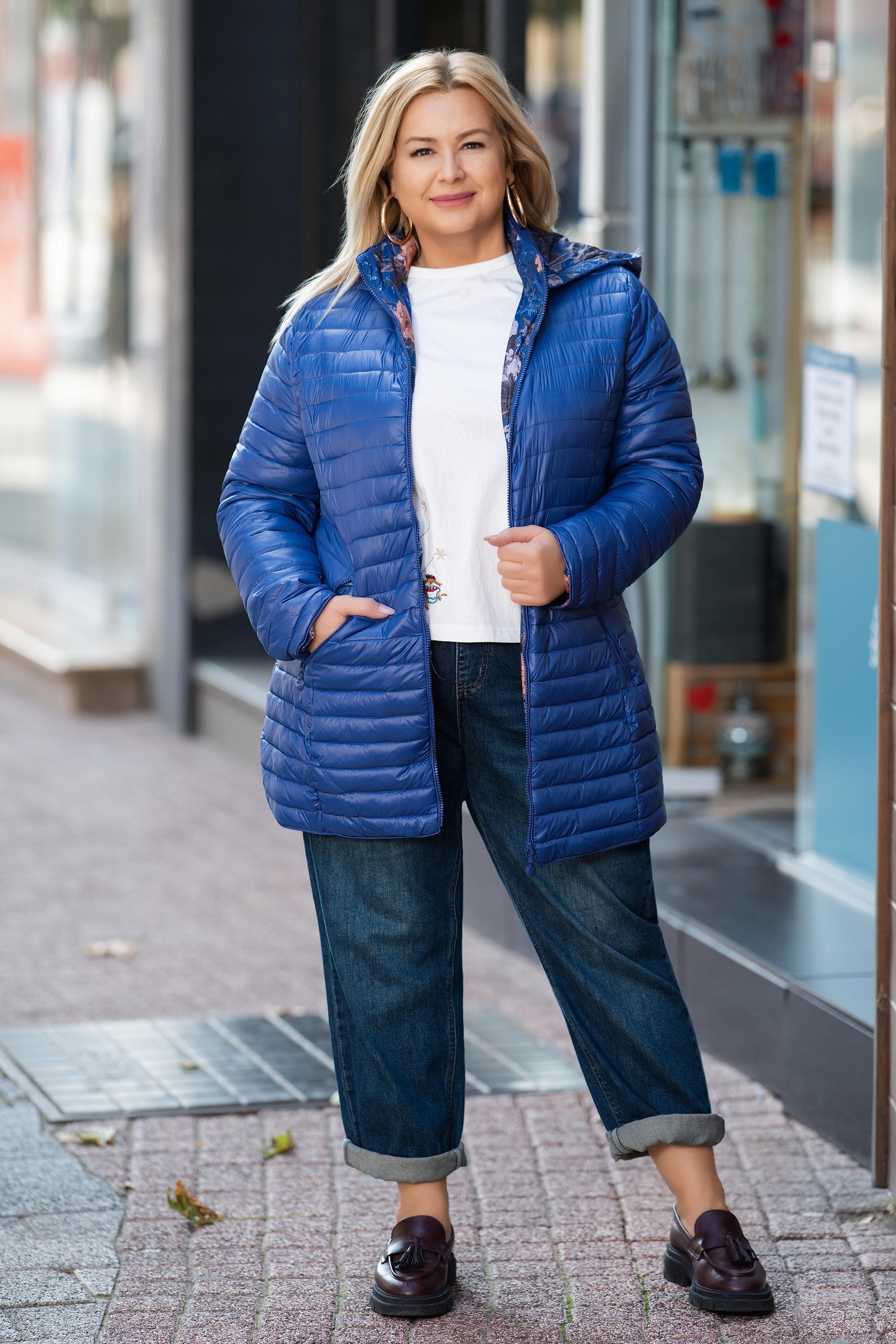 МАКСИ двулицево яке в синьо с флорална подплата