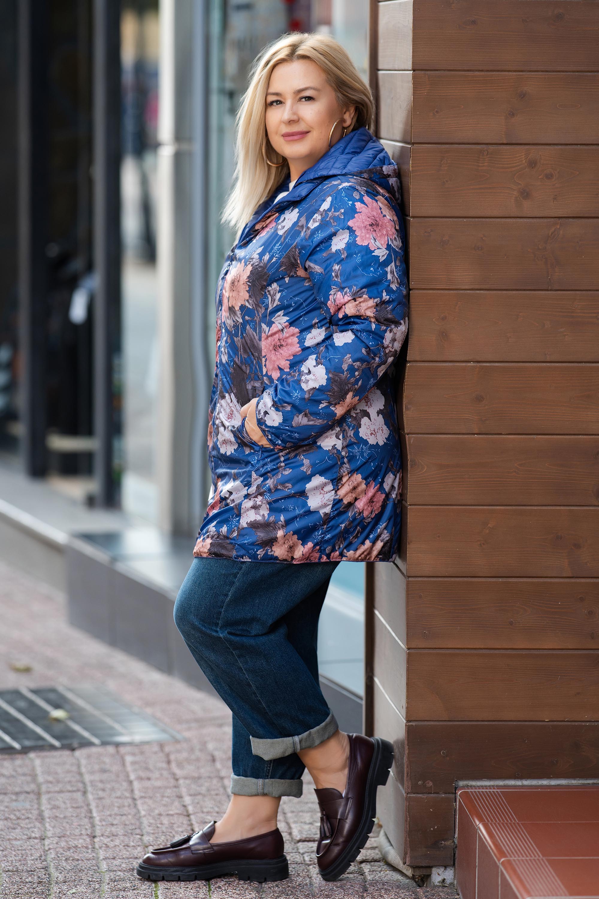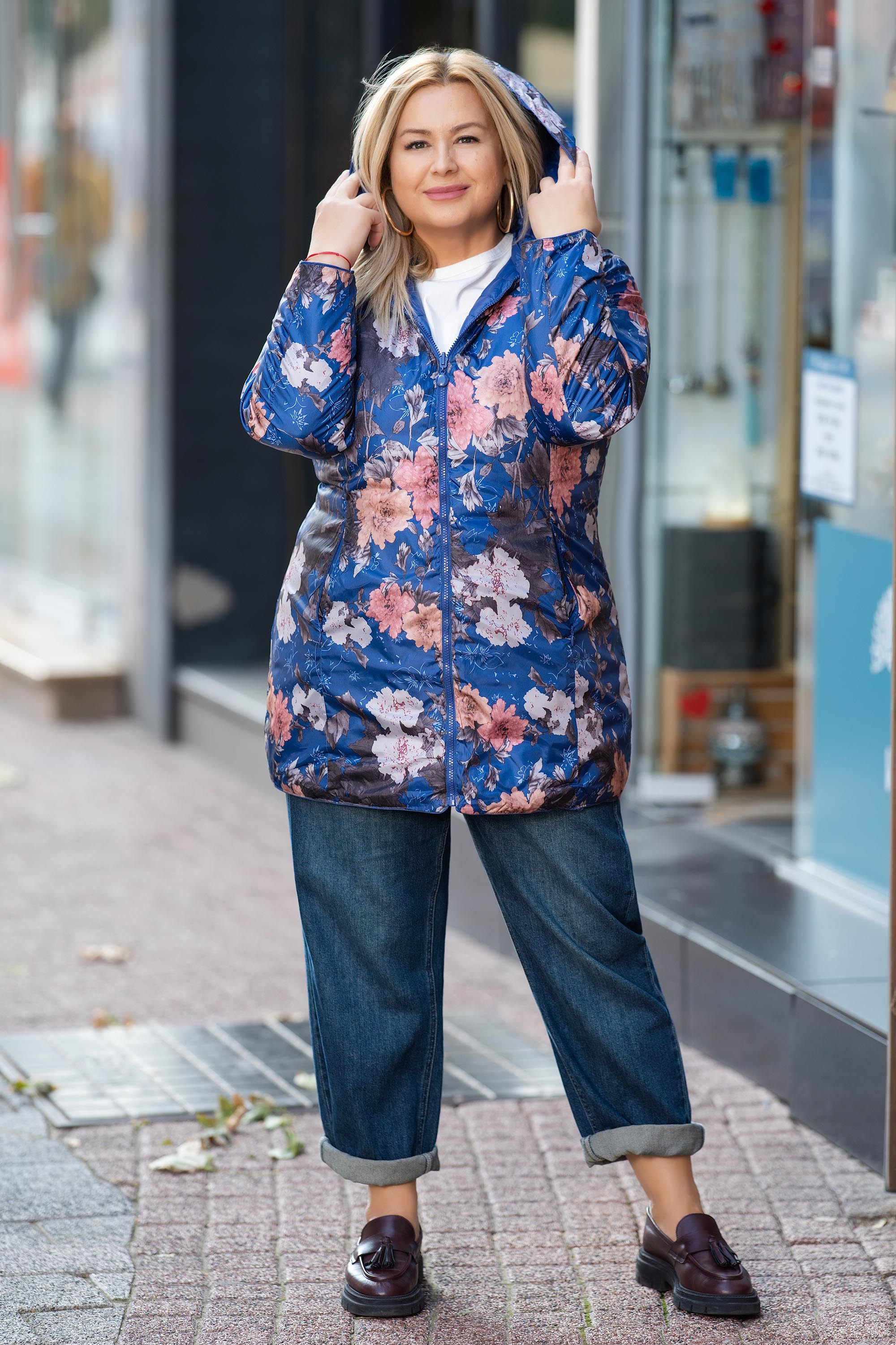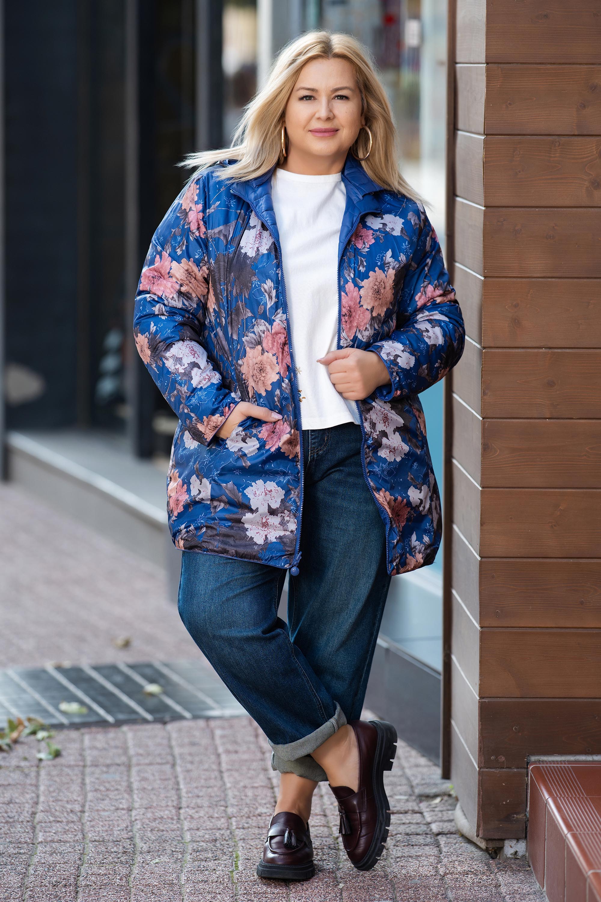 Модерно и практично двулицево яке, което предлага две различни визии в едно. Едната страна е в изчистен класически син цвят, а другата – с ефектен флорален принт в нежни розови и лилави нюанси. Якето е леко, удобно и топло, с права кройка и дължина до ханша. Разполага с практични джобове и се закопчава с двупосочен цип. Перфектен избор за ежедневие, разходки и пътувания през преходните сезони.