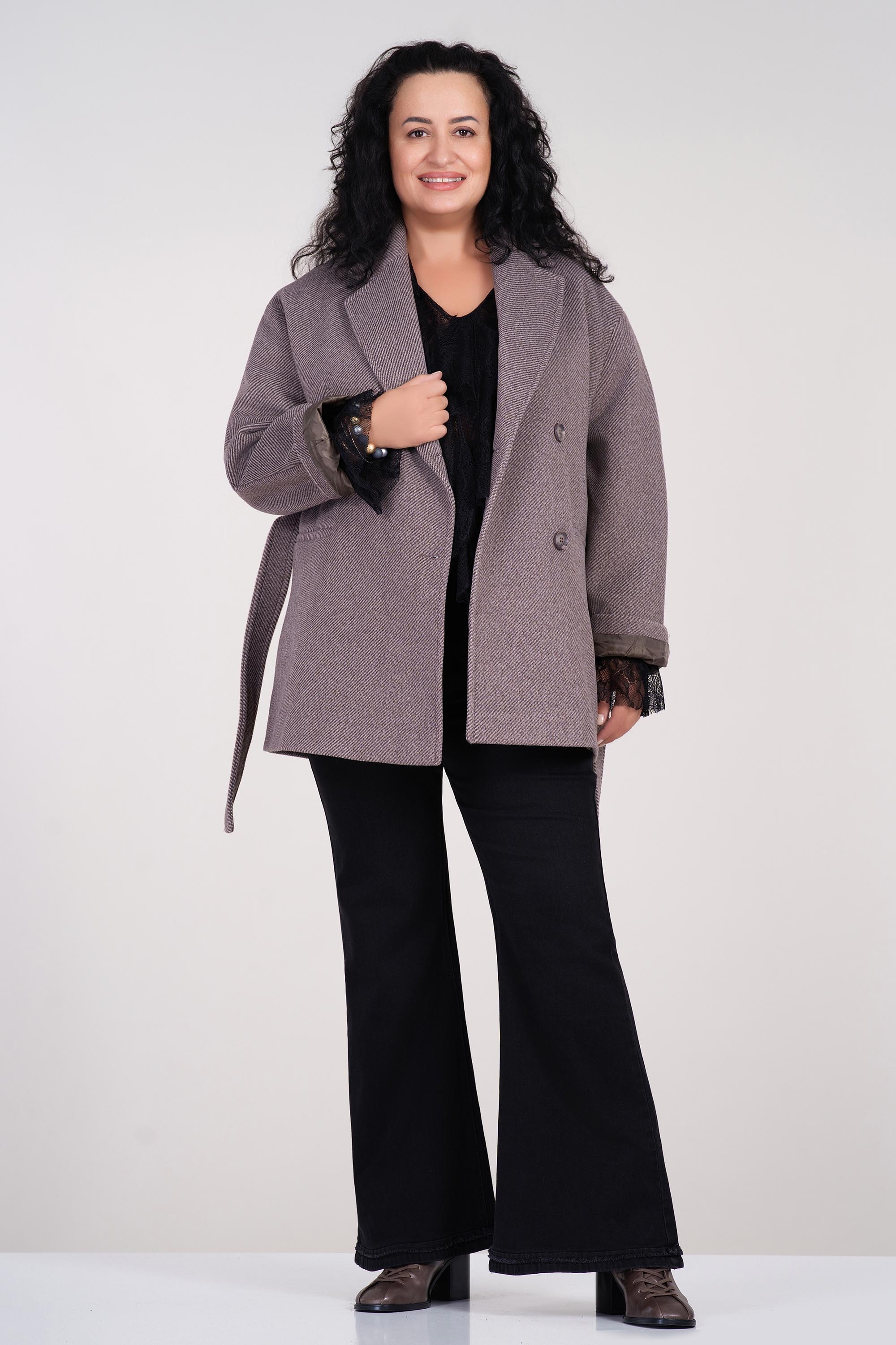 Топло и стилно макси палто, изработено от мек полиестер с приятна на допир текстура. Дизайнът е подчертан с класическа ревер яка, колан на талията и двойни копчета за женствена и елегантна визия. Късата дължина придава лекота и свобода на движение – идеален избор за ежедневието през есента и зимата.
