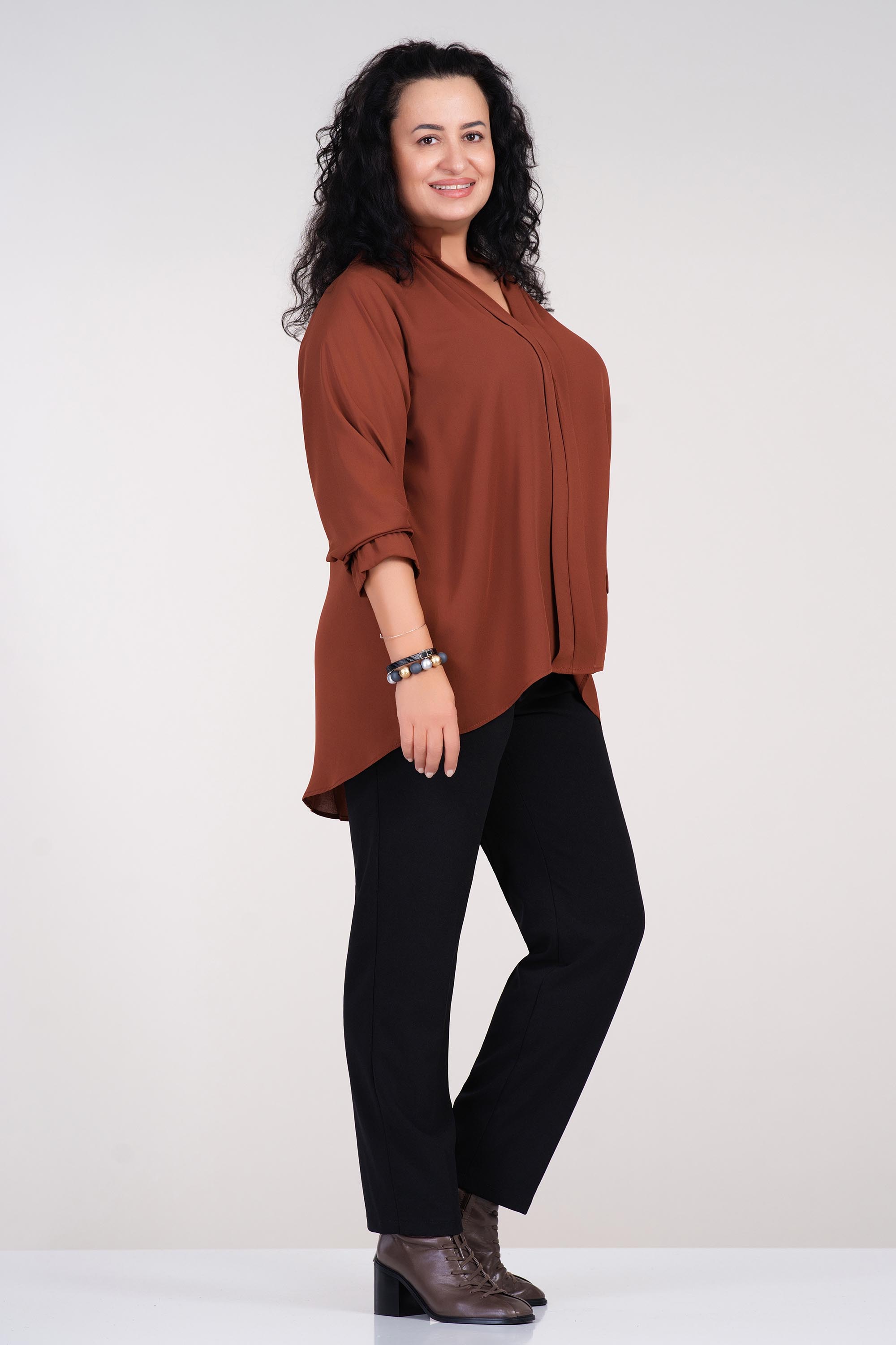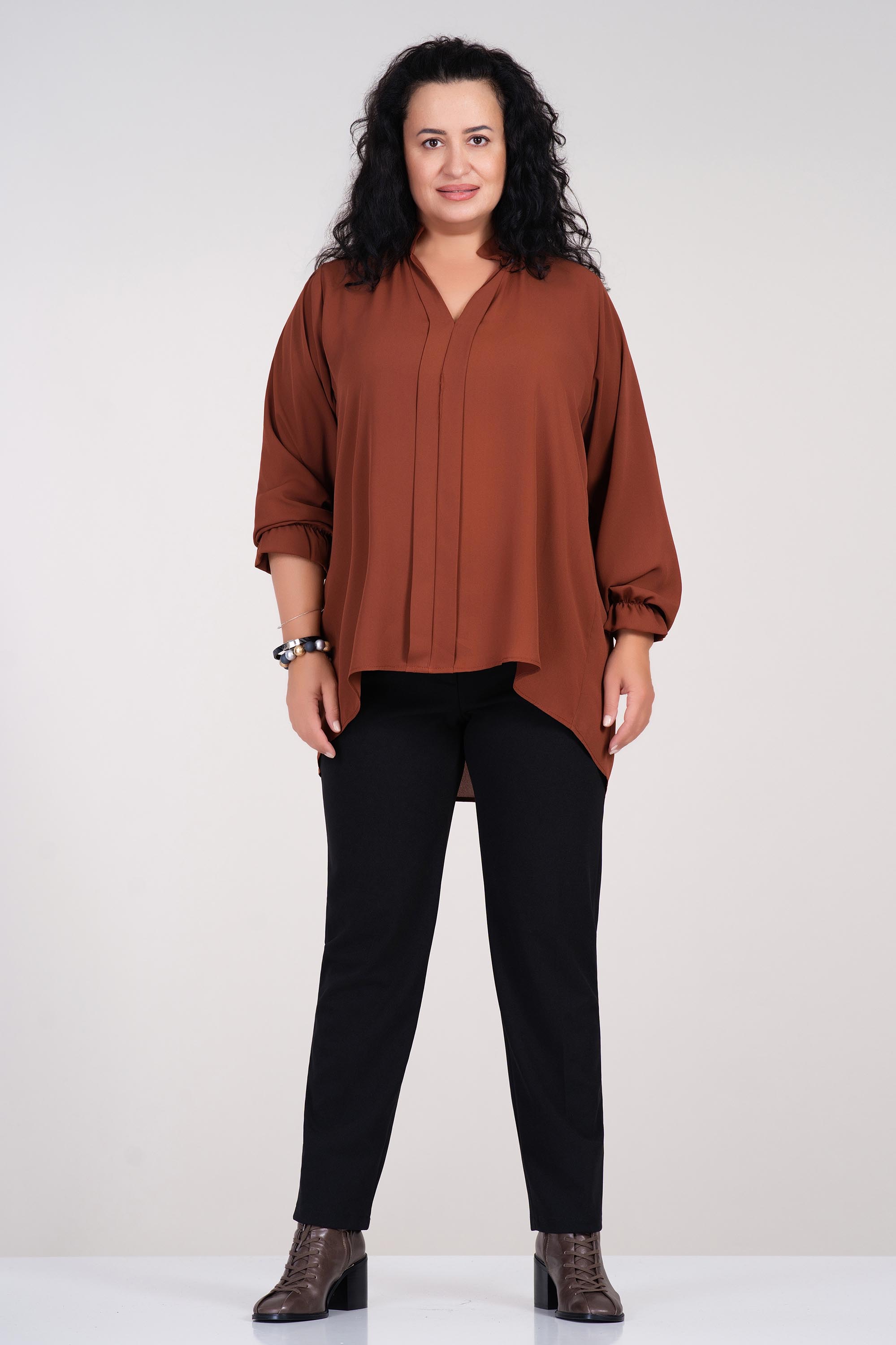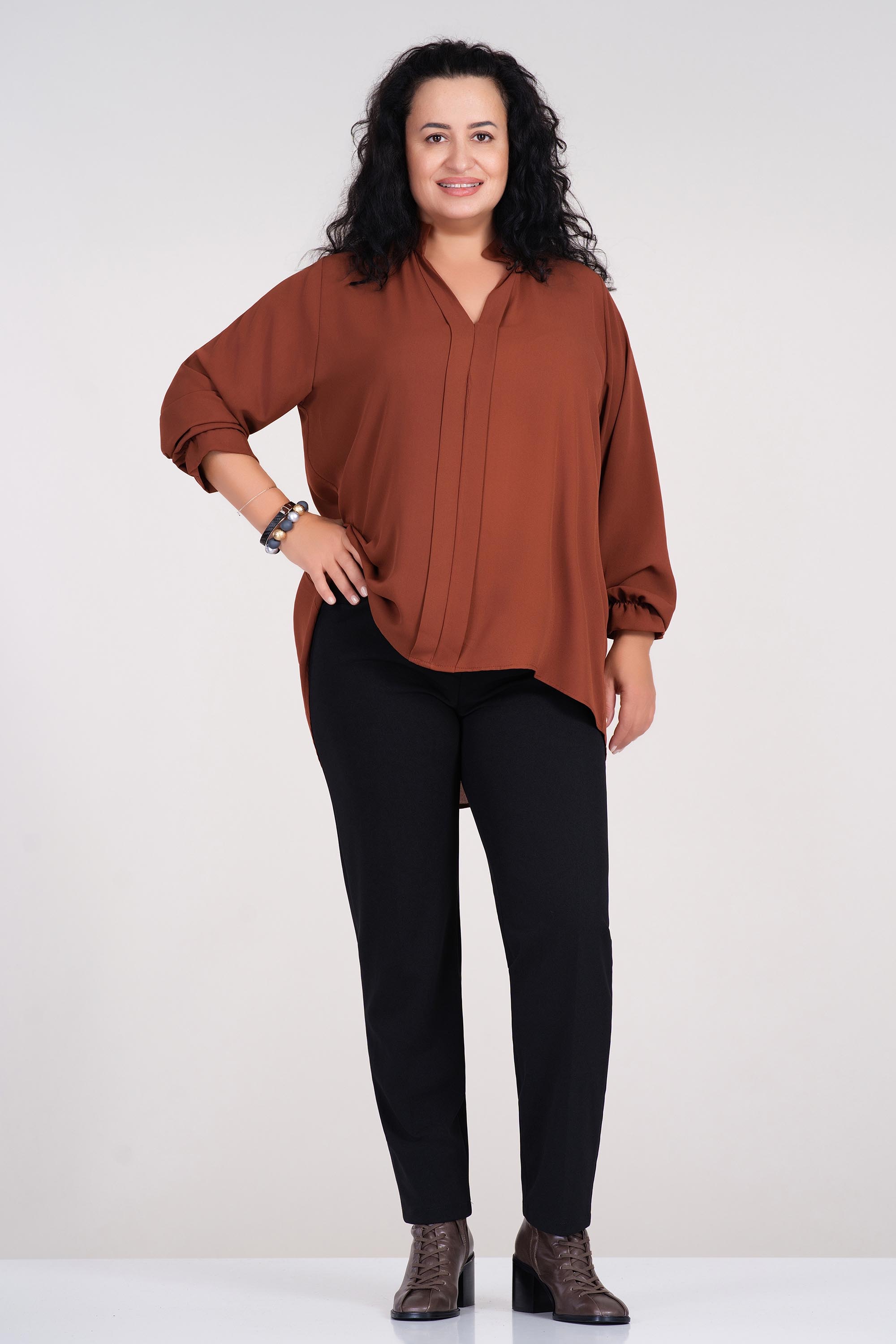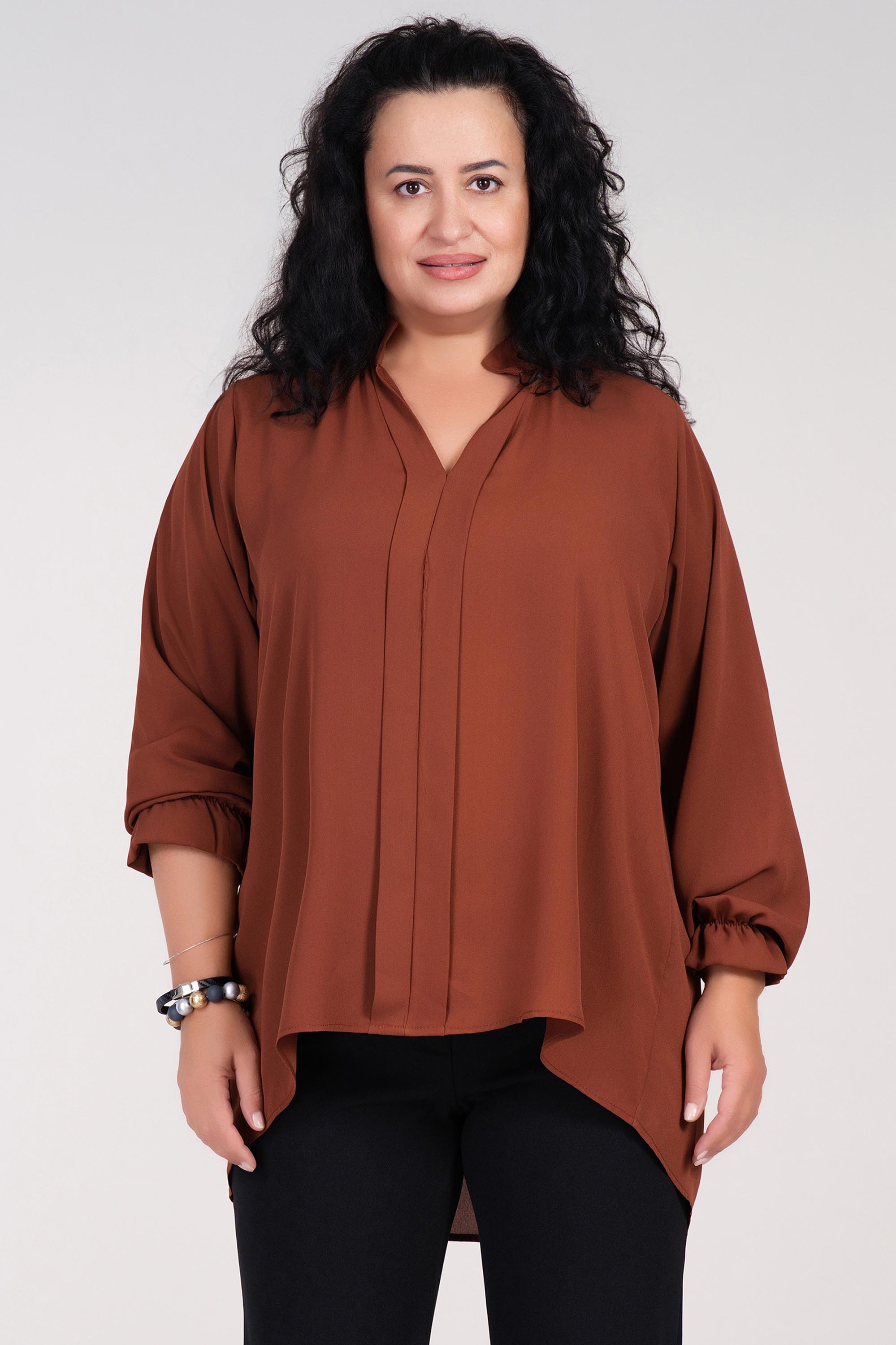 Елегантна макси туника в кафяв цвят, изработена от ефирна материя. Осторто деколте създава издължен силует, а кантът отпред добавя фин акцент. Свободната кройка осигурява комфорт през целия ден. Подходяща както за ежедневна визия, така и за офис стил.