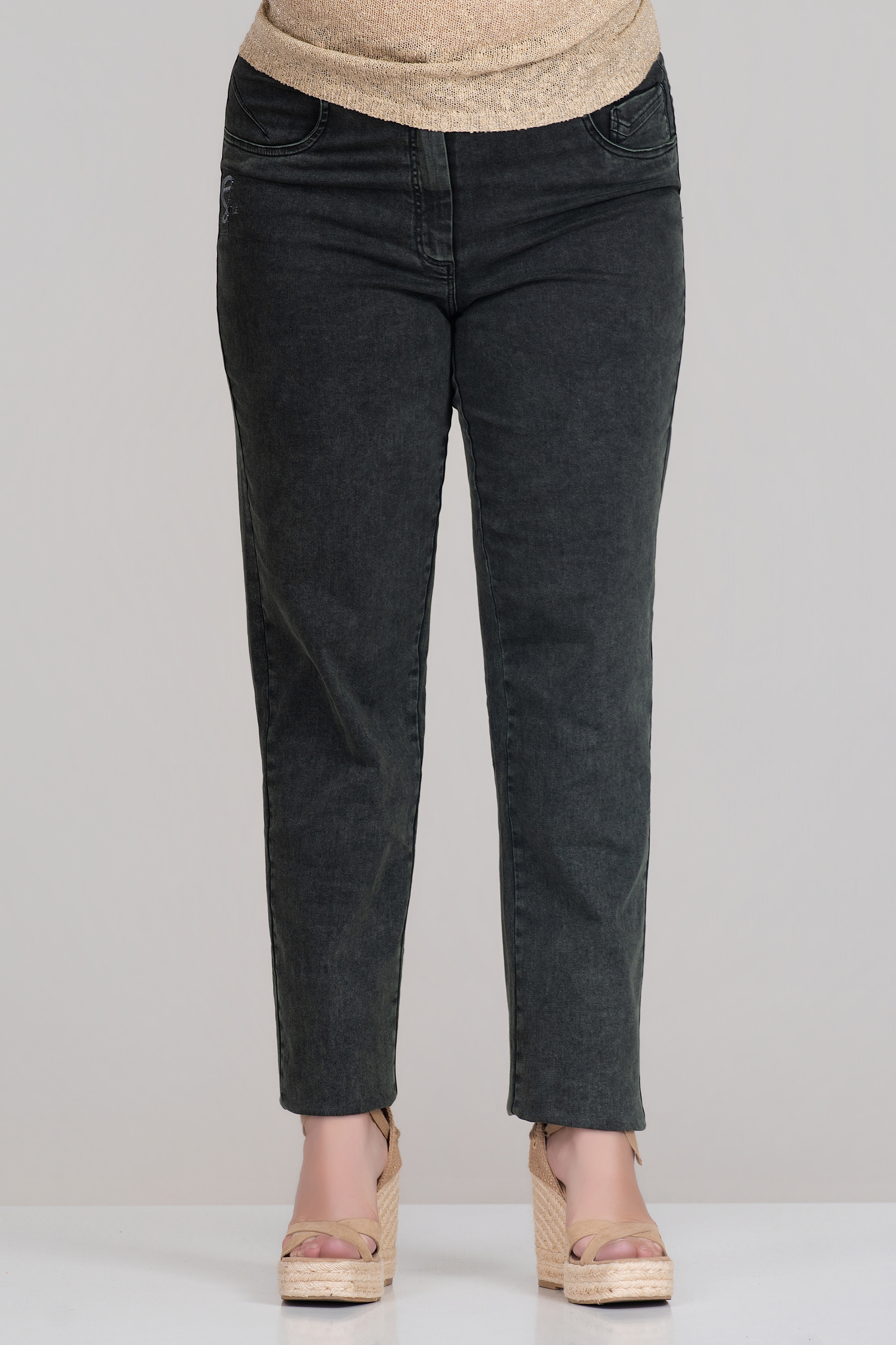 Макси еластични дънки от памук в зелено с малка бродерия