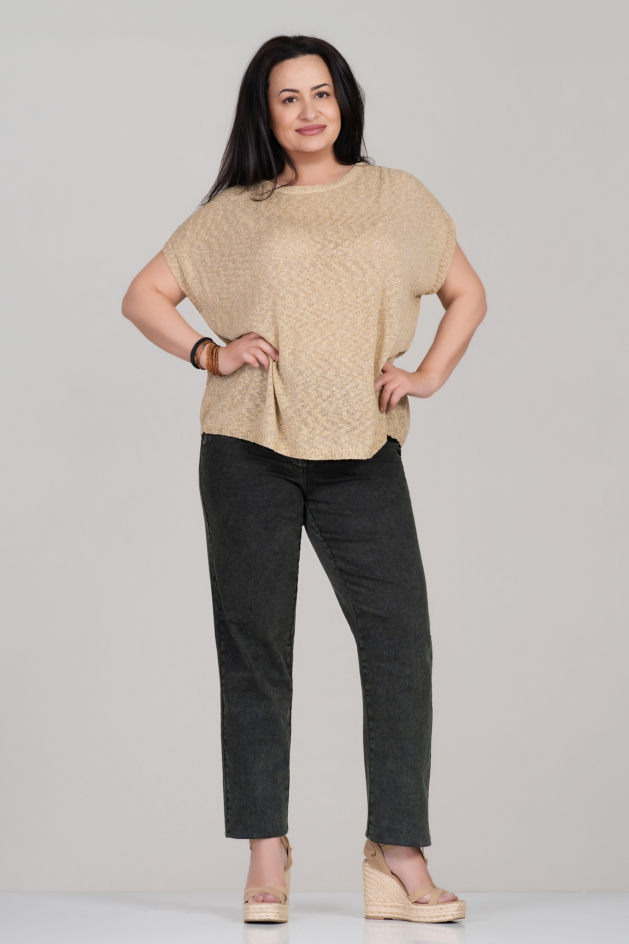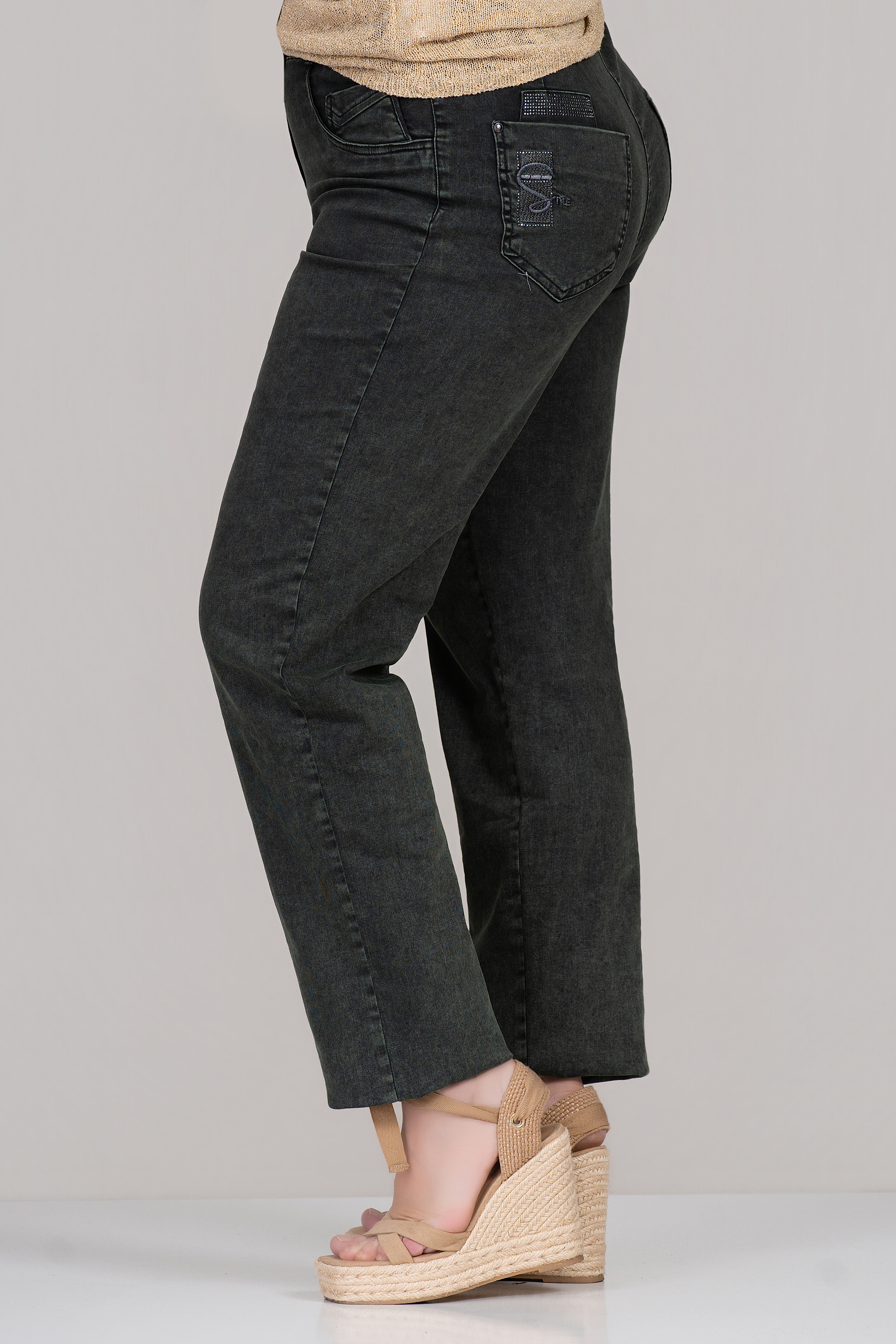 Модерен макси модел дънки в тъмнозелен нюанс, съчетаващ комфорт и стилно излъчване. Материята с високо съдържание на памук осигурява мекота и добра въздухопропускливост, а еластанът допринася за гъвкавост и удобно прилягане. Частичният ластик в талията гарантира комфорт при носене, а бродираният надпис и пайетите добавят отличителен акцент. Подходящ избор за ежедневни визии с характер.
