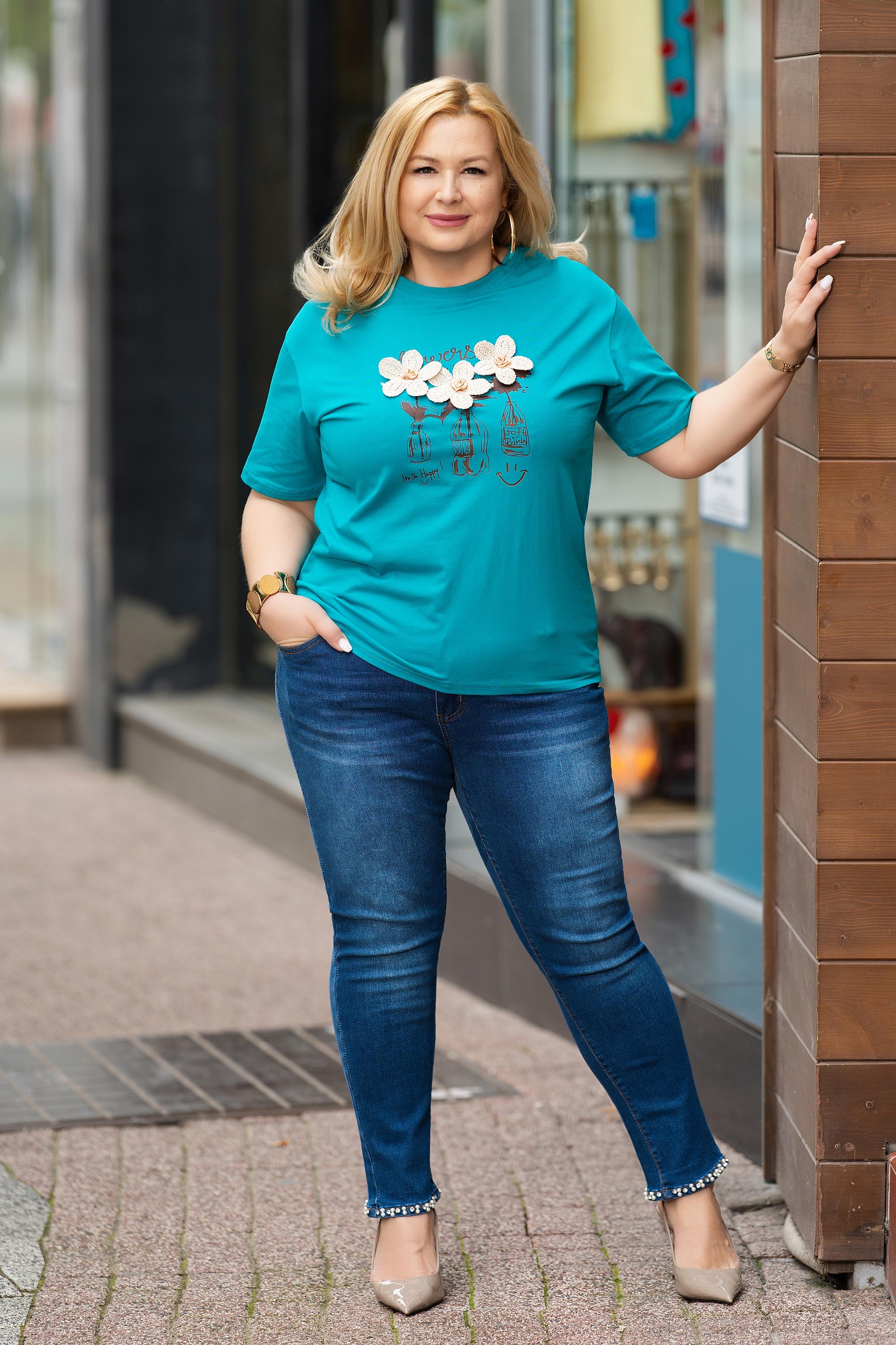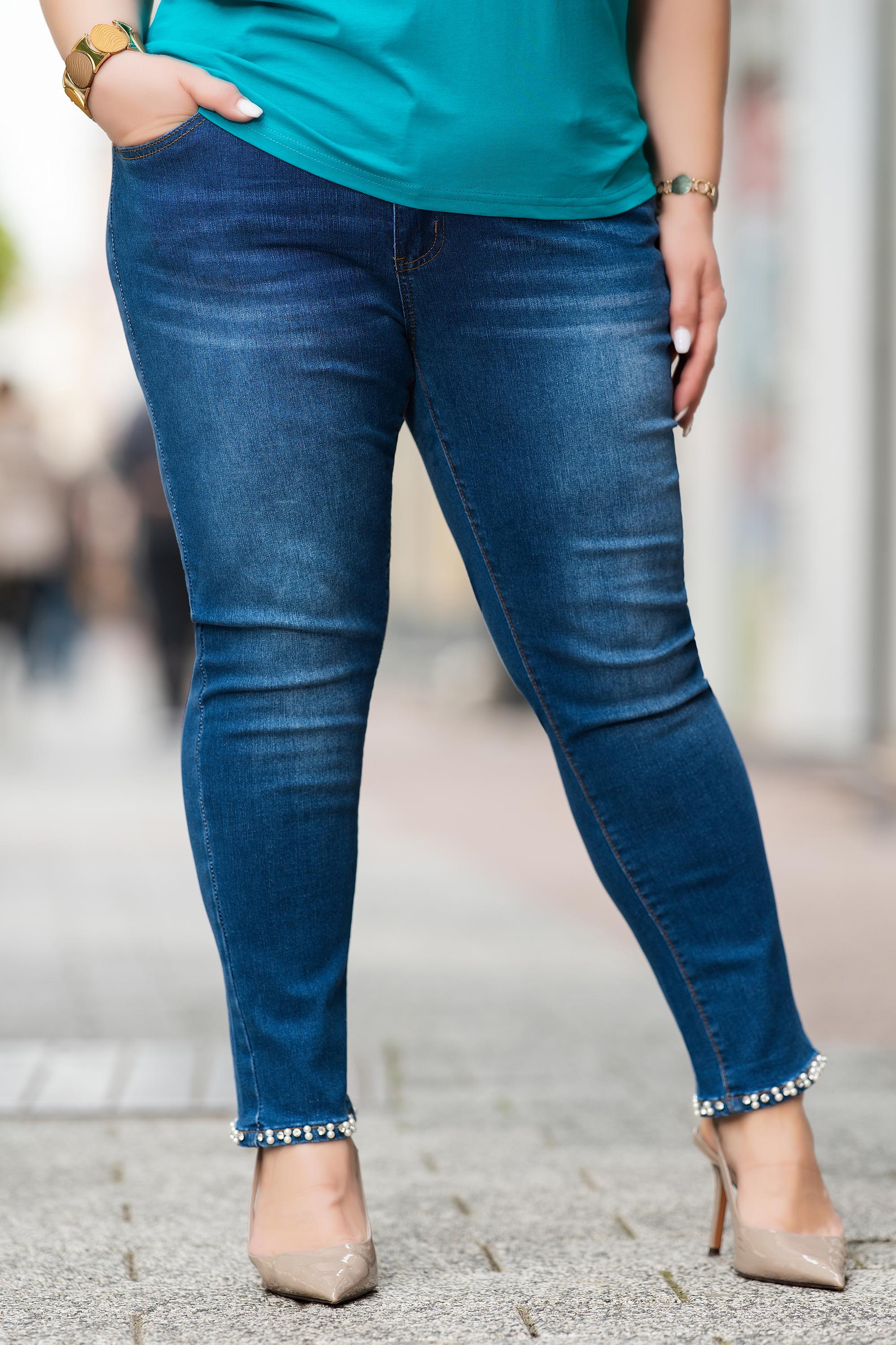 Тези макси дънки съчетават класическа визия и модерен акцент. Изработени от качествен памучен деним с еластичност, те осигуряват комфорт и свобода на движение през целия ден. Стандартната кройка оформя силуета, а декоративните перли по крачолите придават елегантно и женствено излъчване. Подходящи са за ежедневни визии с акцент и лесно се комбинират както с тениски, така и с по-елегантни блузи.
