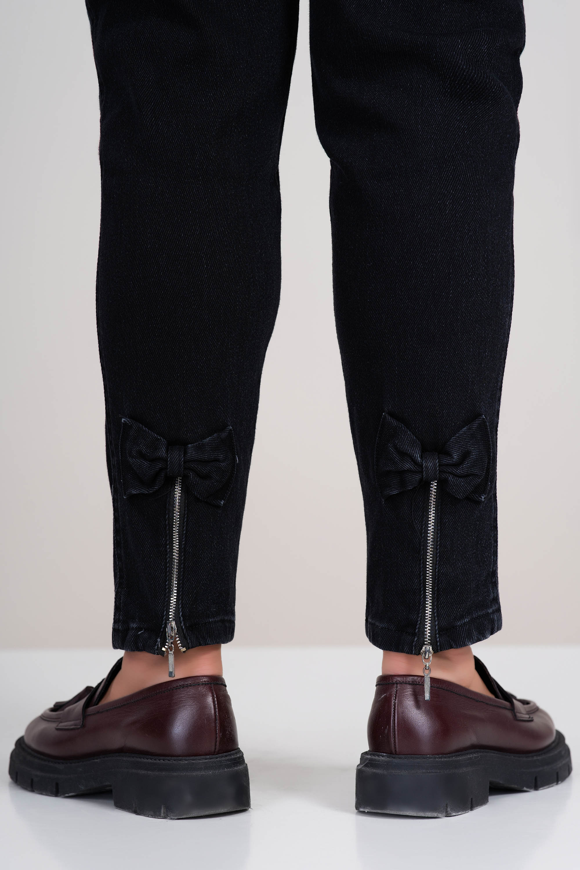 Дълги макси дънки от черен еластичен деним с висока талия, ластик за допълнителен комфорт. Дизайнът е завършен с ципове в долната част на крачолите и панделка, която придава модерен акцент. Перфектни за ежедневно носене и съчетаване с кецове или боти.