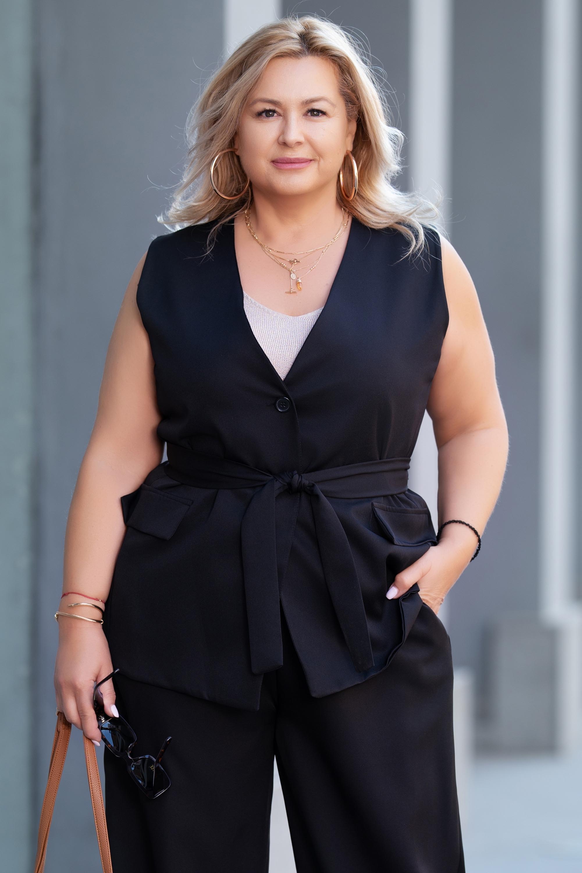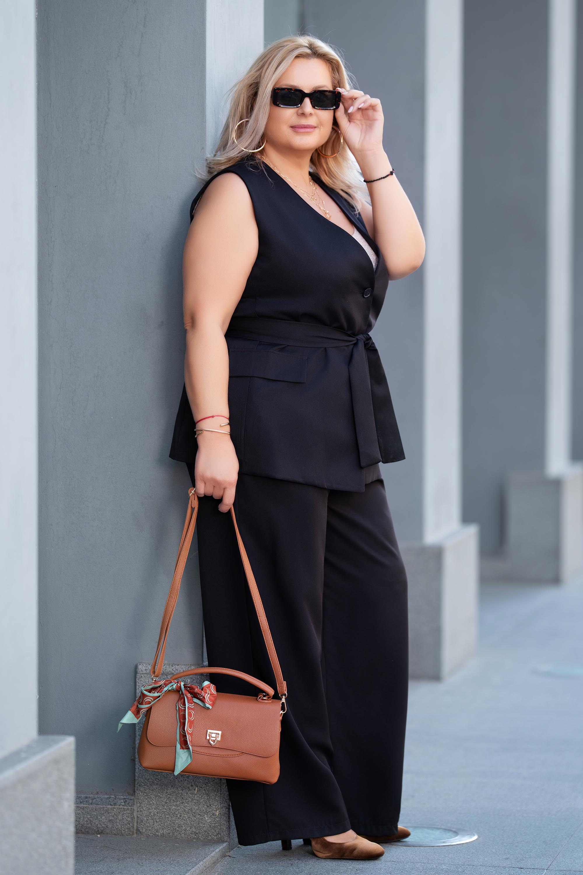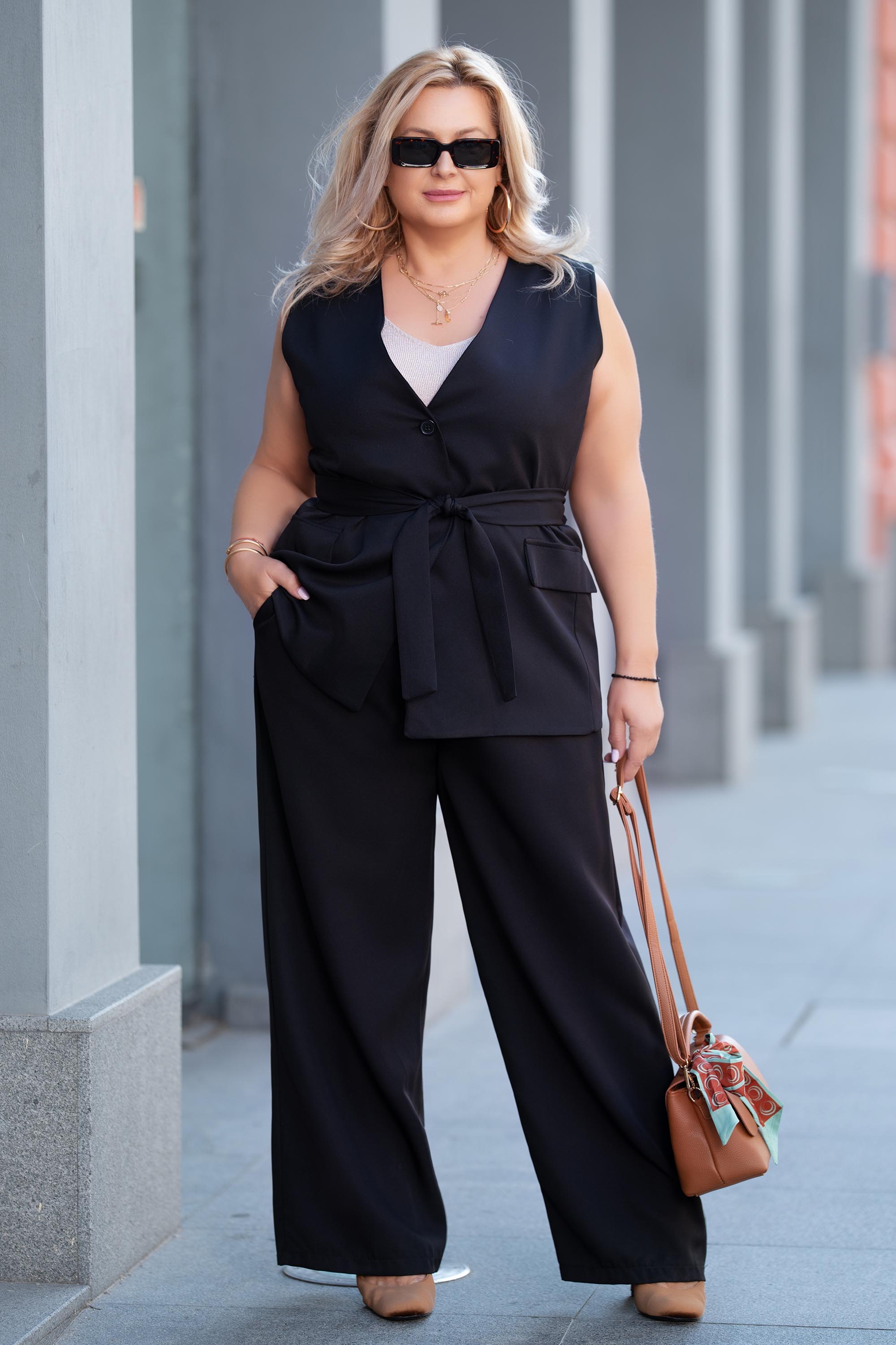 Стилно и комфортно решение за ежедневието – този макси комплект съчетава елегантен елек с колан и широк панталон с ластик на талията. Меката материя с еластан осигурява свобода на движение и подчертава фигурата с лекота. Черният цвят придава завършеност и е подходящ за офис, срещи или официални поводи.