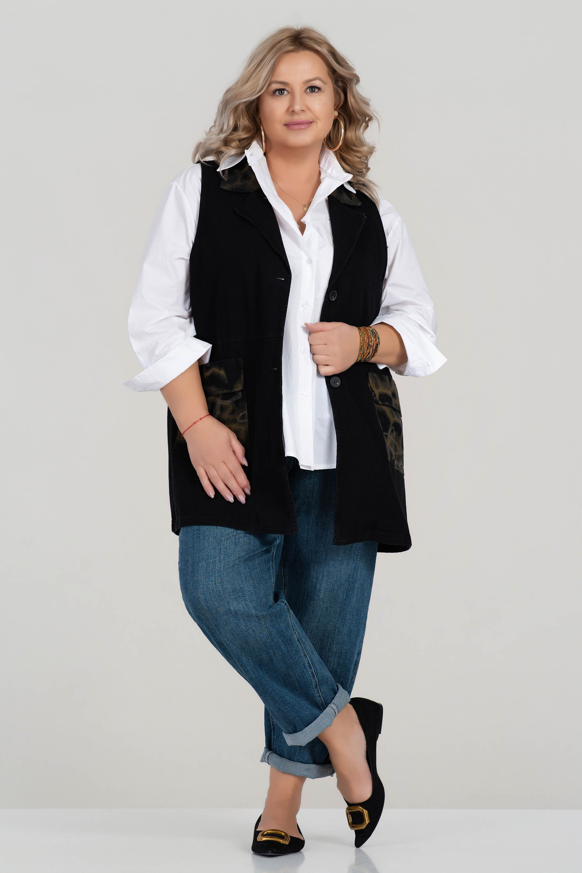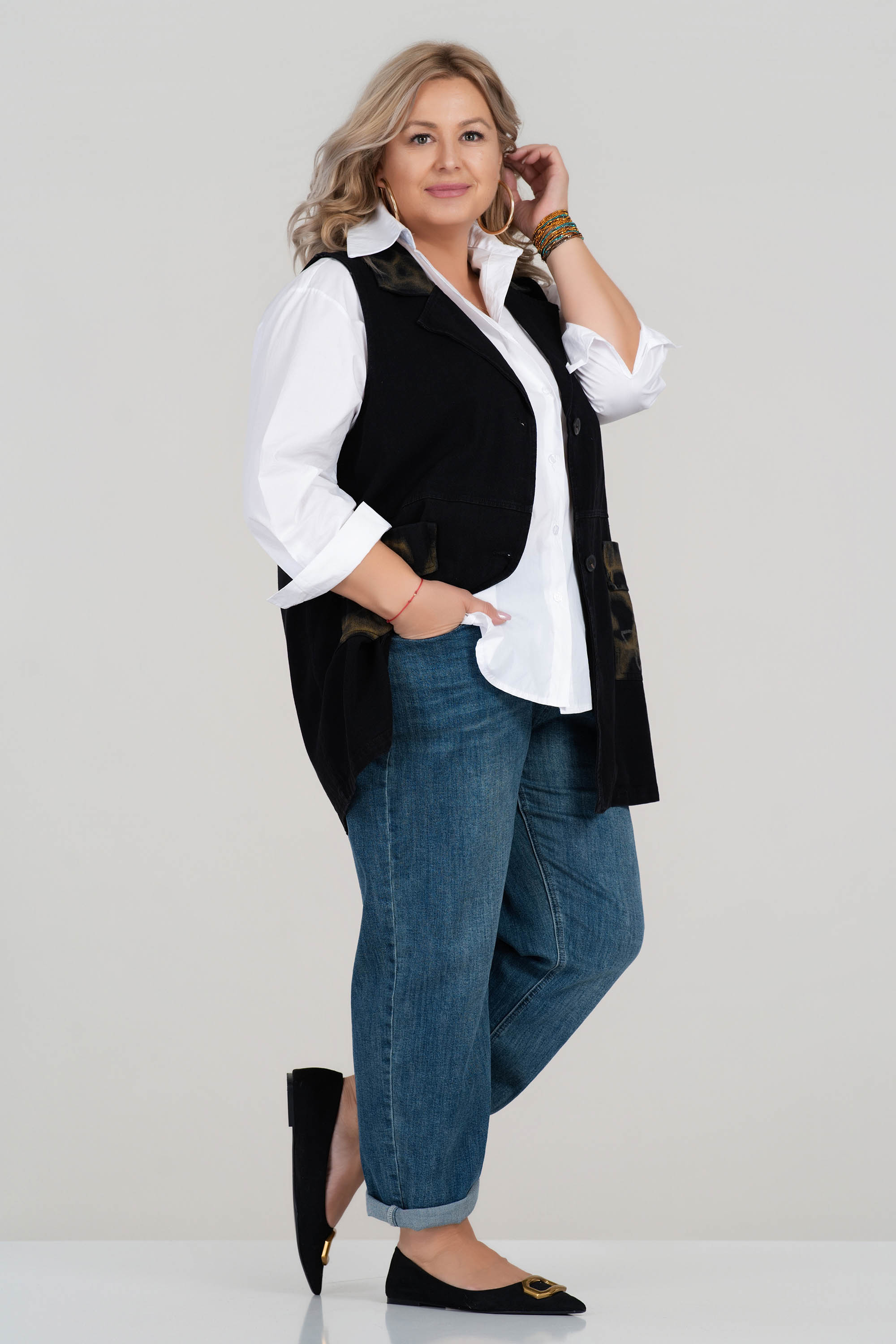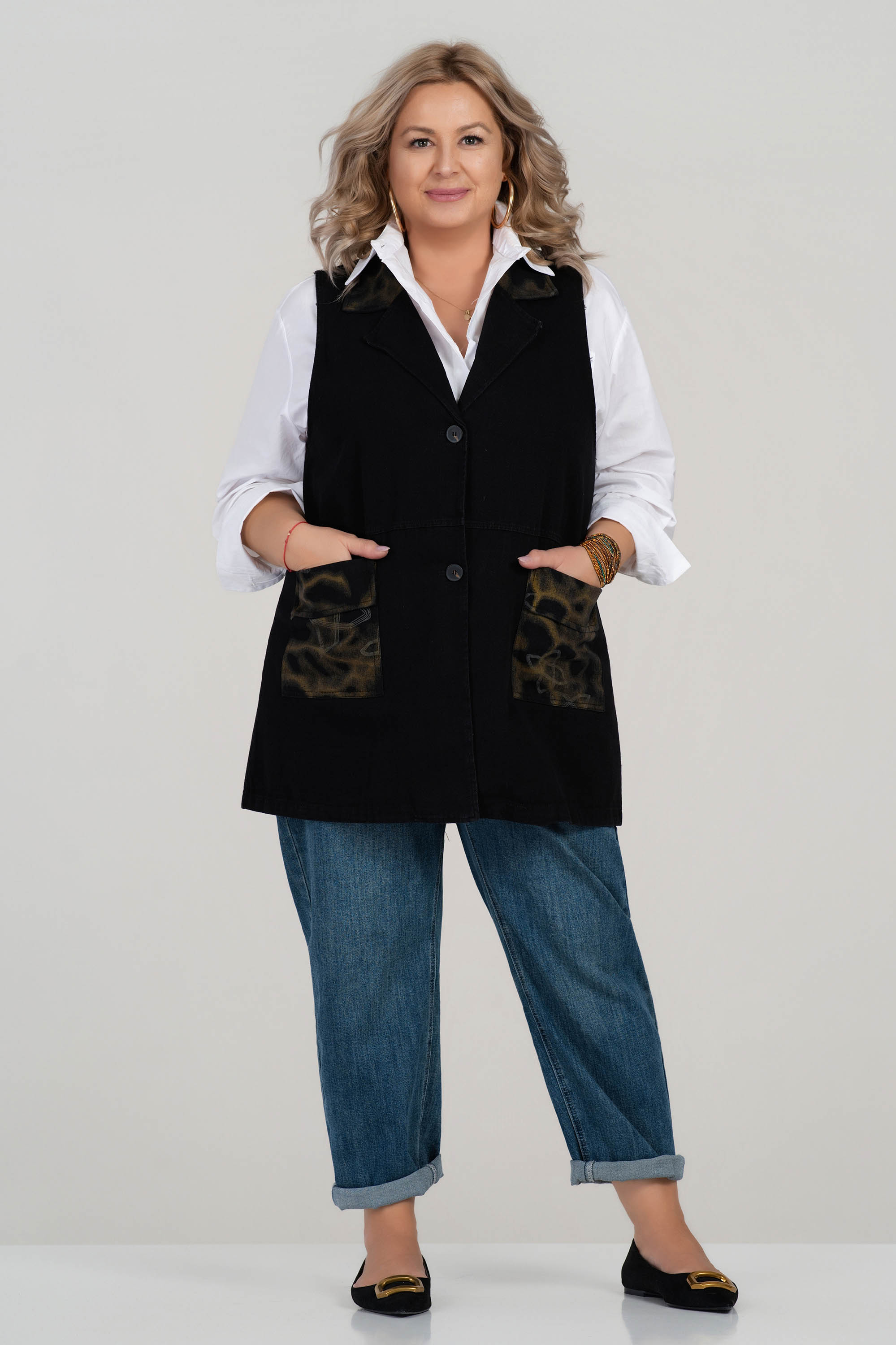 Практичен и модерен макси елек от черен деним, създаден за универсални комбинации през всички сезони. Яката и предното закопчаване с копчета осигуряват удобство, докато двата предни джоба добавят функционалност. Жълтият принт придава индивидуалност и подчертава градския характер на модела.