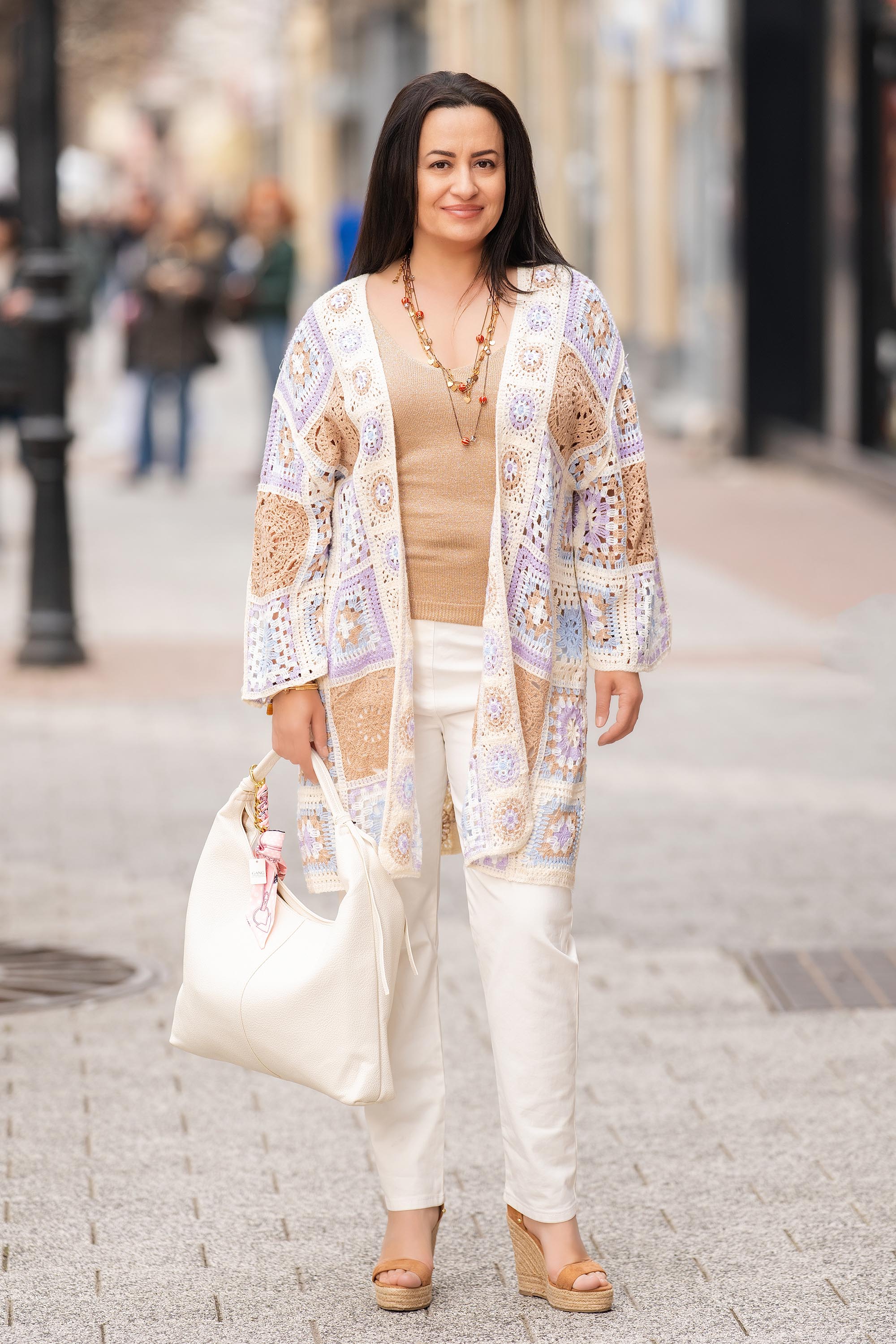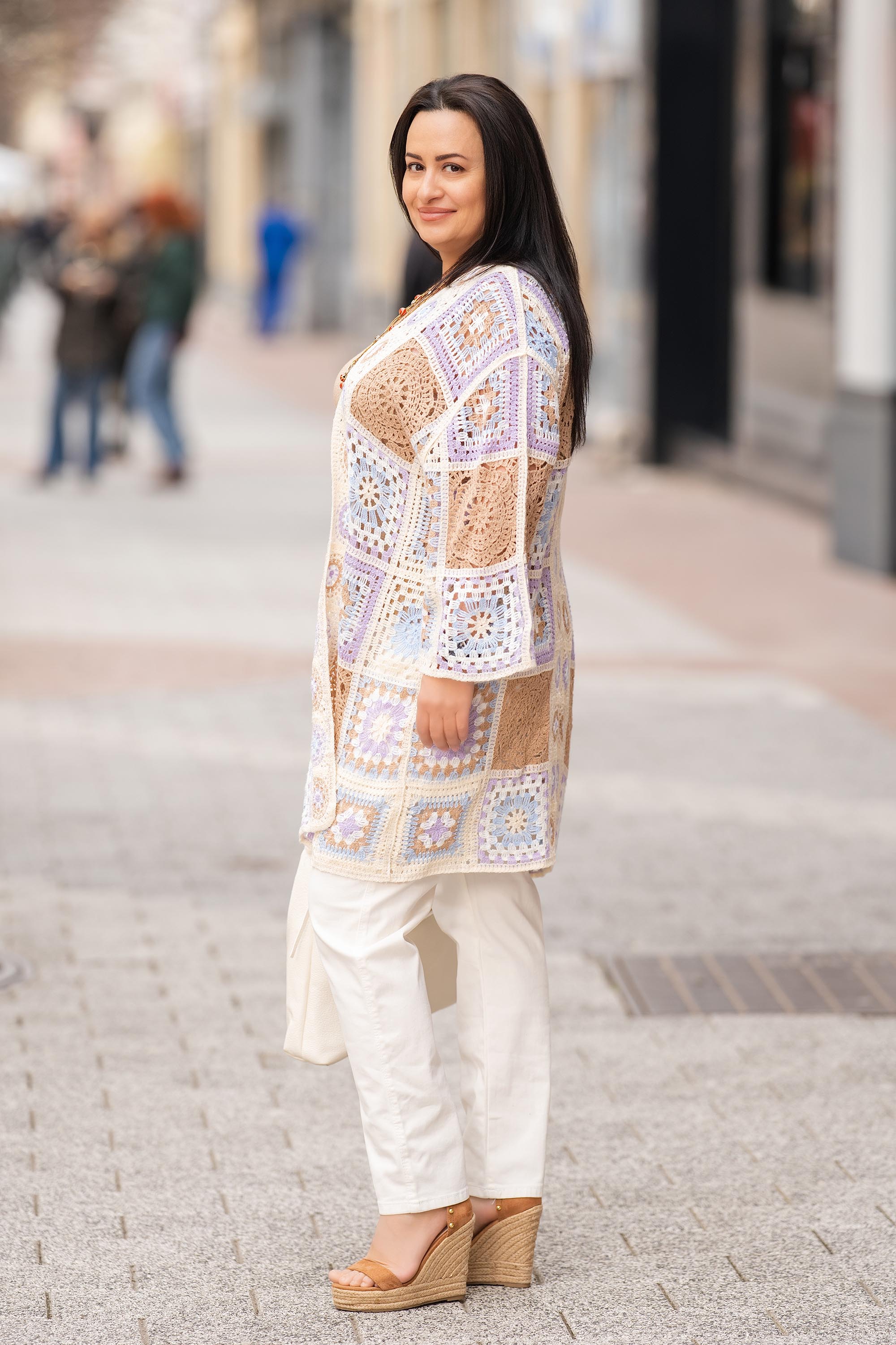 Впечатляваща макси жилетка с издължена линия и артистична плетка тип една кука в лилаво, допълнена от фини нюанси на синьо, бежово и кафяво. Материята е лека, устойчива и лесна за поддръжка, осигуряваща комфорт през целия ден. Моделът е без закопчаване, което я прави идеална за наслояване и създаване на разнообразни визии. Дългият силует издължава фигурата и придава елегантност. Подходящ избор за ежедневие и стилни градски комбинации.