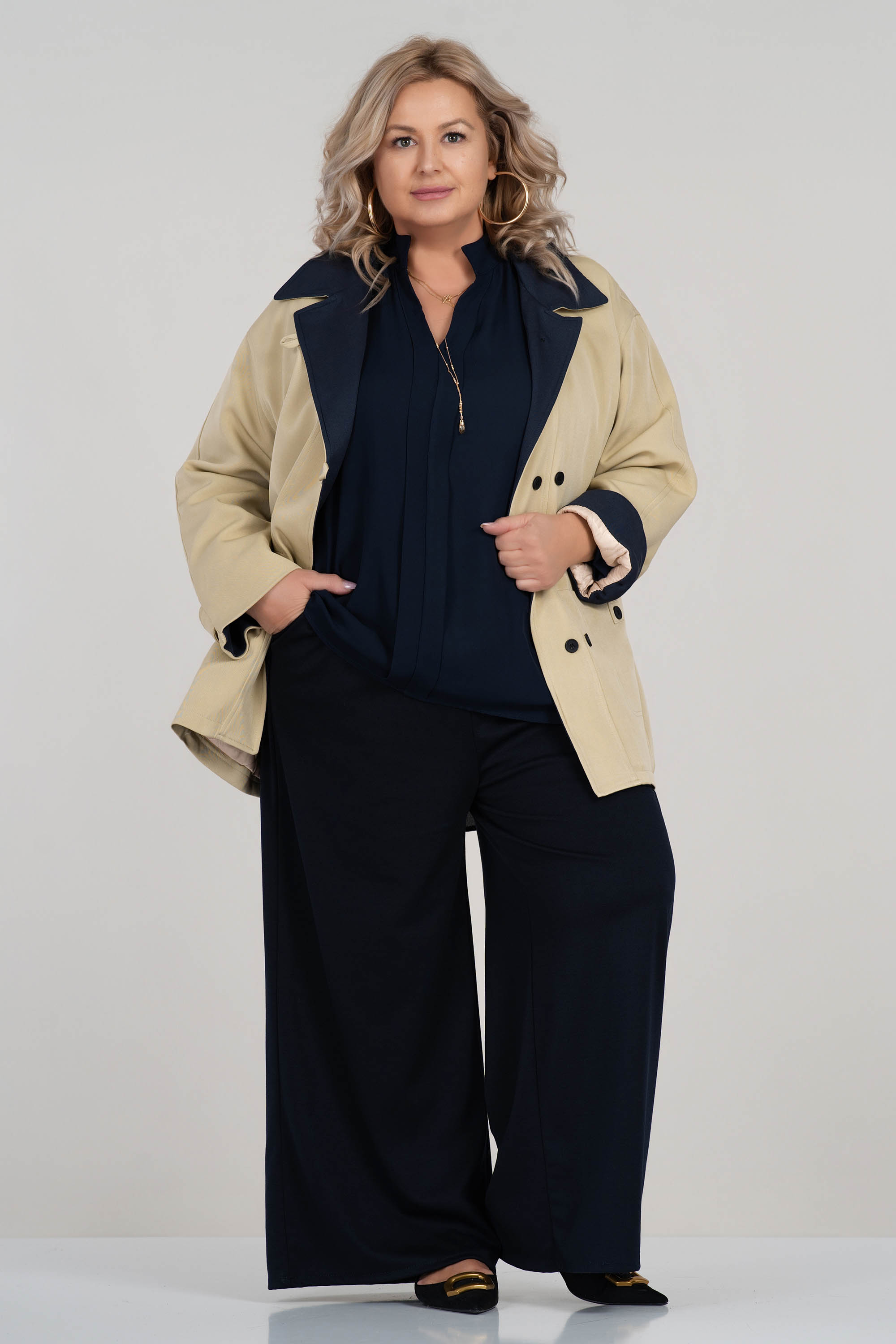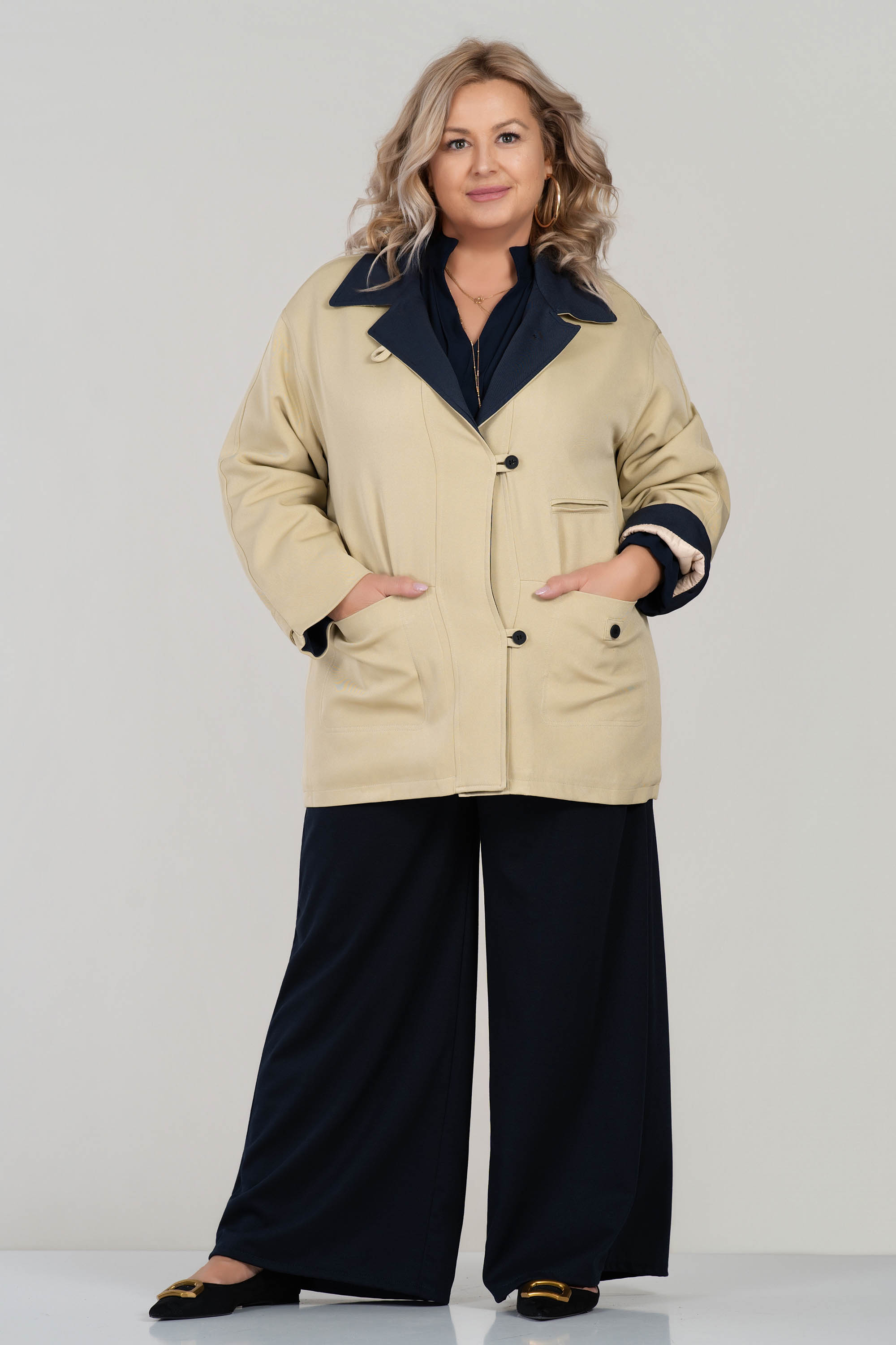 Модерен прочит на класическо яке, изработено от лека материя, подходяща за преходните сезони. Контрастната яка и ревер в тъмносиньо създават отличителна визия. Двуредовото закопчаване с черни копчета и джобовете добавят елегантен акцент. Комфортно и стилно допълнение към градската визия.