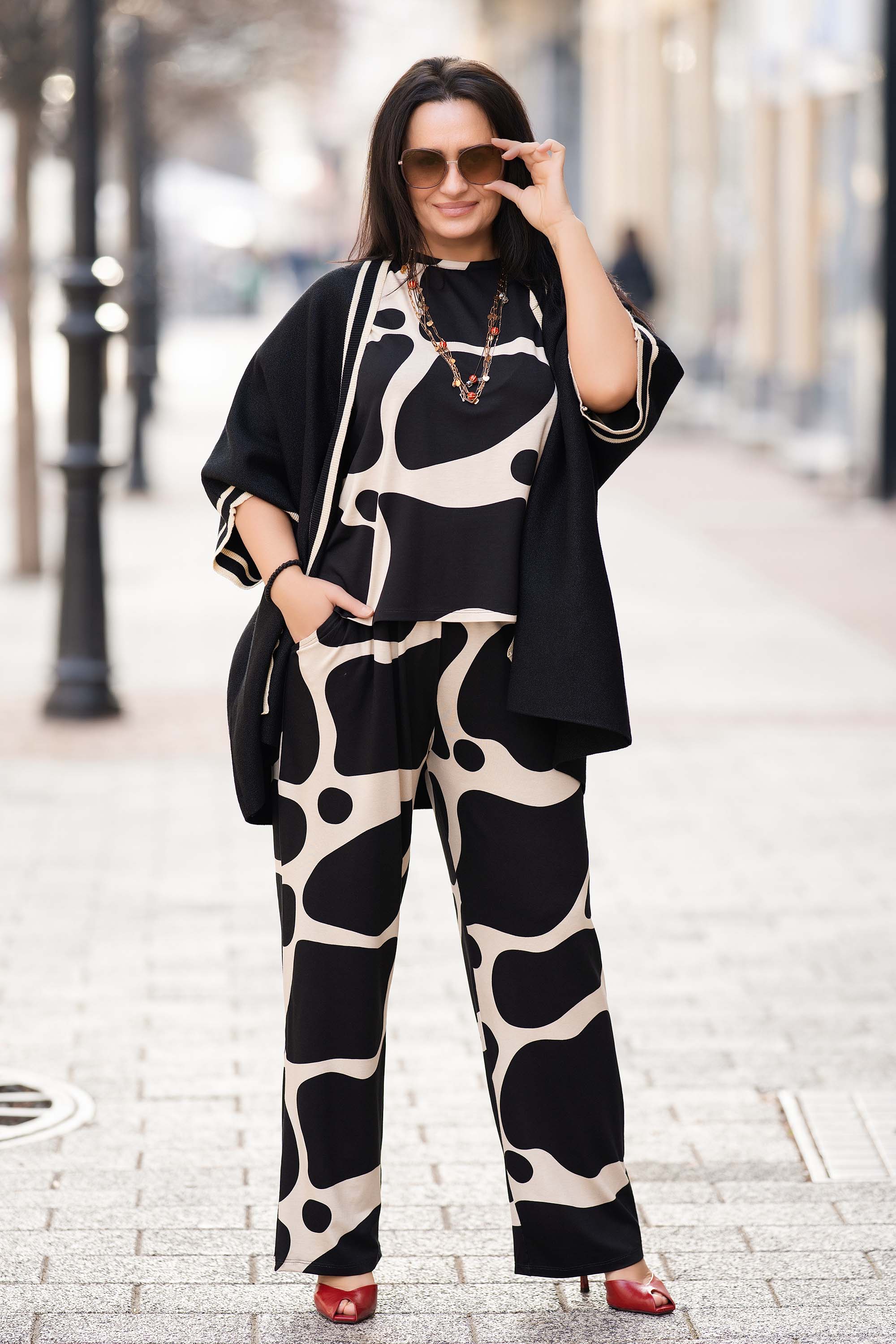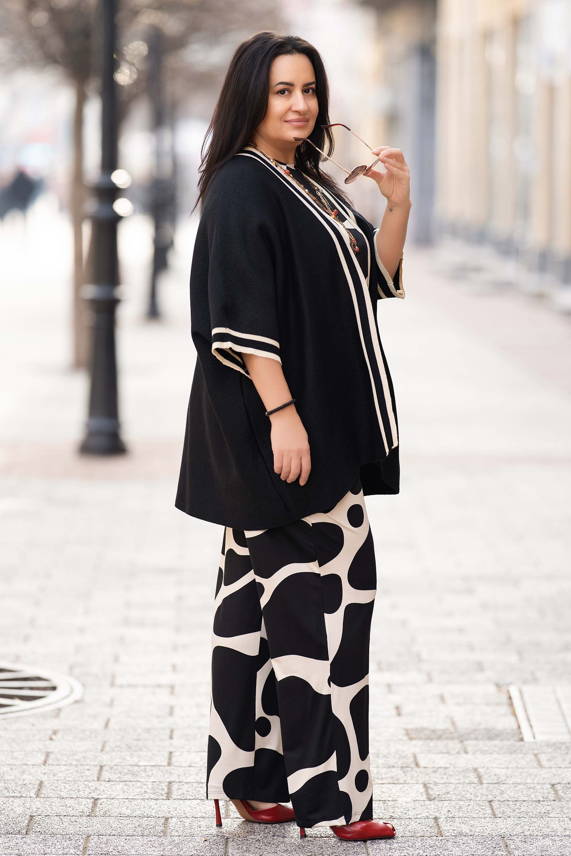 Тази стилна макси жилетка впечатлява с елегантна линия и дискретен блясък благодарение на ламе нишките, вплетени в меката черна основа. Кантовете в бежово придават изискан завършек и я правят лесна за съчетаване с едноцветни или принтирани тоалети. Свободната кройка и дългият силует осигуряват комфорт и свобода на движение. Подходяща както за ежедневно носене, така и за по-елегантни поводи.