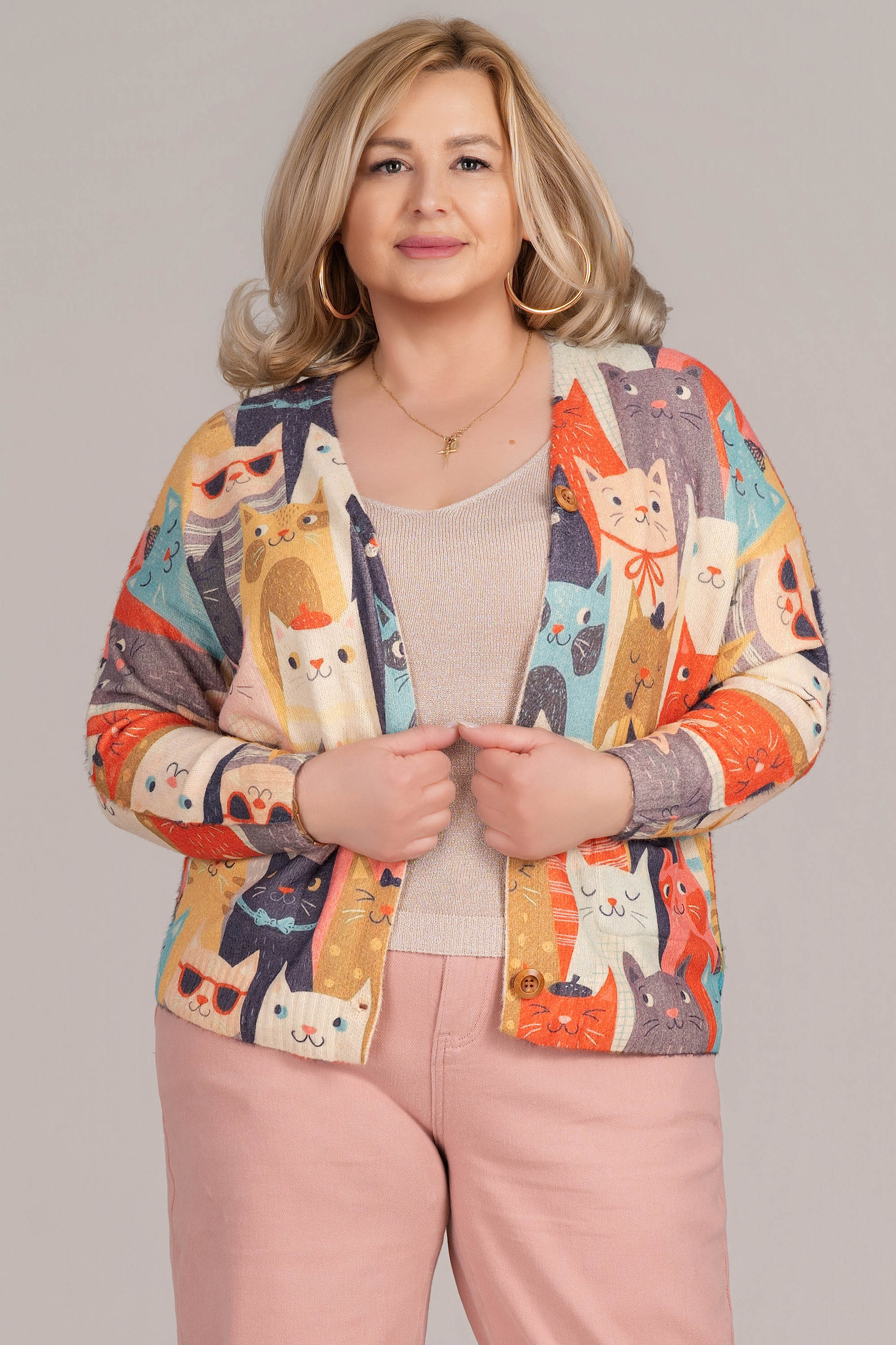 Изразителна жилетка с артистичен принт с цветни котки, който създава усещане за топлина и уют. Изработена от фино плетиво, моделът е с класическо остро деколте, дълги ръкави и копчета в дървесен ефект. Tази жилетка съчетава комфорт и стил в едно. Идеален избор за ежедневна визия с характер.