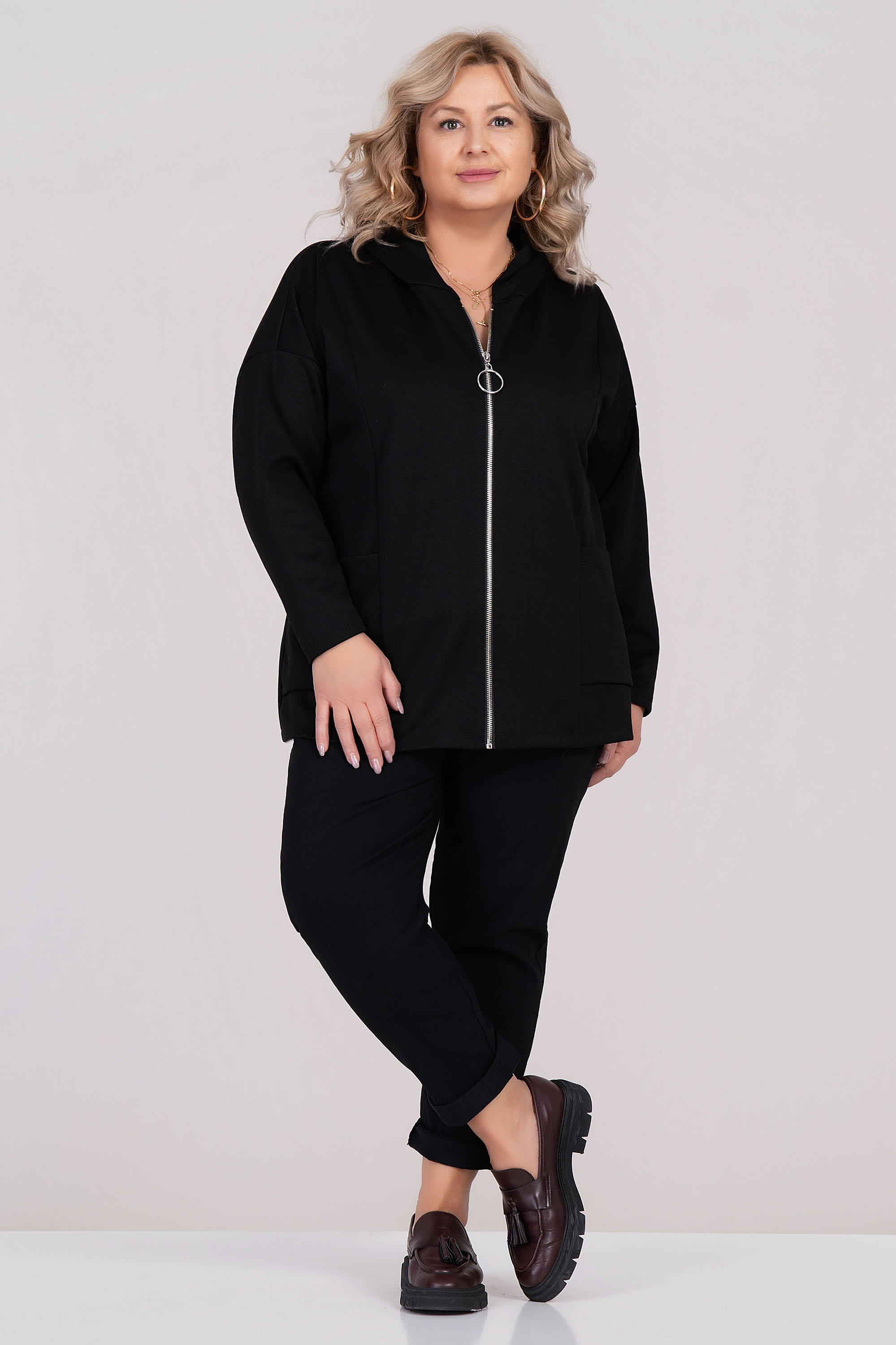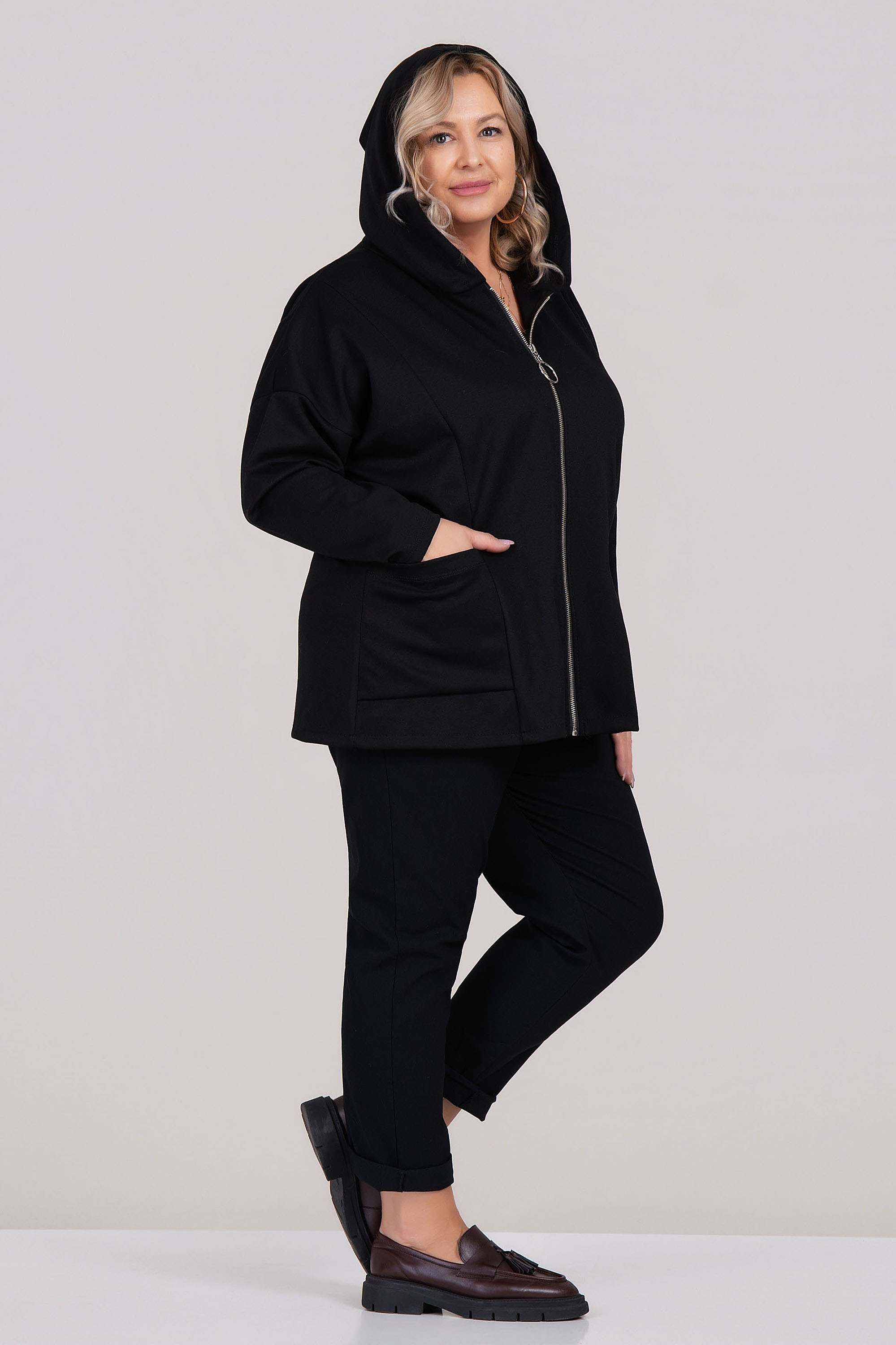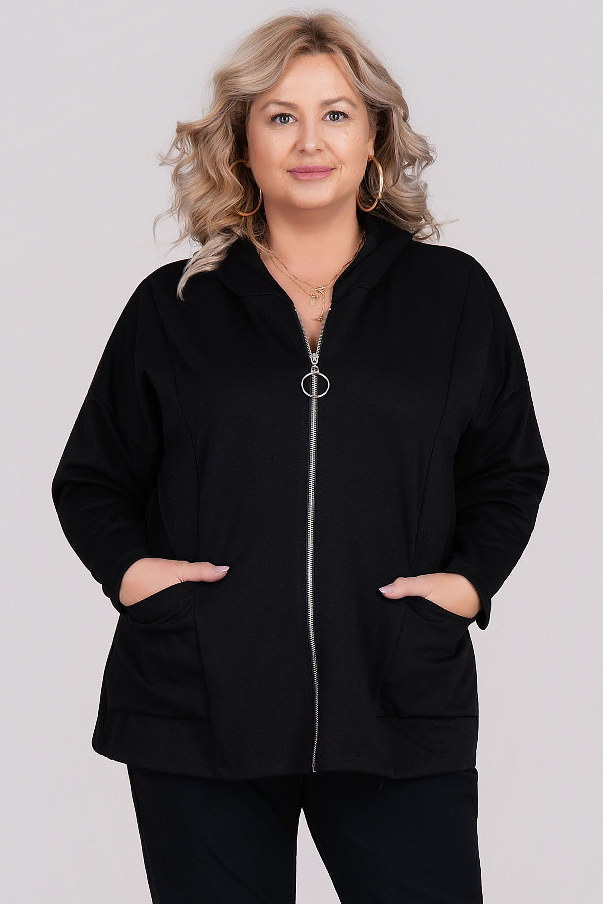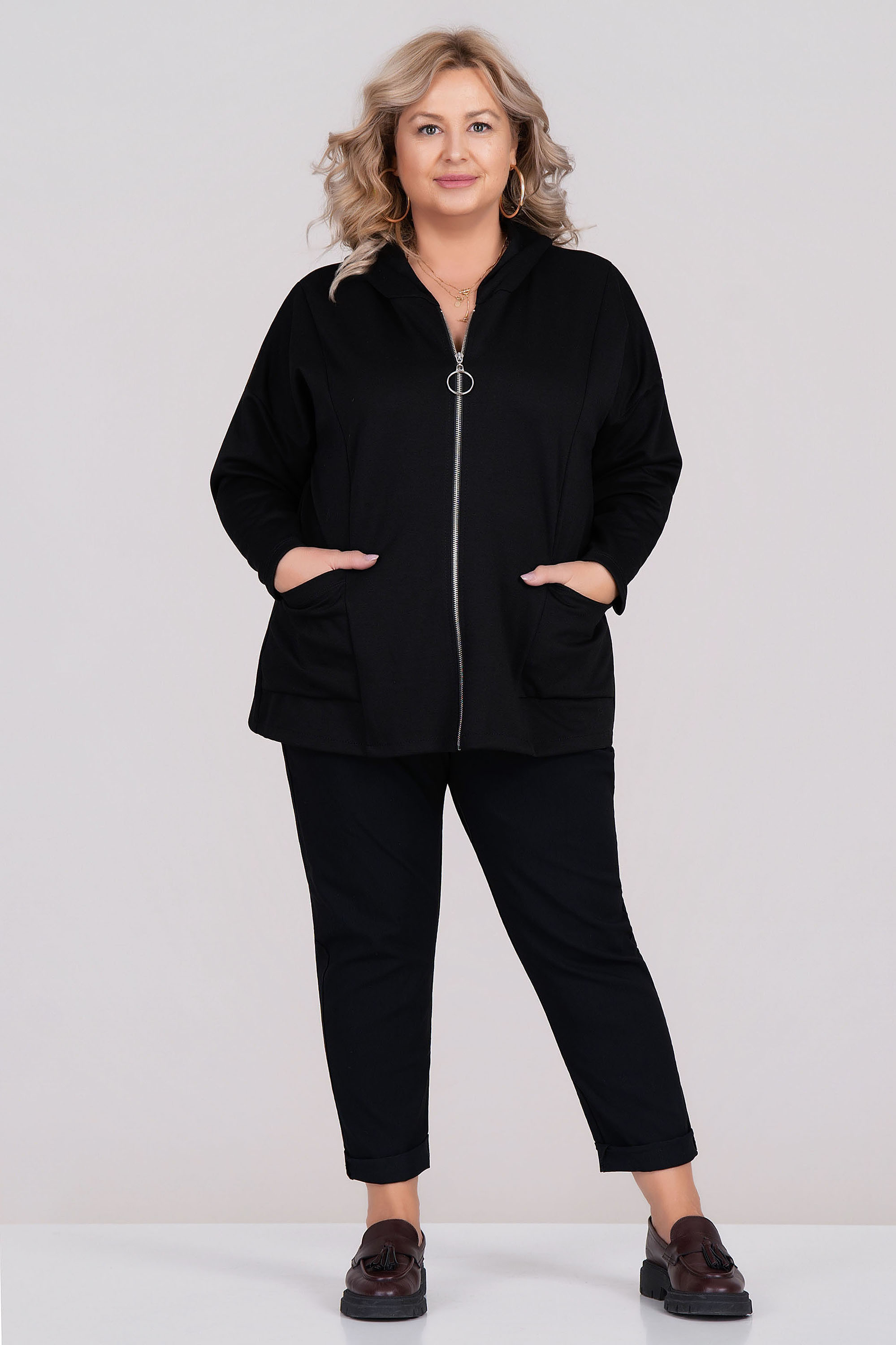 Тази черна макси жилетка съчетава комфорт и функционалност в едно. Изработена от памучно трико с лек еластичен ефект, тя осигурява мекота и свобода на движение. Ципът по цялата дължина и двата предни джоба добавят практичен елемент, а свободната кройка с качулка я прави отличен избор за преходните сезони.