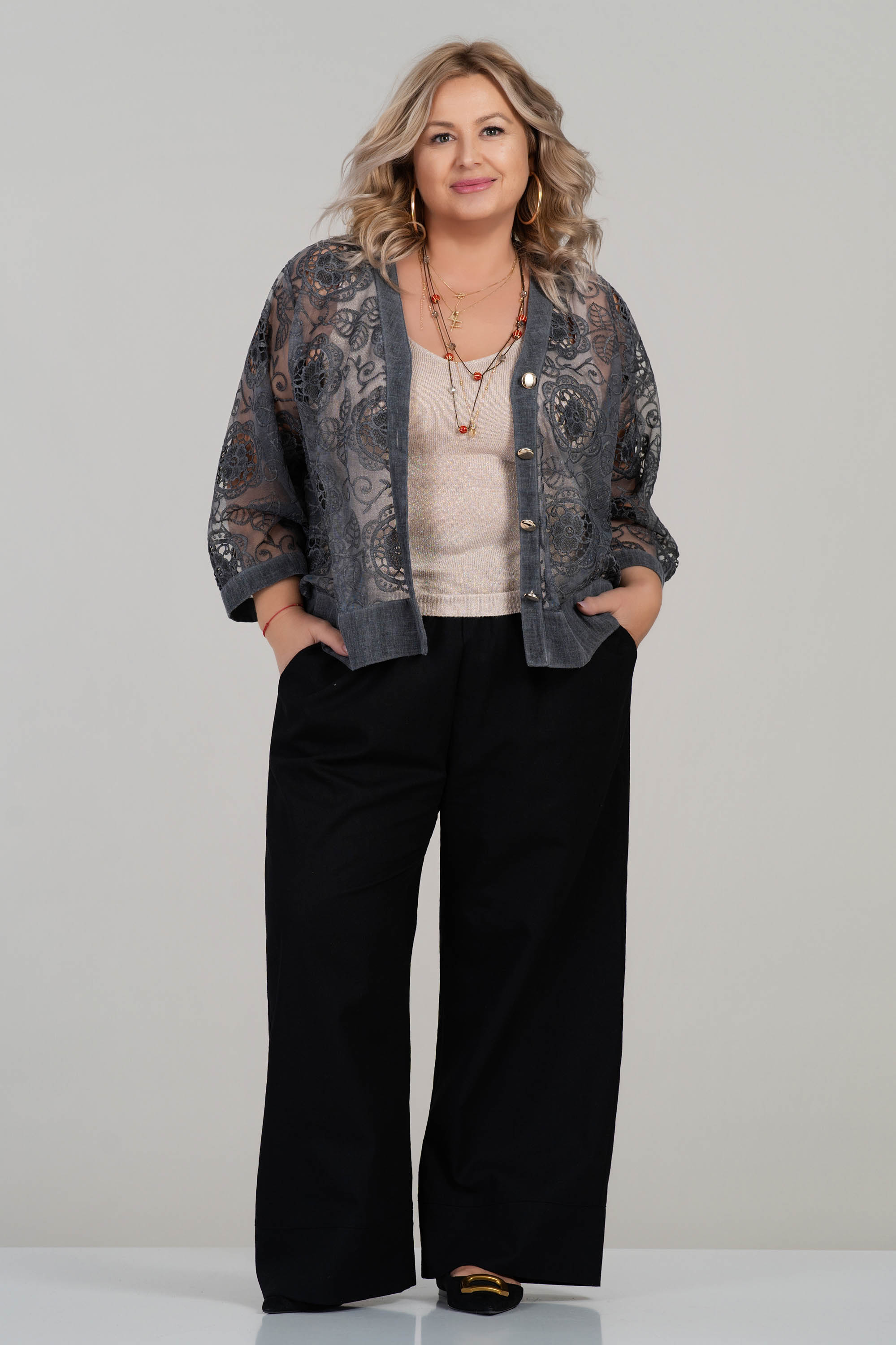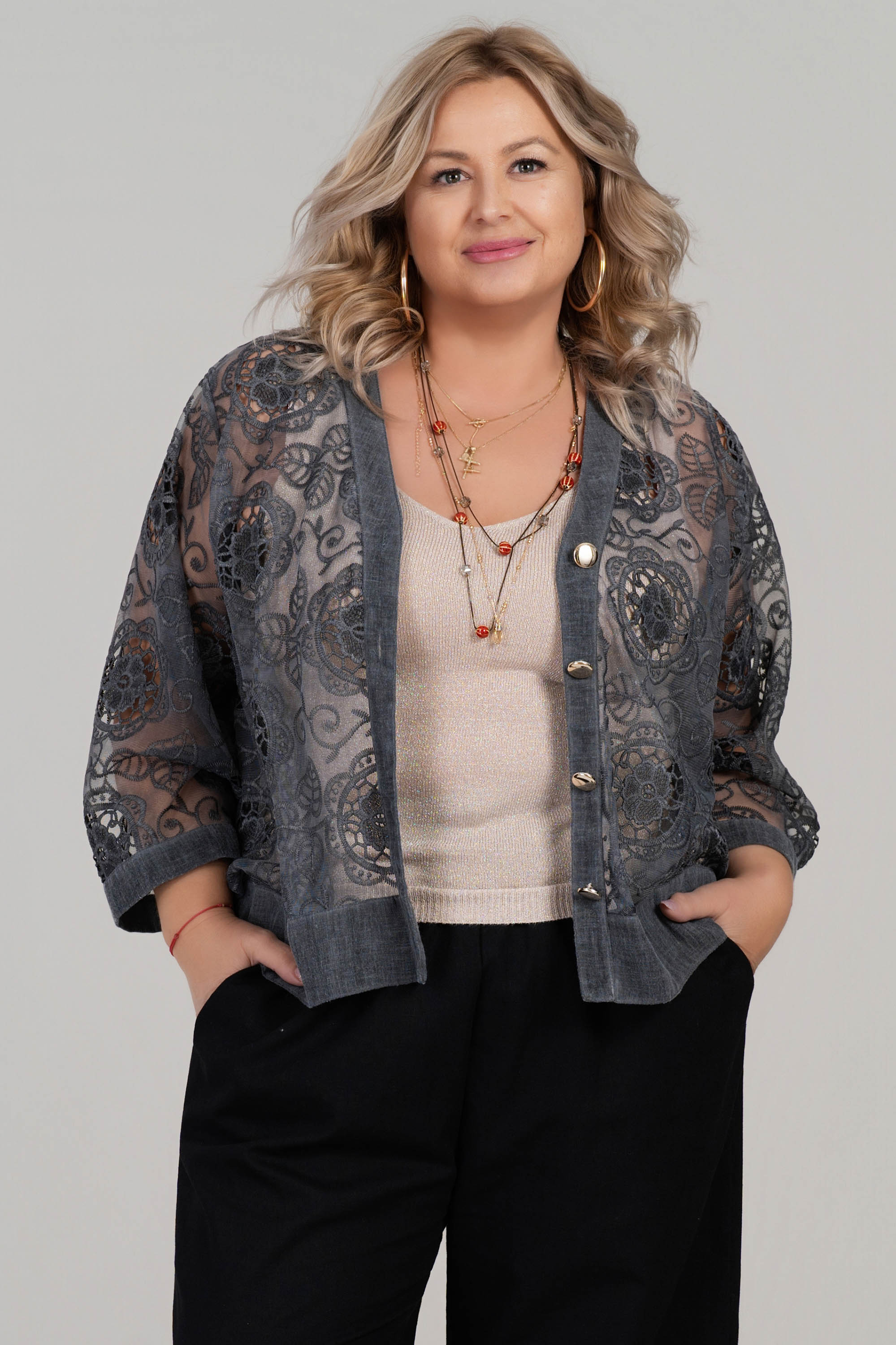 Тази ефектна макси жилетка в сиво впечатлява с ръчна бродерия върху отпред и ръкавите. Моделът е с остро деколте и свободна кройка, която осигурява лекота при движение. Едноцветният дизайн я прави лесна за комбиниране с други елементи от гардероба.