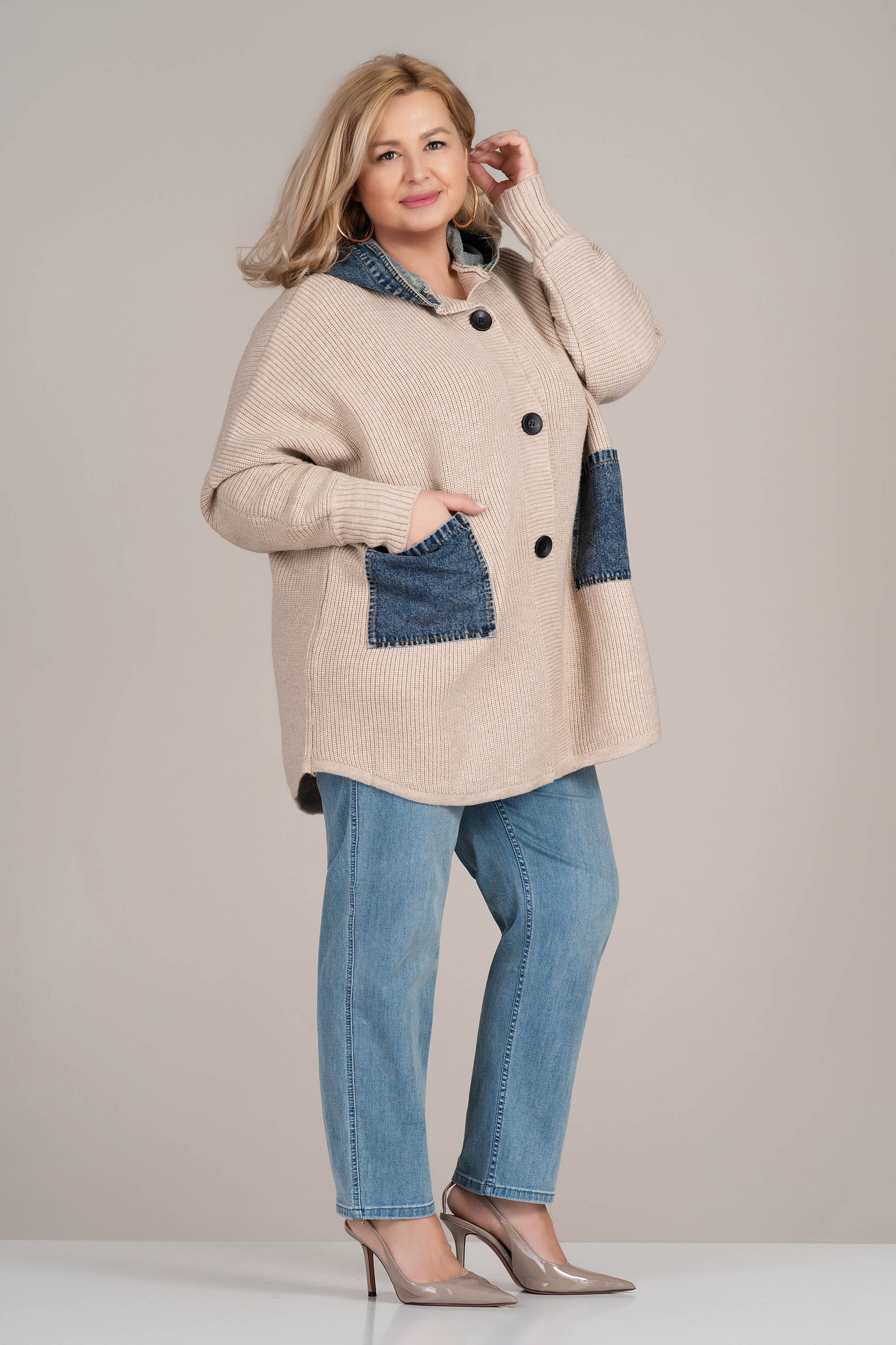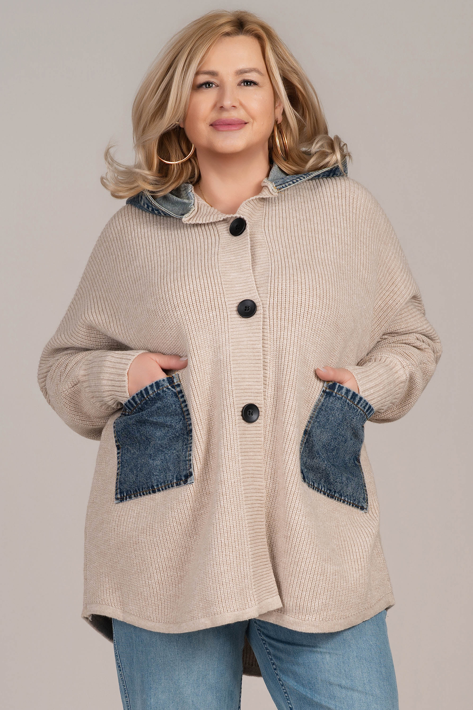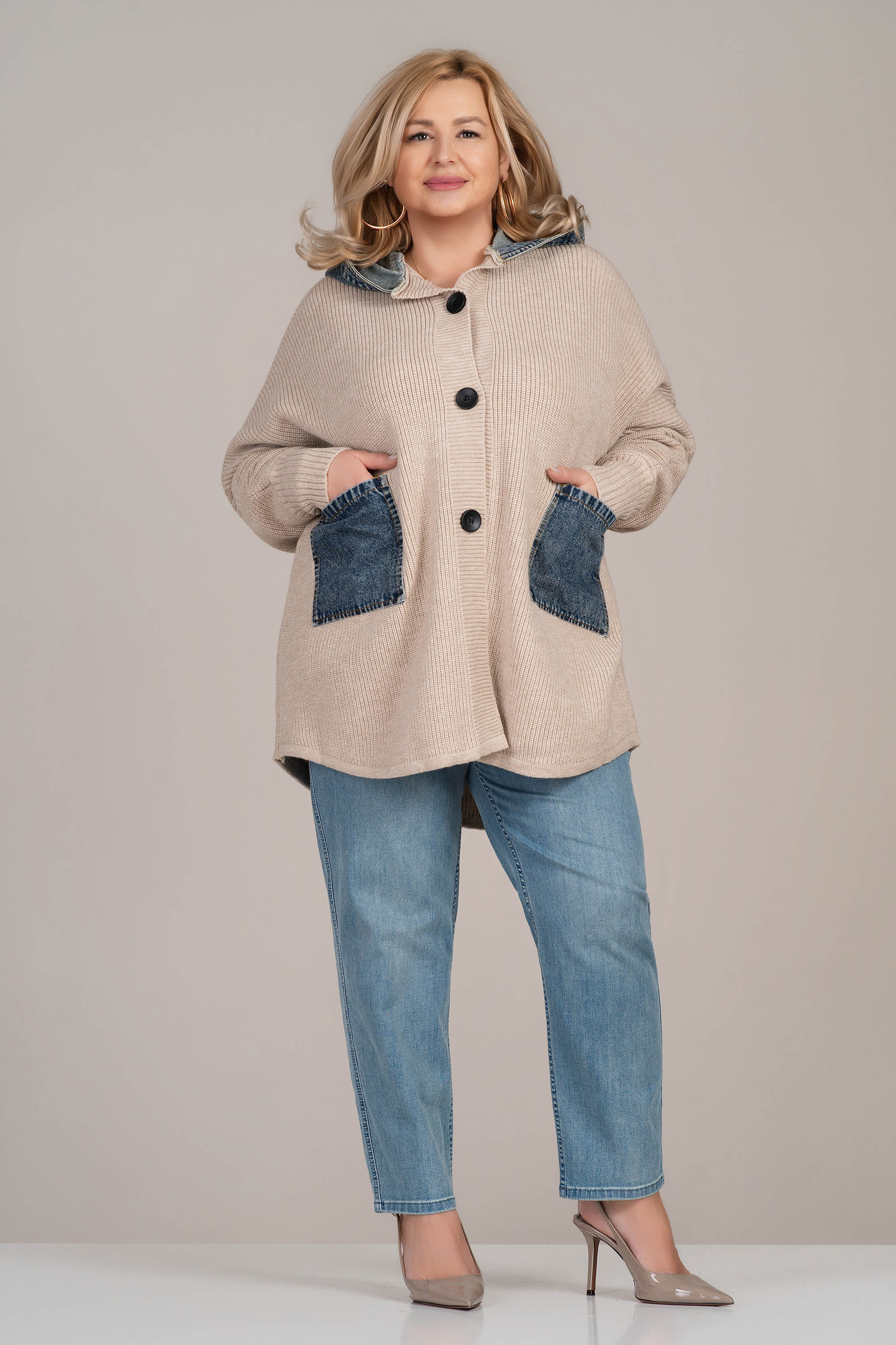Жилетка от плетиво в светлобежов нюанс, съчетаваща удобство и модерен прочит. Моделът е с права кройка, обло деколте и закопчаване с копчета, а големите дънкови джобове и яка внасят съвременен градски акцент. Плетивото е меко и подходящо за преходните сезони. Идеална за ежедневно носене.