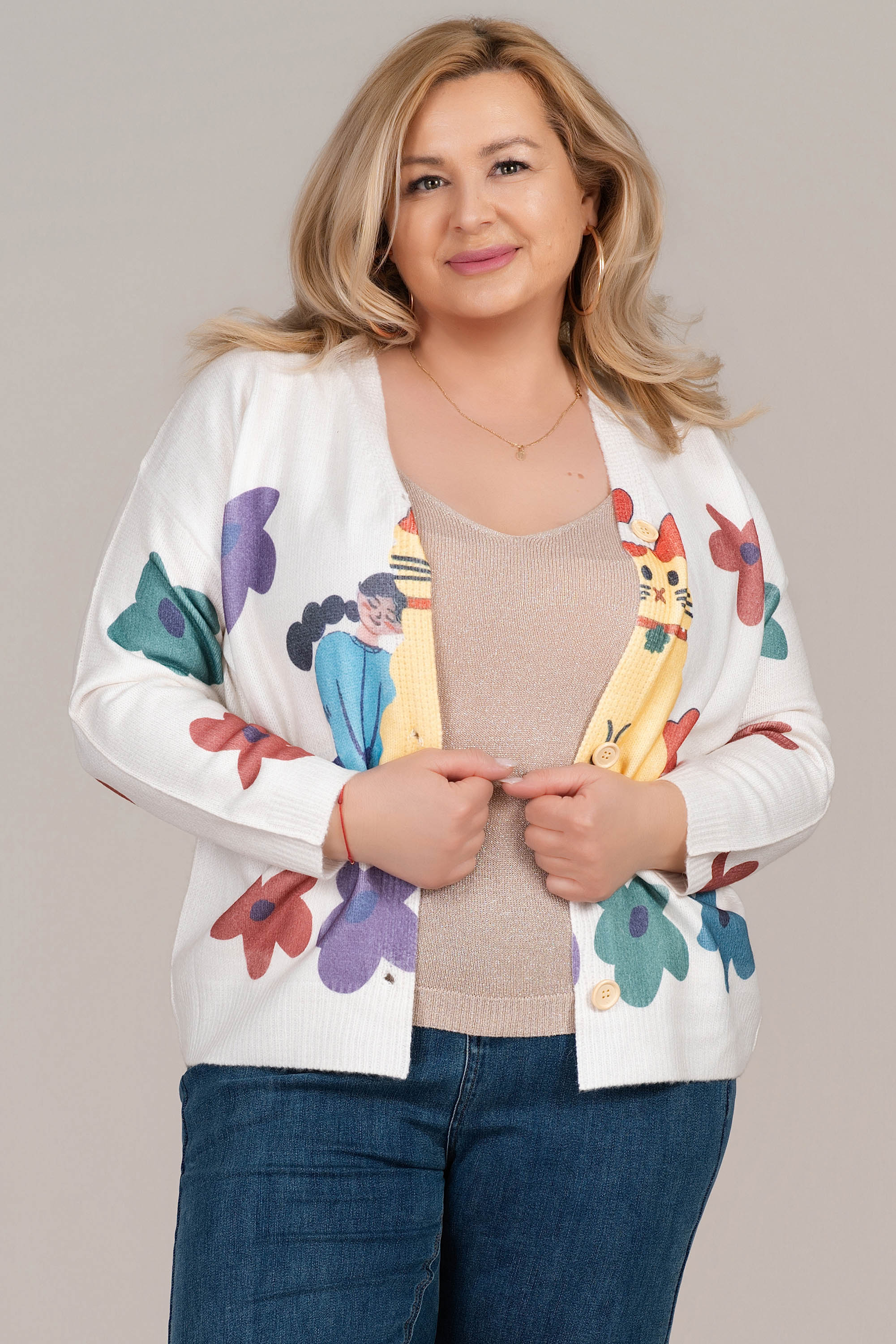 Тази жилетка от финo плетиво впечатлява с артистичен принт – стилизирано момиче, обградено от пъстри цветя. Меката материя осигурява комфорт при носене и запазва формата си при пране. Свободната кройка и V-образното деколте с копчета я правят подходящ избор за ежедневието и офиса. Подходяща за носене през преходните сезони, тя придава закачлив и модерен акцент на визията.