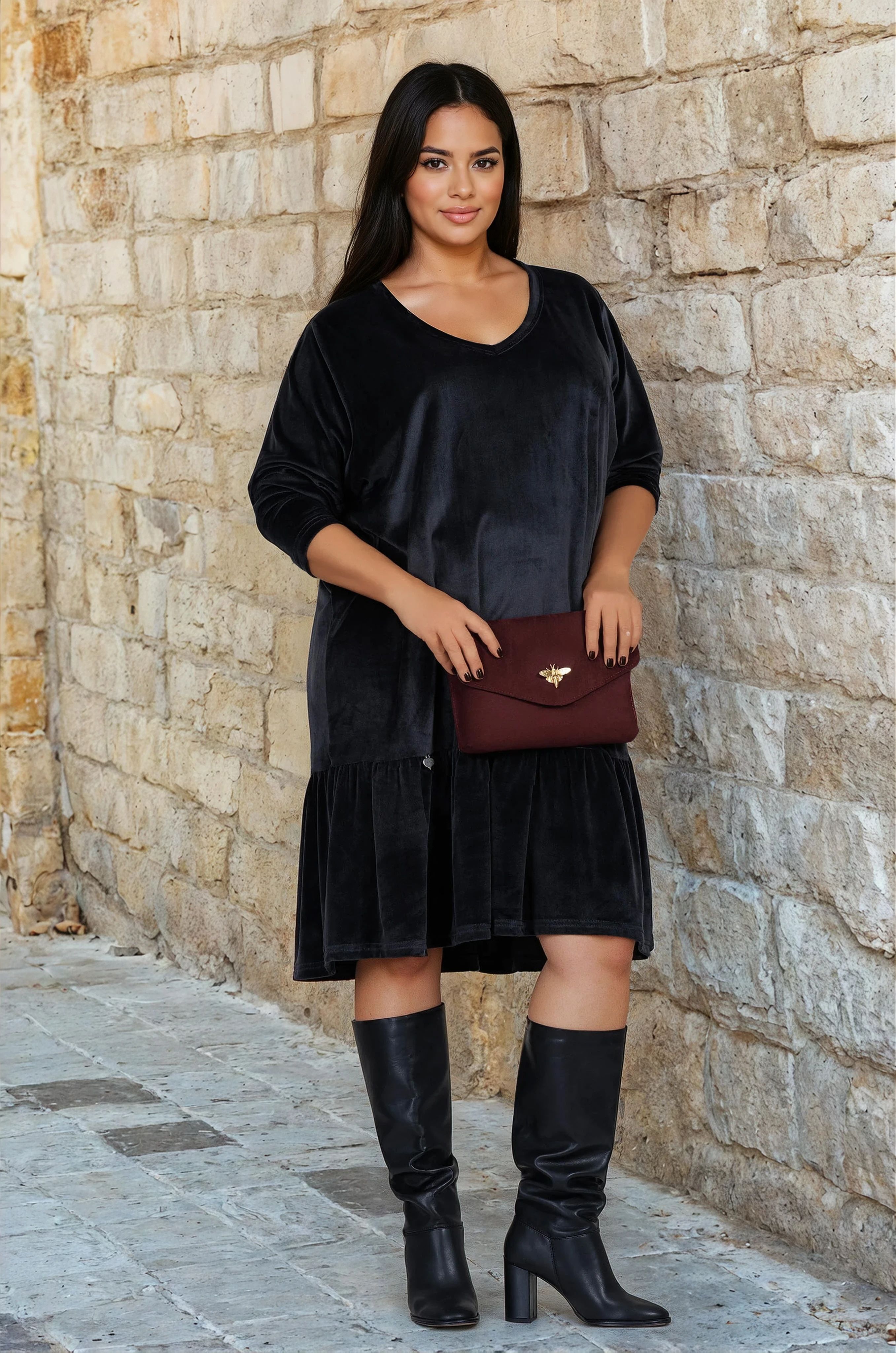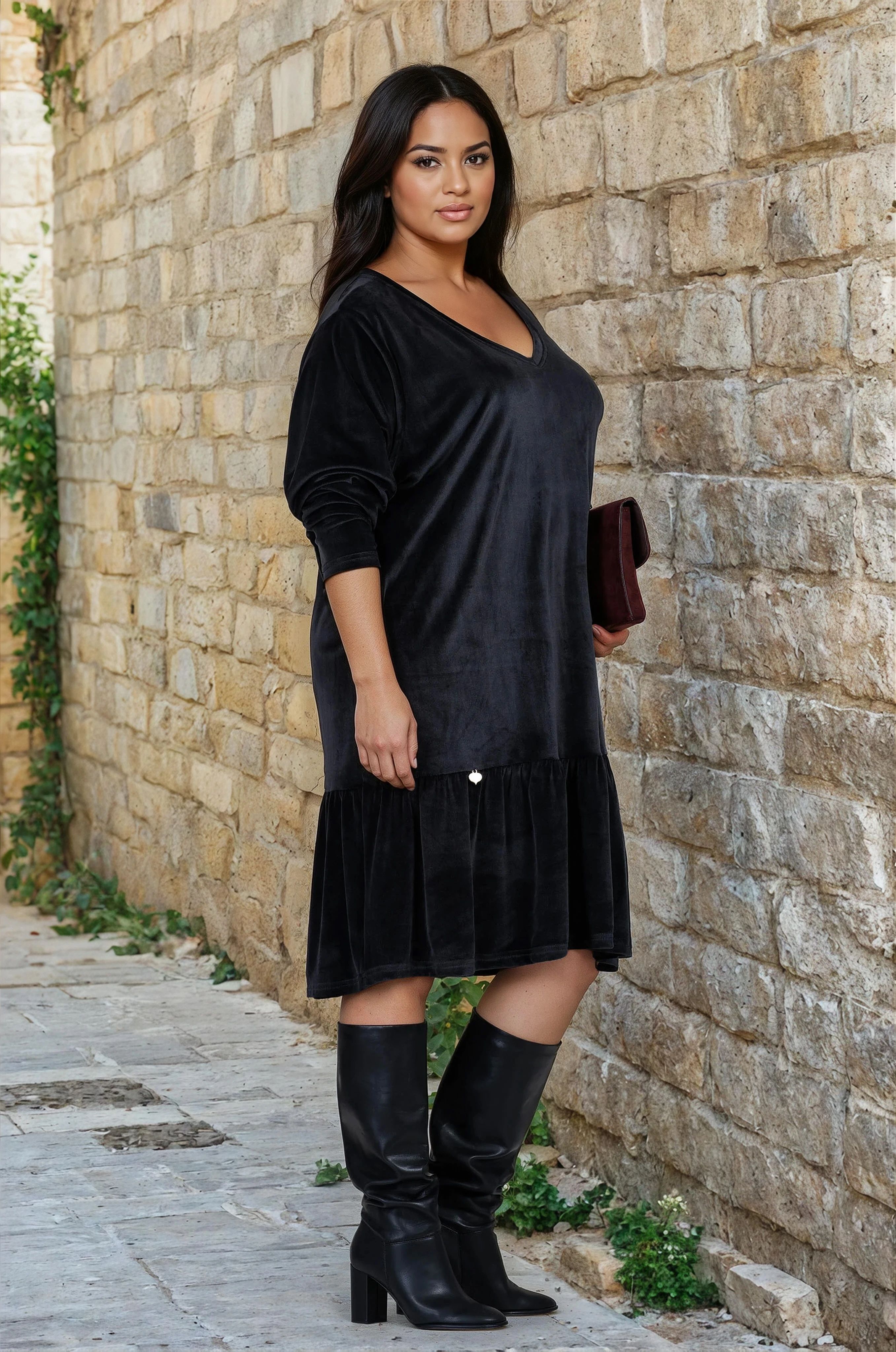 Елегантна и удобна, тази макси рокля от меко кадифе съчетава комфорт и женственост. Изработена е от качествена материя с добавен памук, която създава приятно усещане върху кожата. Острото деколте и леко падналото рамо подчертават деколтето и придават модерно излъчване. Кройката осигурява свобода на движение, а дължината е подходяща както за ежедневие, така и за по-специални поводи.
