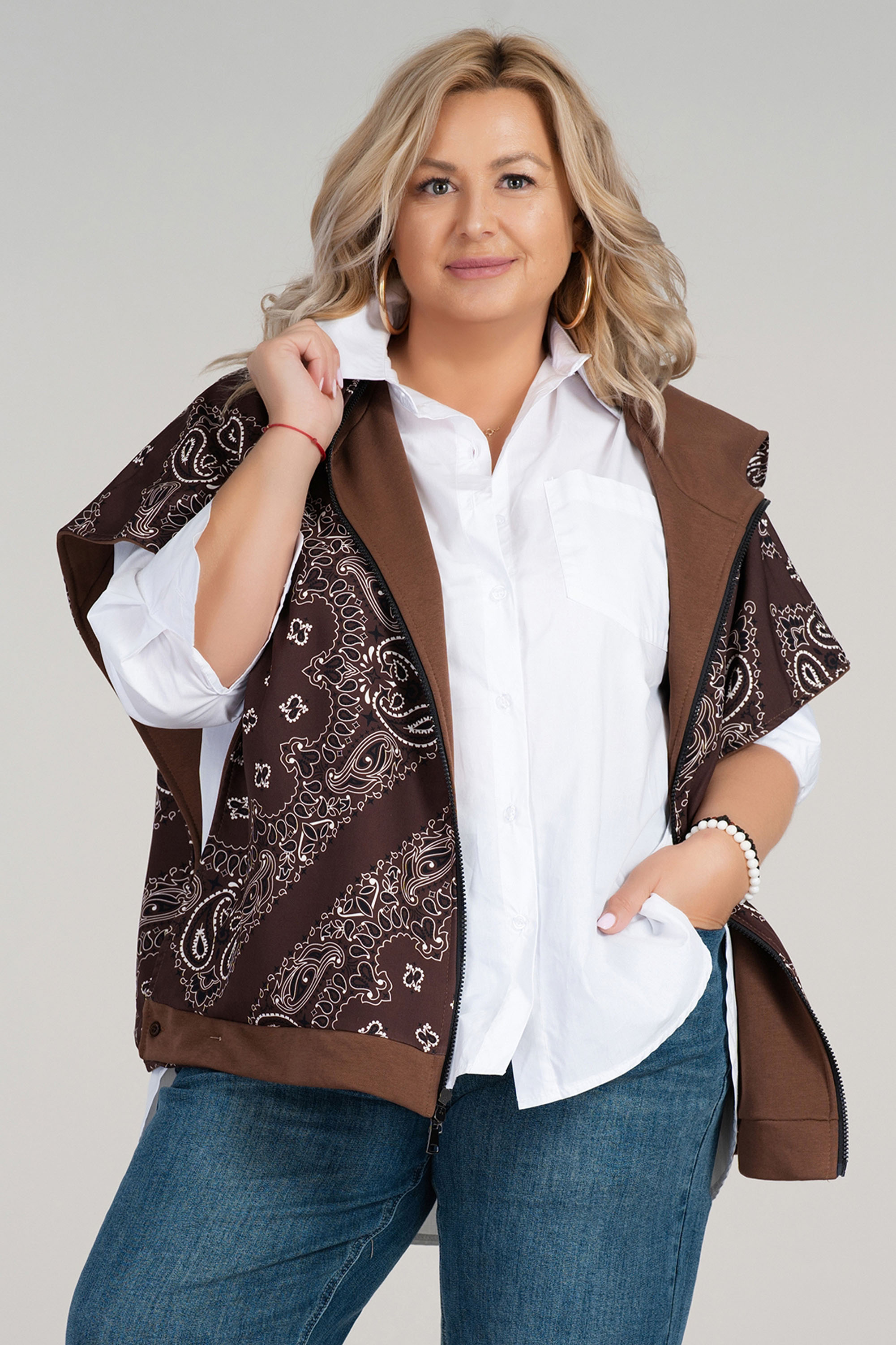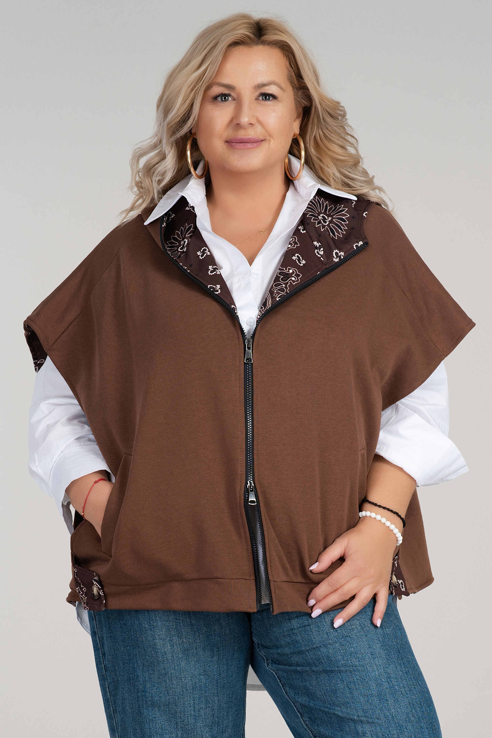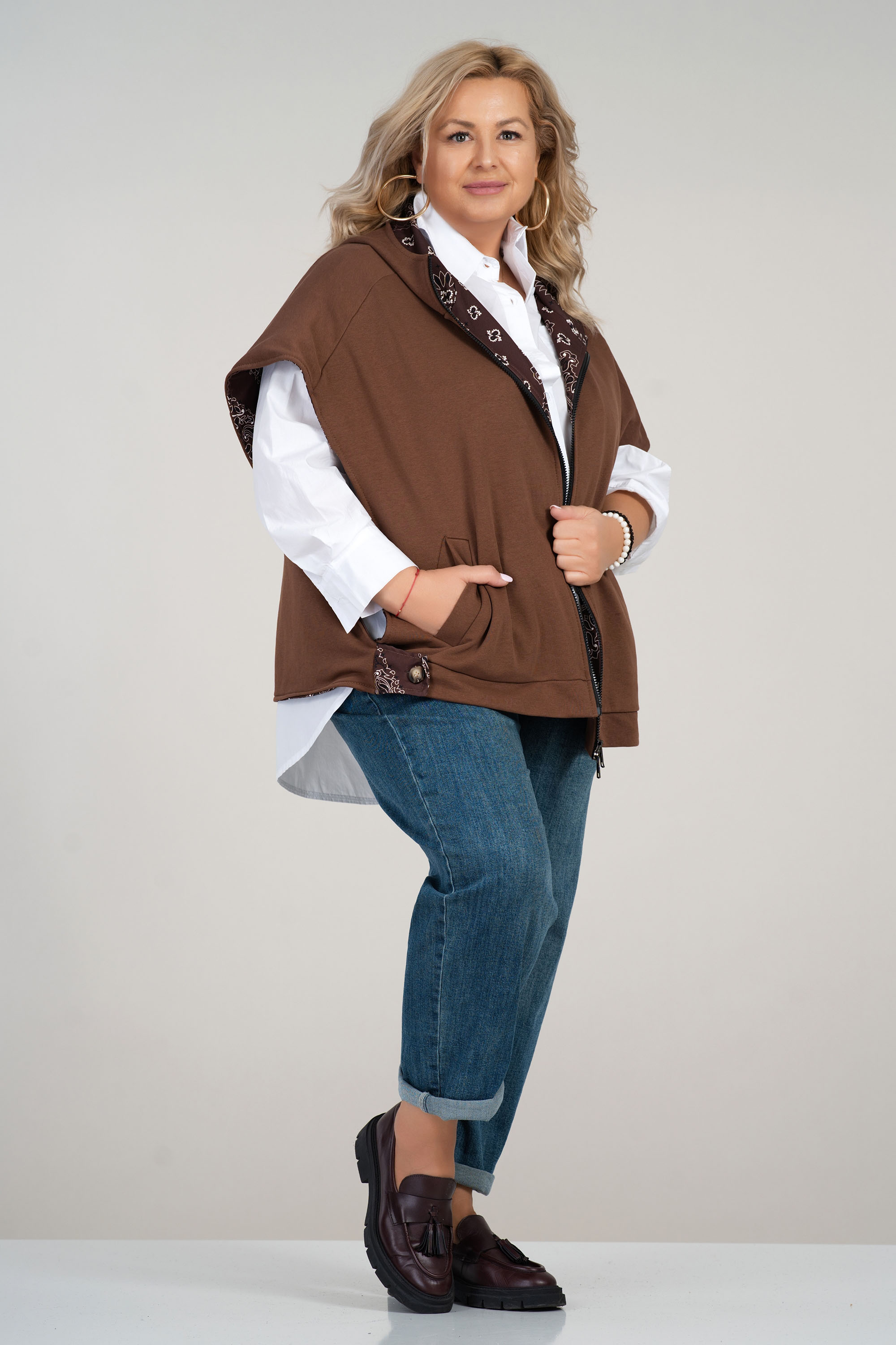 Макси елек в топъл кафяв нюанс, изработен от мека памучна материя с еластан за комфорт и лекота. Моделът е двулицев, с качулка и цип отпред, а декоративните принт елементи в бяло придават свеж акцент. Универсален избор за спортно-елегантни визии през преходните сезони.