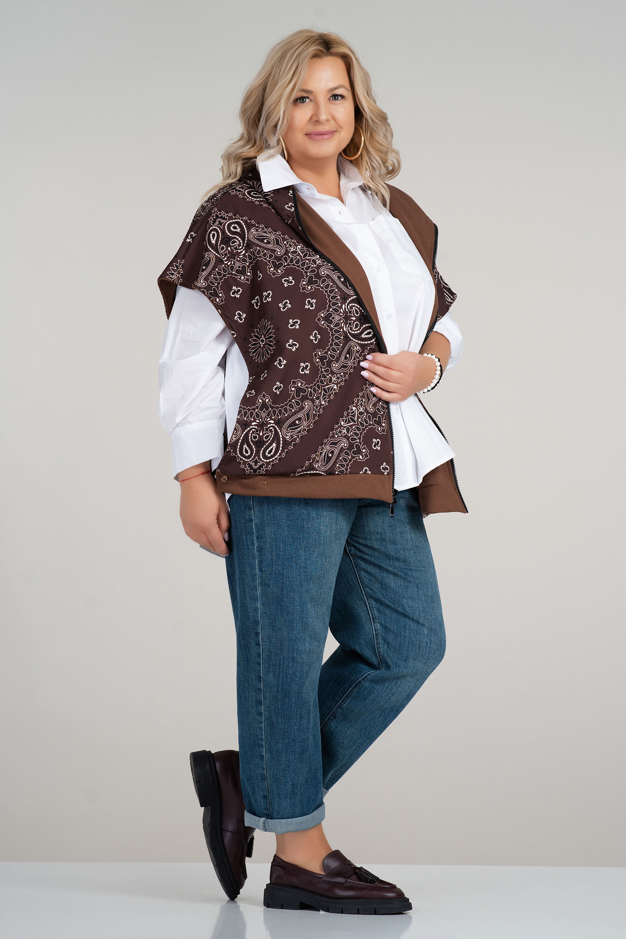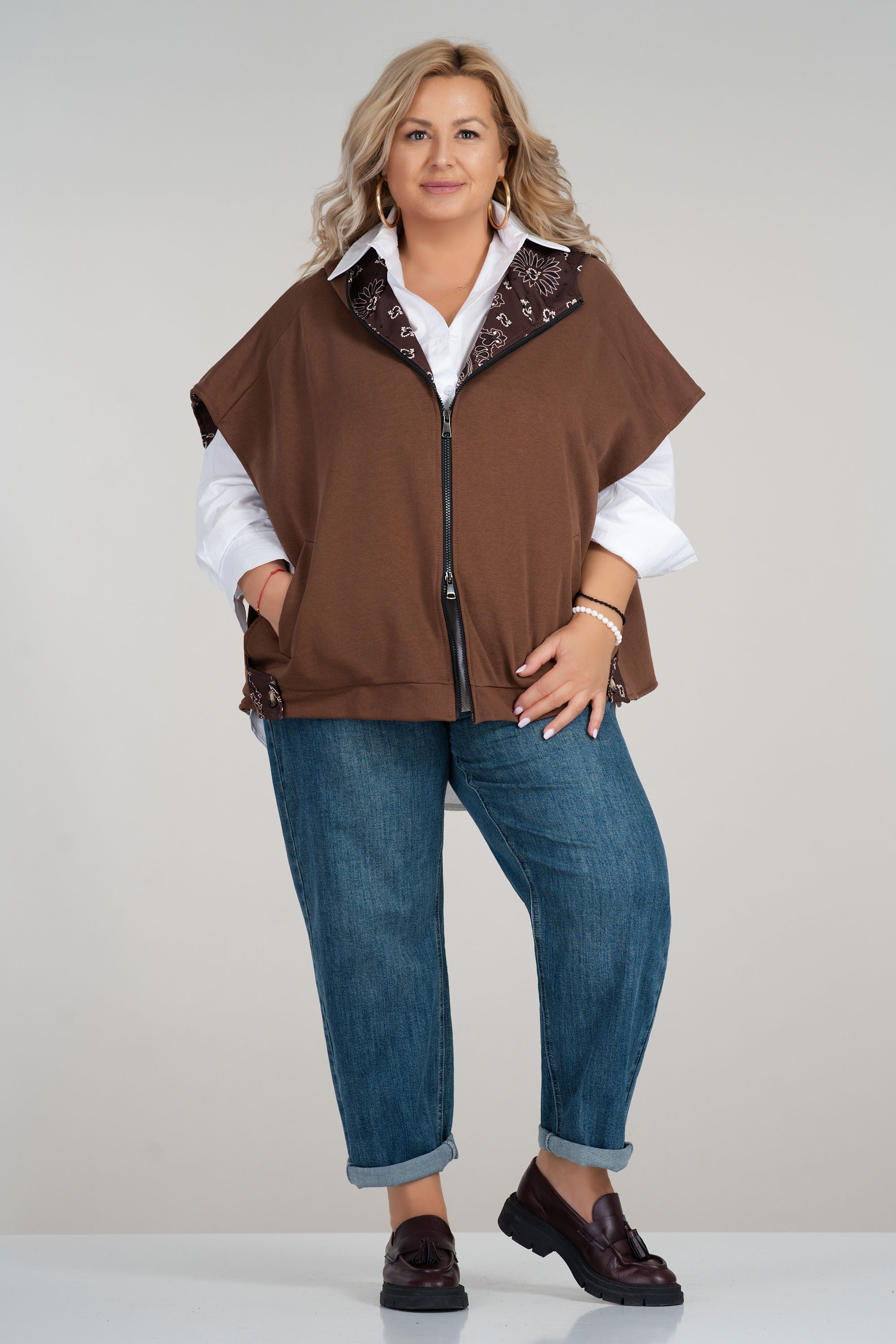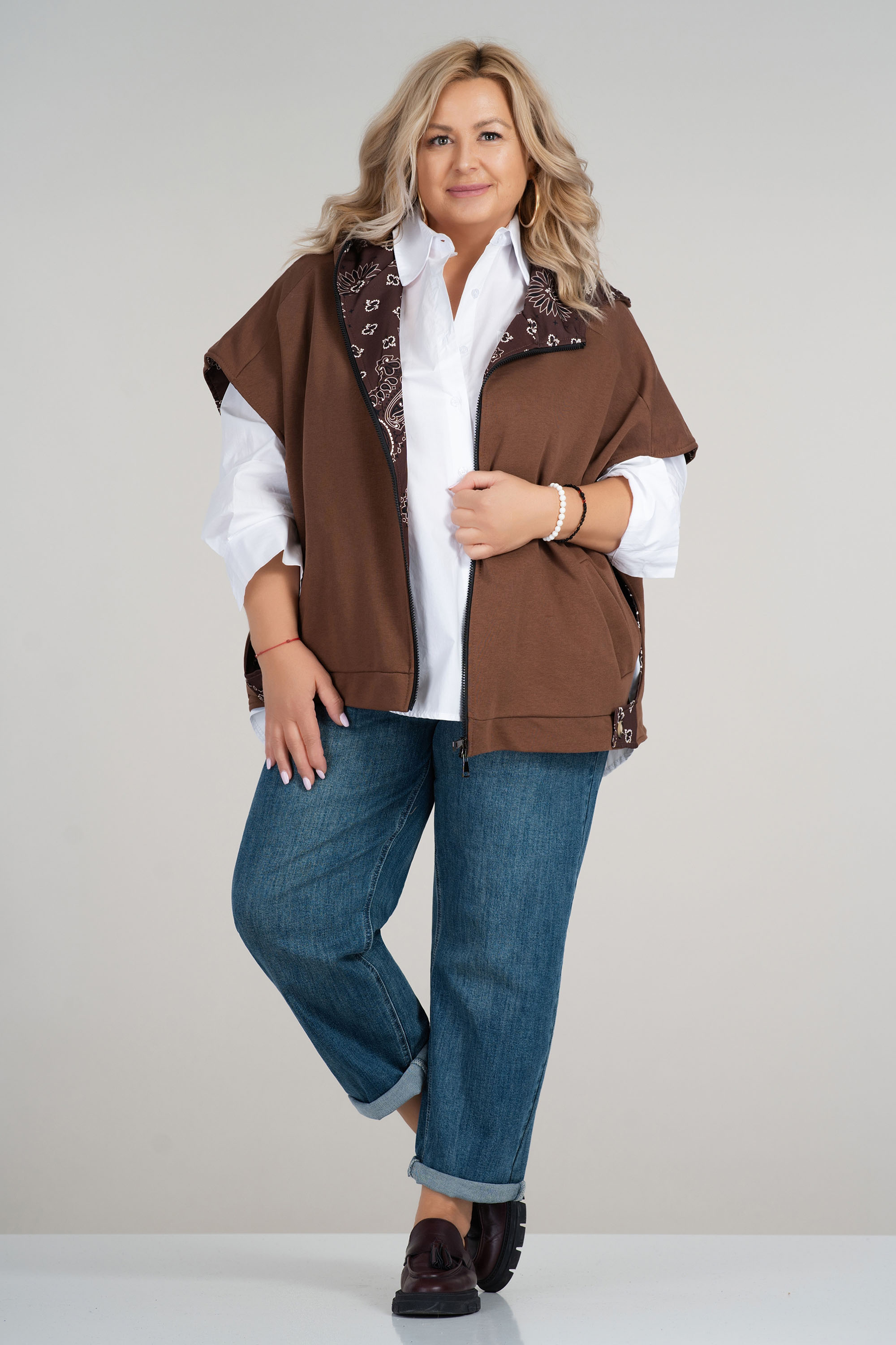 Макси елек в топъл кафяв нюанс, изработен от мека памучна материя с еластан за комфорт и лекота. Моделът е двулицев, с качулка и цип отпред, а декоративните принт елементи в бяло придават свеж акцент. Универсален избор за спортно-елегантни визии през преходните сезони.