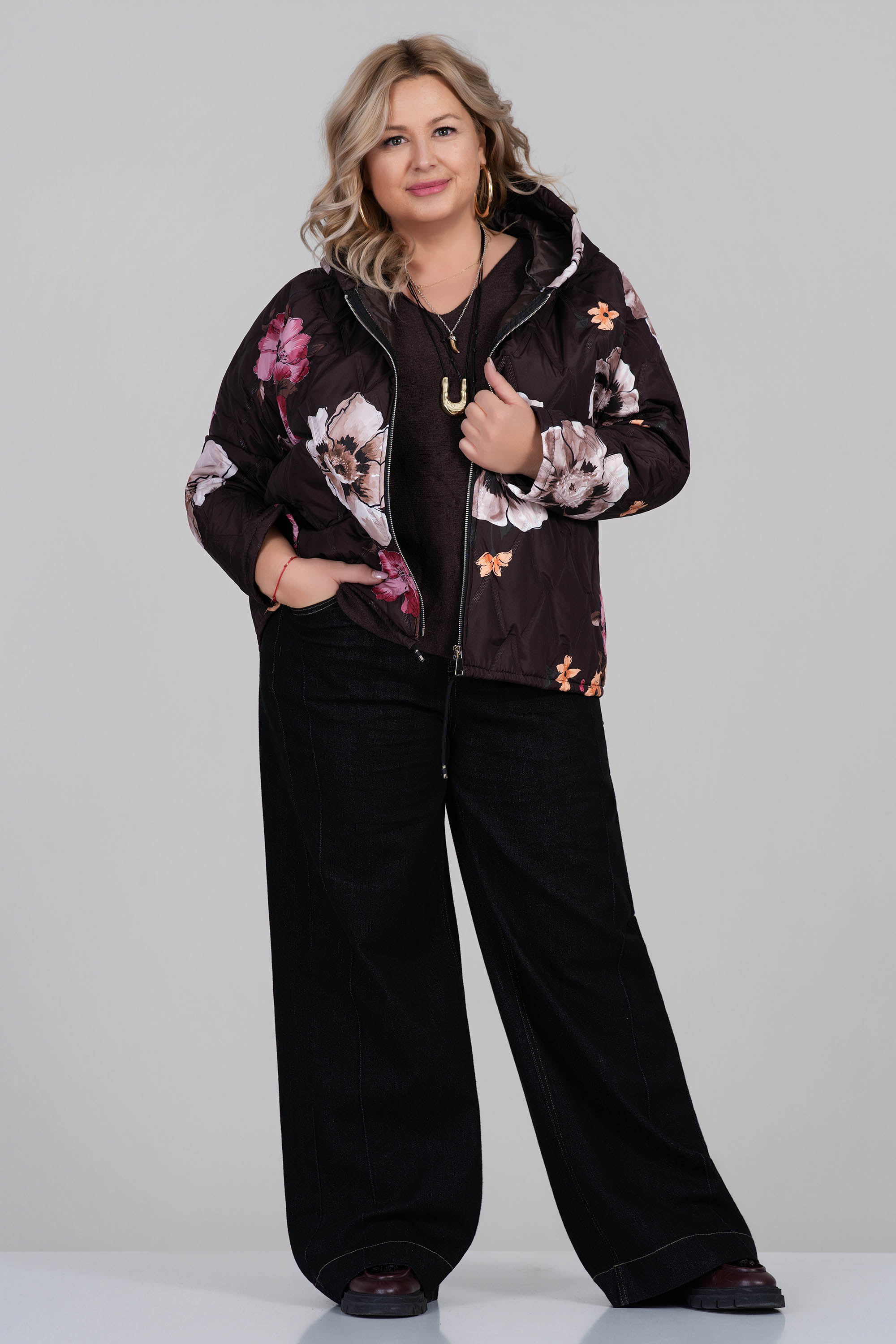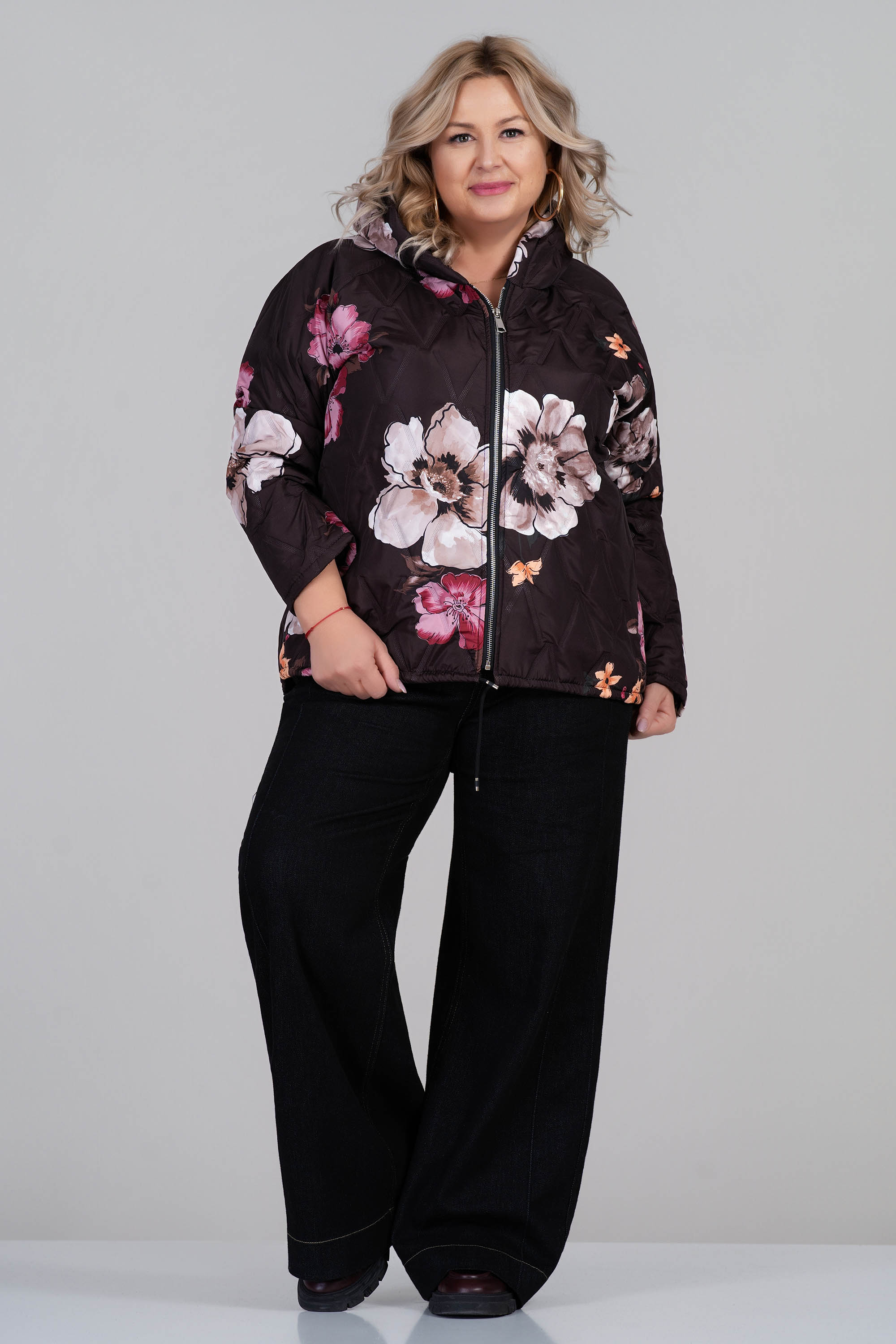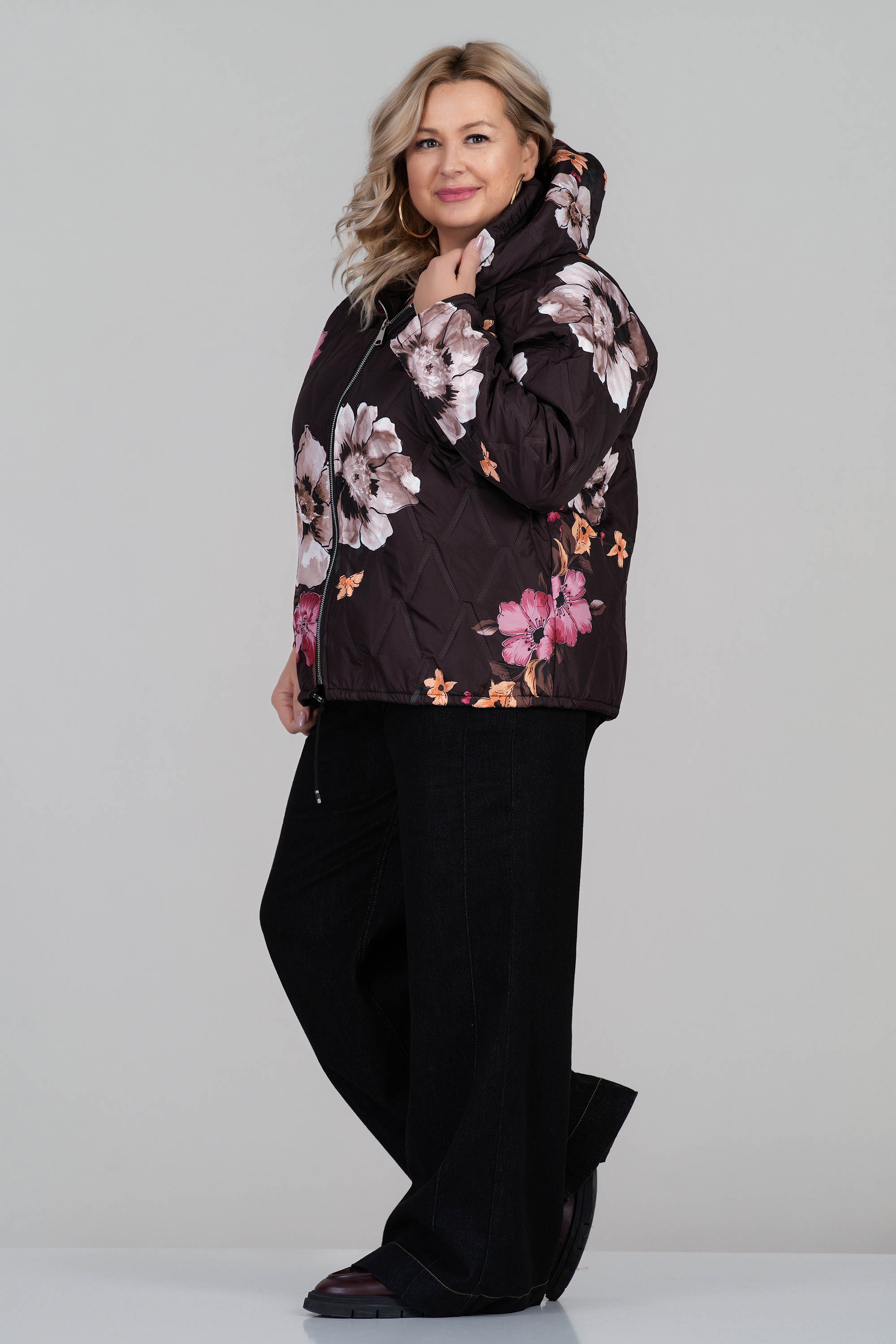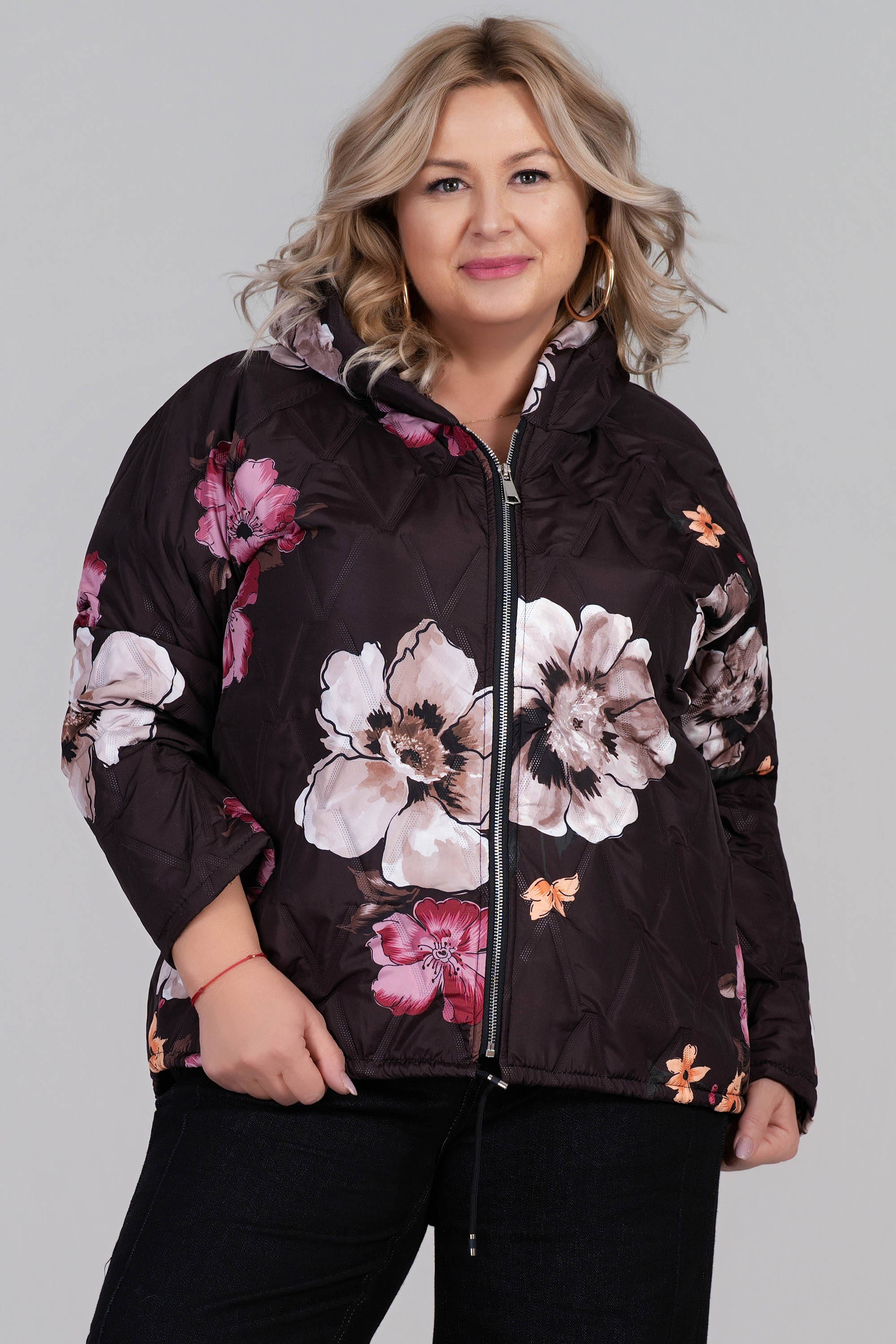 Това макси яке впечатлява със своя ефектен флорален десен в розово, зелено и бежово върху тъмнокафява основа. Леката капитонирана материя е подходяща за преходните сезони, а качулката и практичният цип осигуряват удобство при променливо време. Свободната кройка създава комфорт, като същевременно подчертава женствената визия. Това преходно яке комбинира функционалност и стил през променливите сезони.